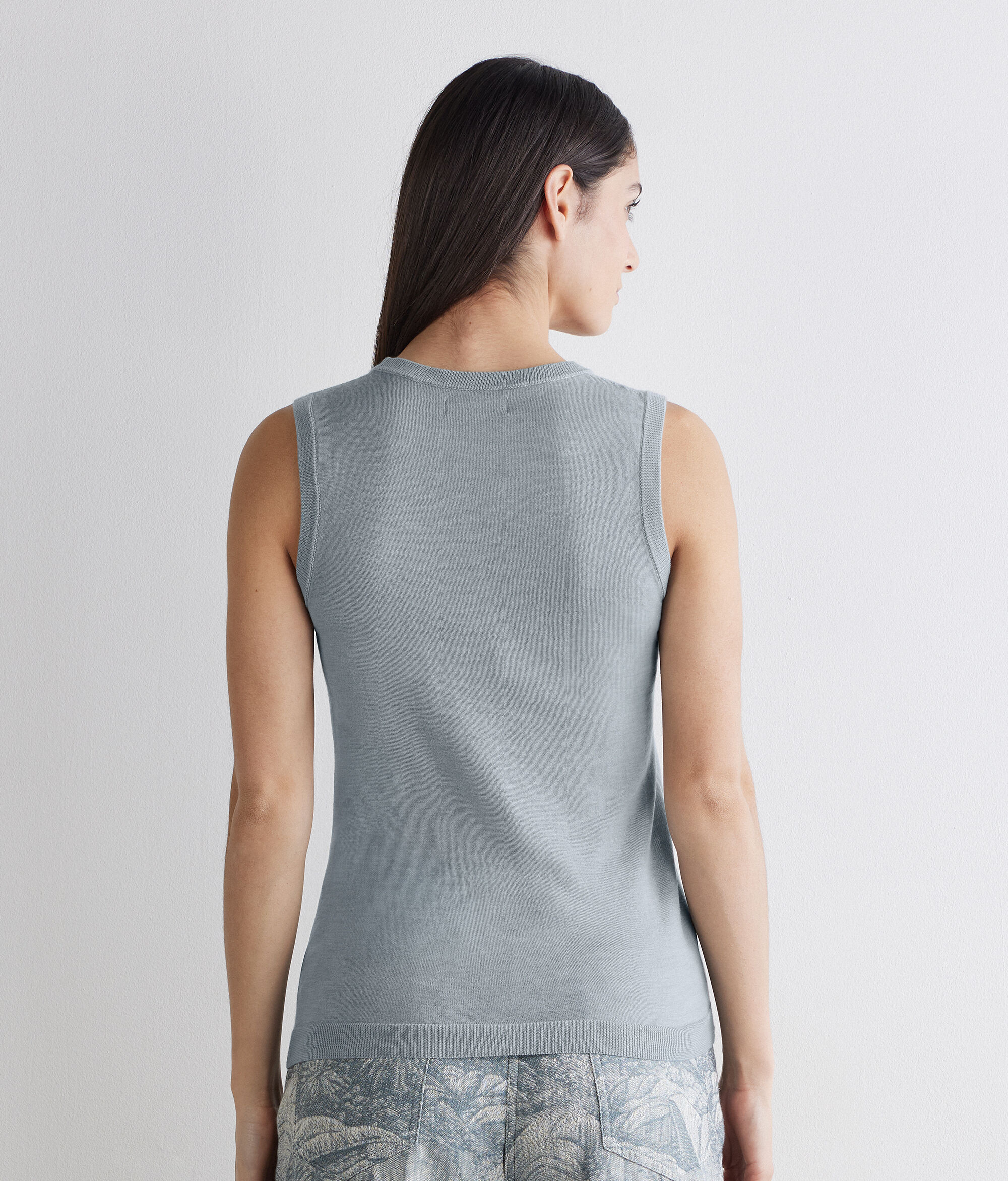 Tanktop aus ultraleichtem Kaschmir Airfine, einem Garn mit eleganter Transparenz, das Ergebnis eines Verfahrens, das seine Weichheit und Leichtigkeit hervorhebt und ihm von der ersten Berührung an ein spürbar zartes Gefühl verleiht. Die gerippten Abschlüsse entlang der Ränder sorgen für Charakter und besondere Details, während die schmale Passform die Figur betont und das Kleidungsstück ideal für anspruchsvolles Layering oder minimalistische Outfits mit Charakter macht.