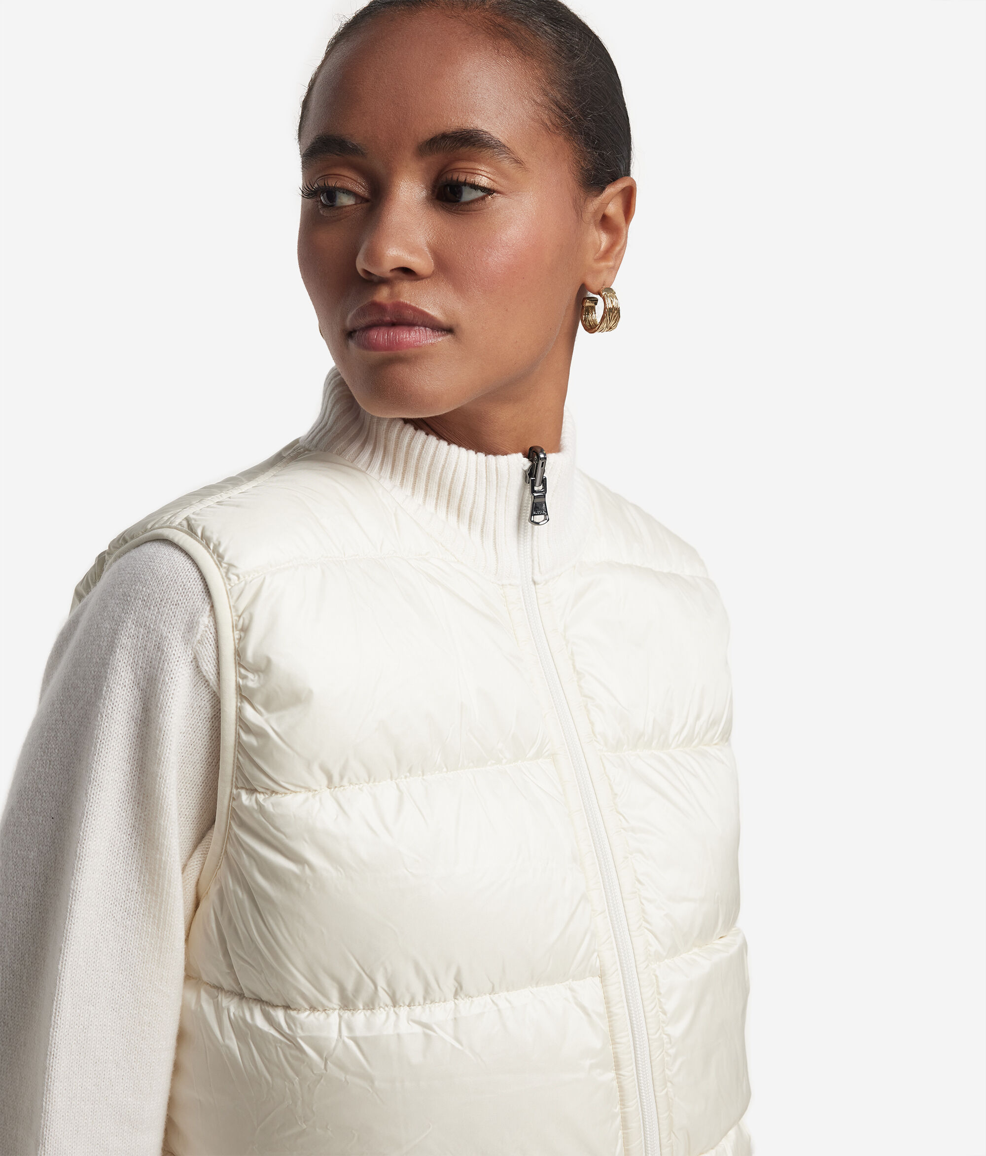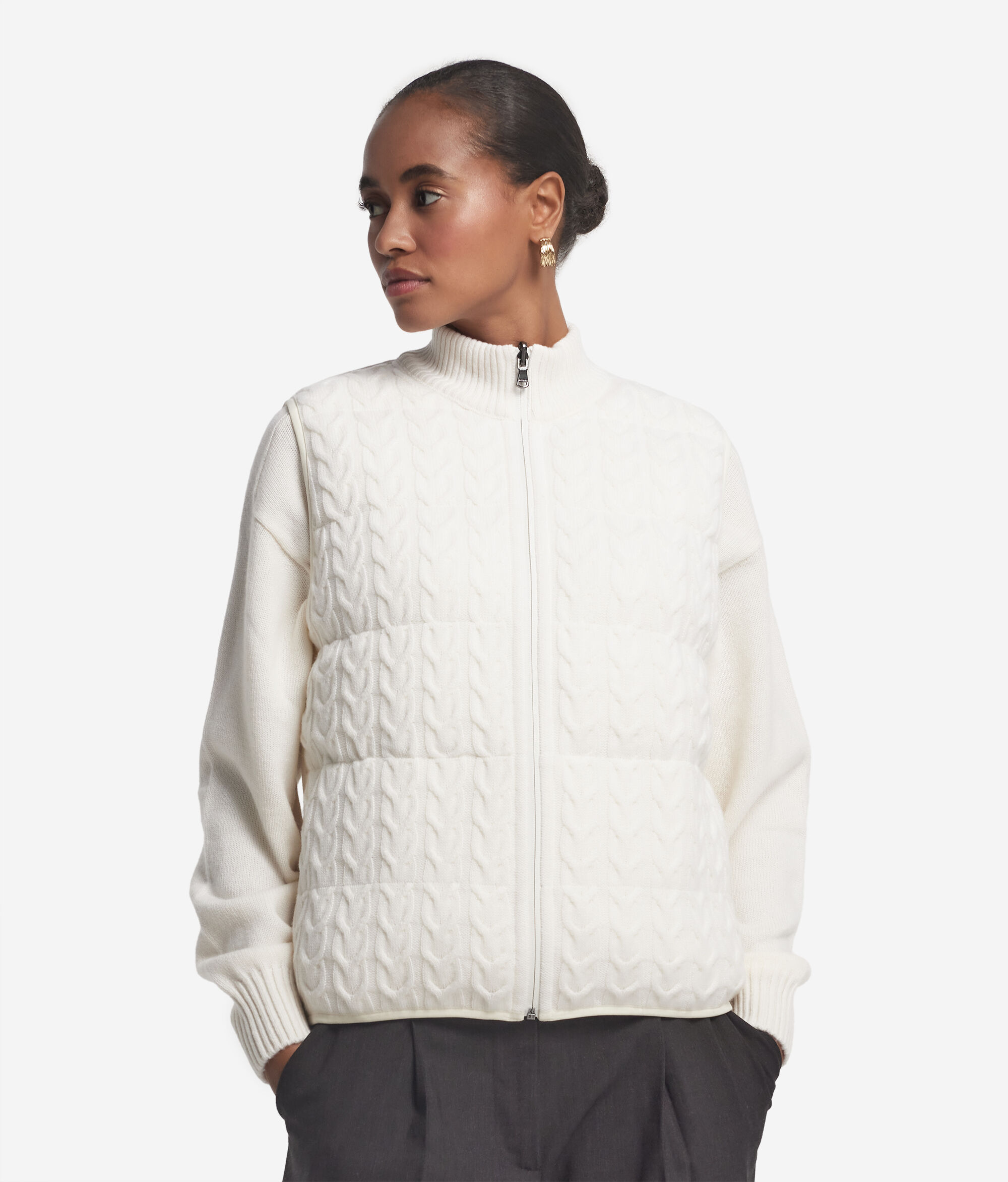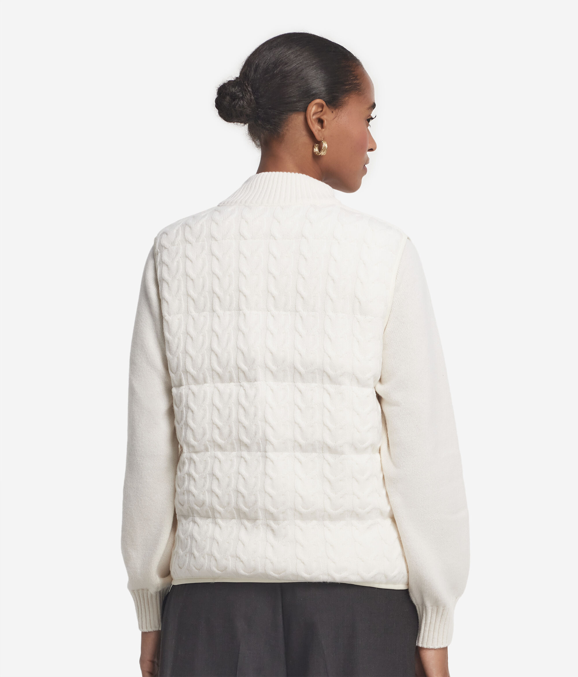 Die Daunenweste zum Wenden aus feinem Kaschmir Ultrasoft und Nylon zeichnet sich durch das vertikal verlaufende Zopfmuster aus, das dem Stoff Tiefe und Charakter verleiht. Der Reißverschluss aus Metall wird mit einem hohen Kragen aus Kaschmir Ultrasoft kombiniert, der für kuscheligen Komfort und zusätzlichen Schutz sorgt. Das hüftlange Kleidungsstück mit normaler Passform vereint Vielseitigkeit, Stil und Funktionalität in perfektem Gleichgewicht.