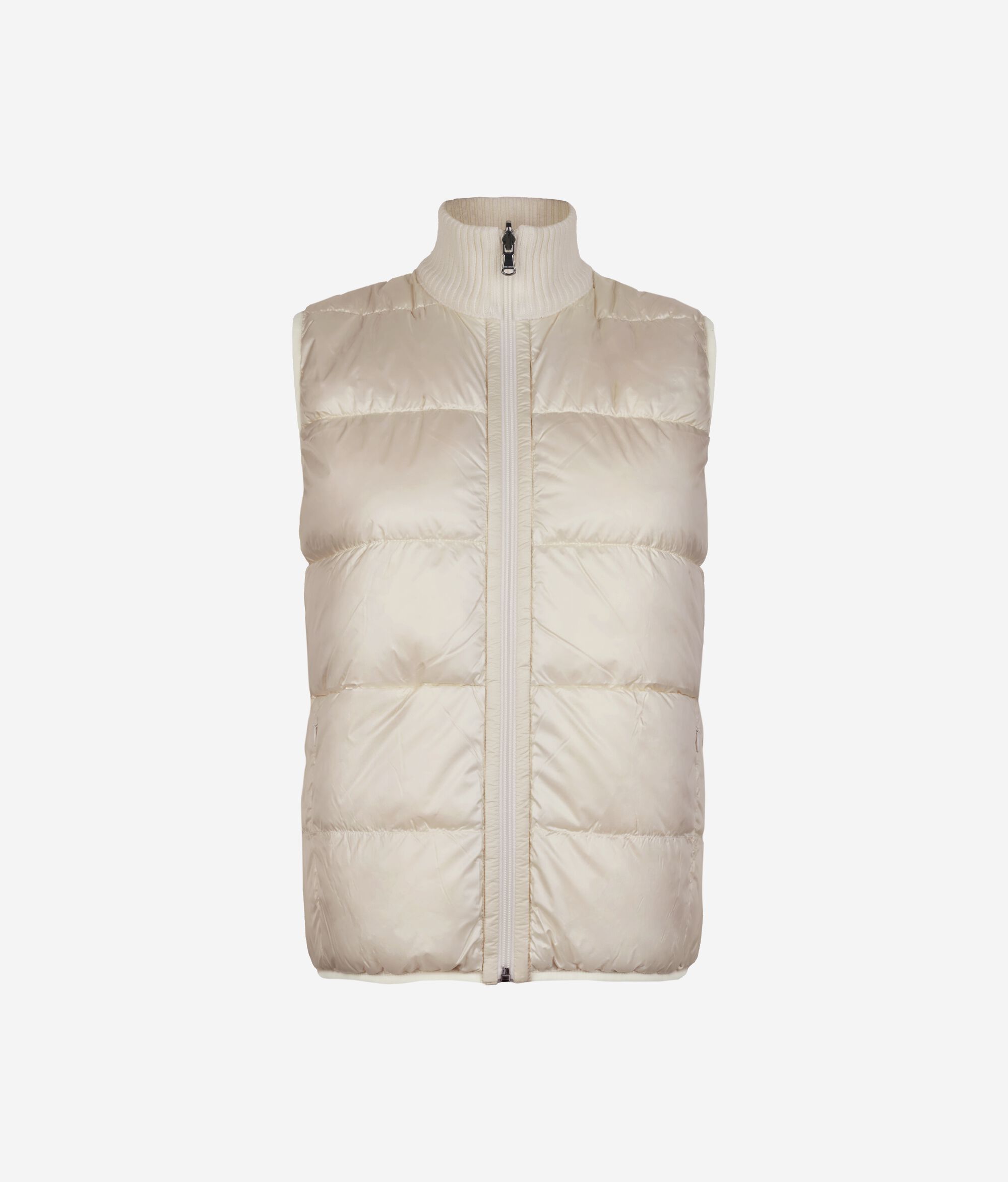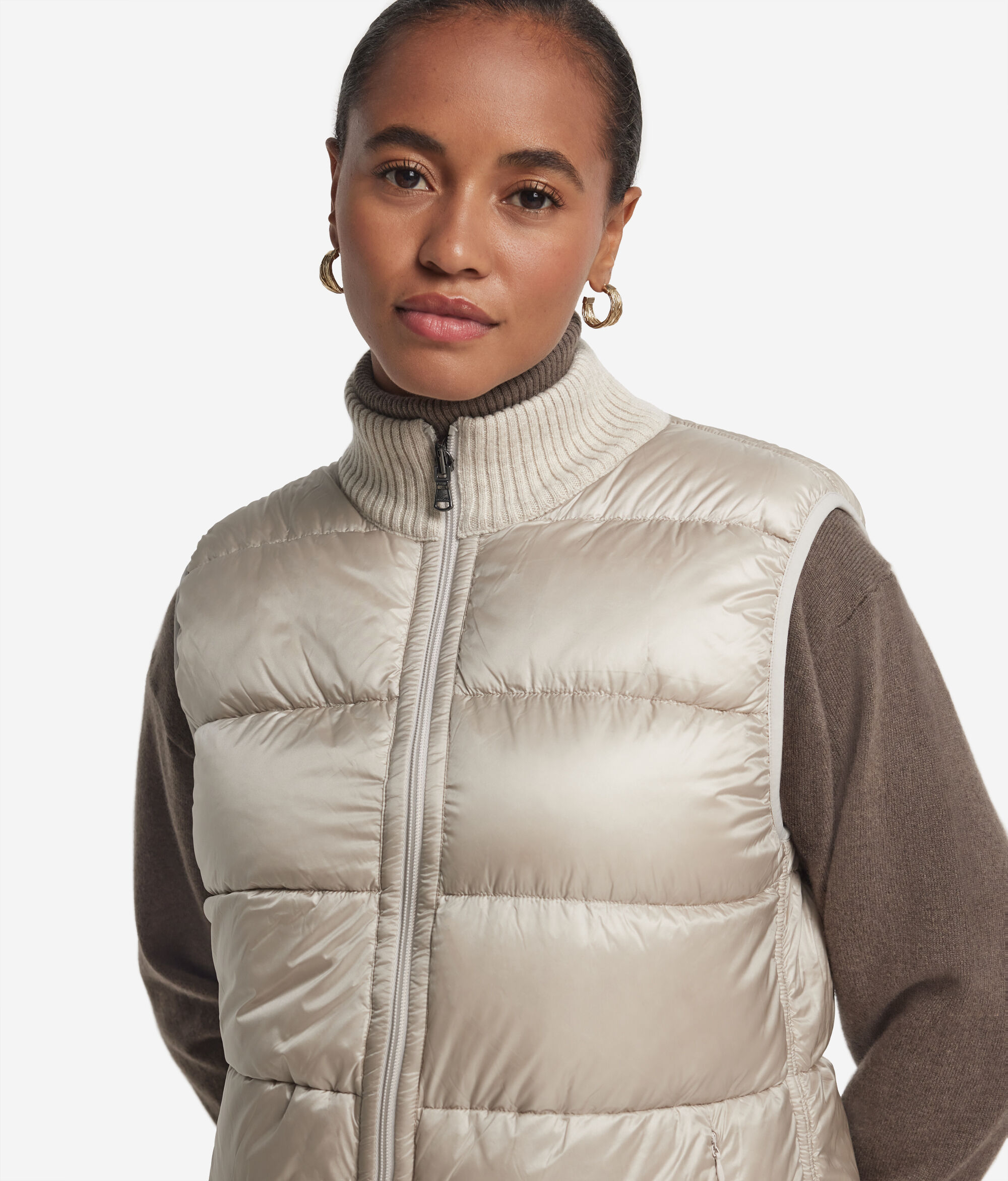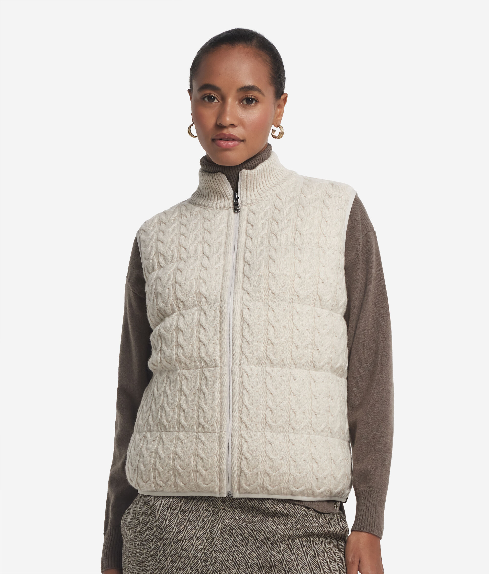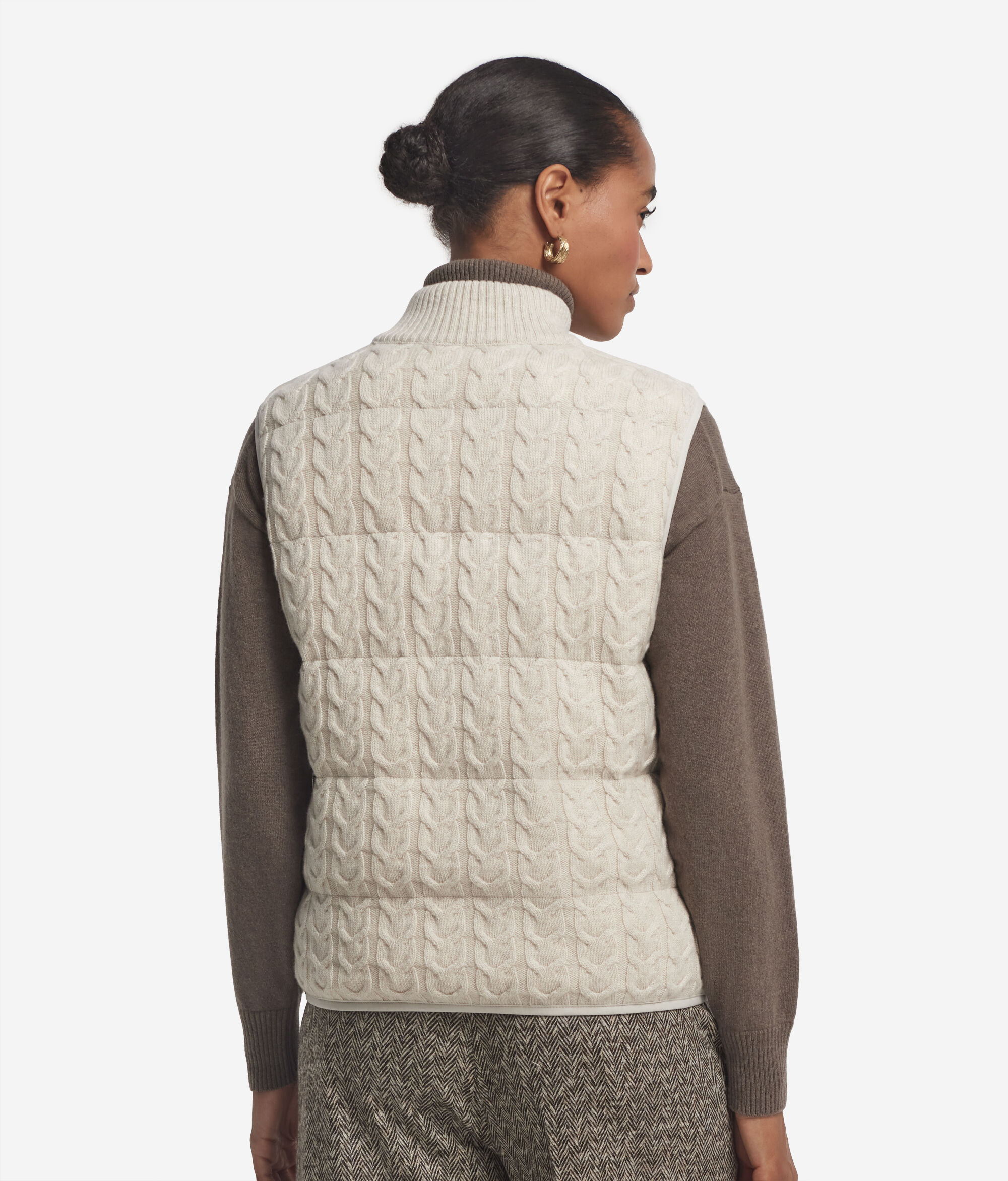 Die Daunenweste zum Wenden aus feinem Kaschmir Ultrasoft und Nylon zeichnet sich durch das vertikal verlaufende Zopfmuster aus, das dem Stoff Tiefe und Charakter verleiht. Der Reißverschluss aus Metall wird mit einem hohen Kragen aus Kaschmir Ultrasoft kombiniert, der für kuscheligen Komfort und zusätzlichen Schutz sorgt. Das hüftlange Kleidungsstück mit normaler Passform vereint Vielseitigkeit, Stil und Funktionalität in perfektem Gleichgewicht.