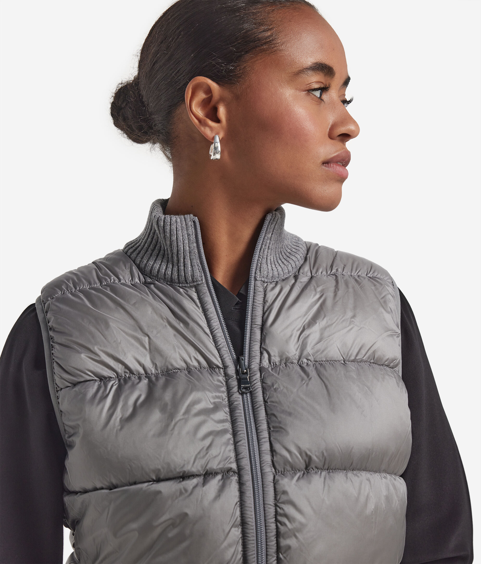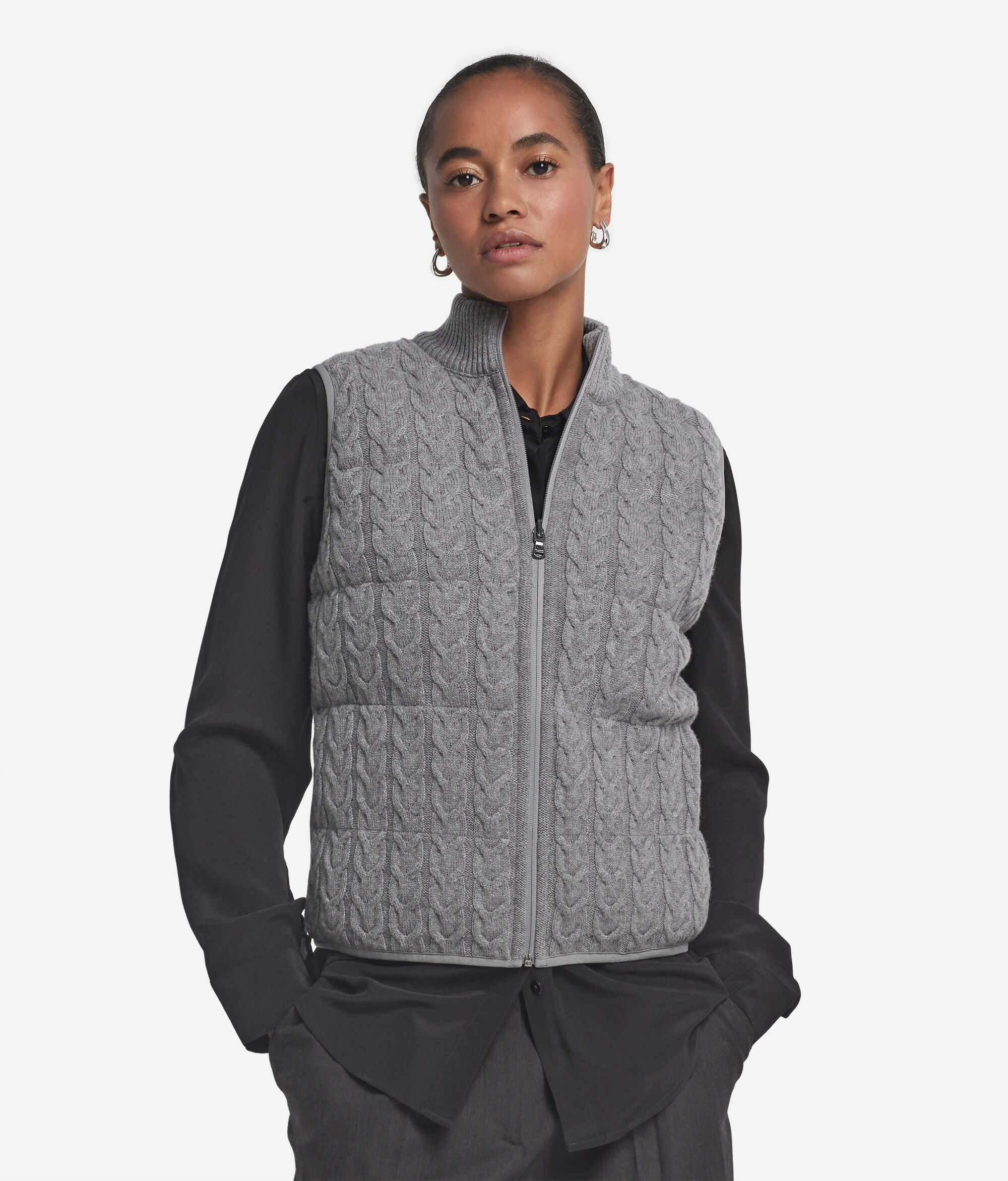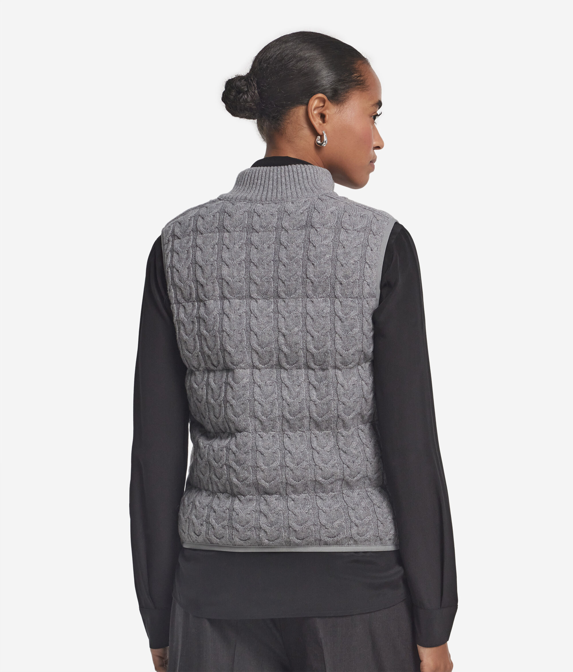 Die Daunenweste zum Wenden aus feinem Kaschmir Ultrasoft und Nylon zeichnet sich durch das vertikal verlaufende Zopfmuster aus, das dem Stoff Tiefe und Charakter verleiht. Der Reißverschluss aus Metall wird mit einem hohen Kragen aus Kaschmir Ultrasoft kombiniert, der für kuscheligen Komfort und zusätzlichen Schutz sorgt. Das hüftlange Kleidungsstück mit normaler Passform vereint Vielseitigkeit, Stil und Funktionalität in perfektem Gleichgewicht.