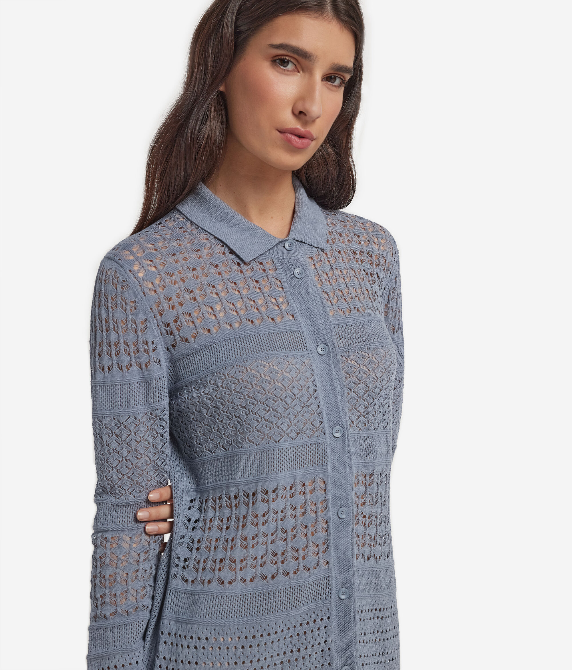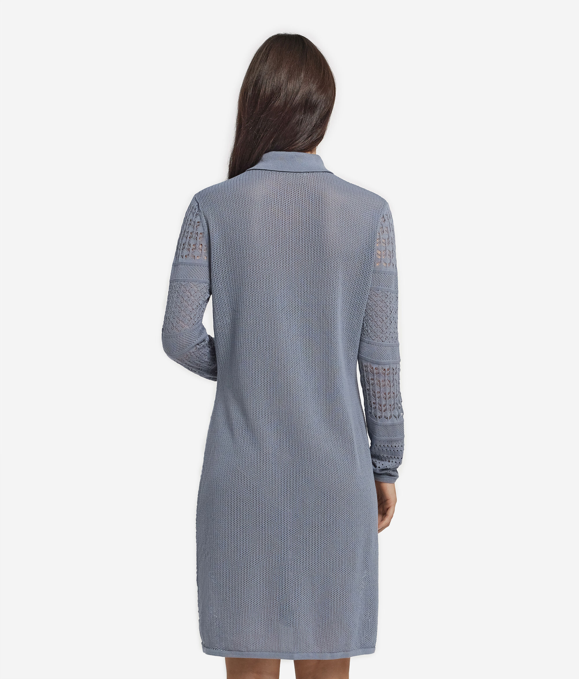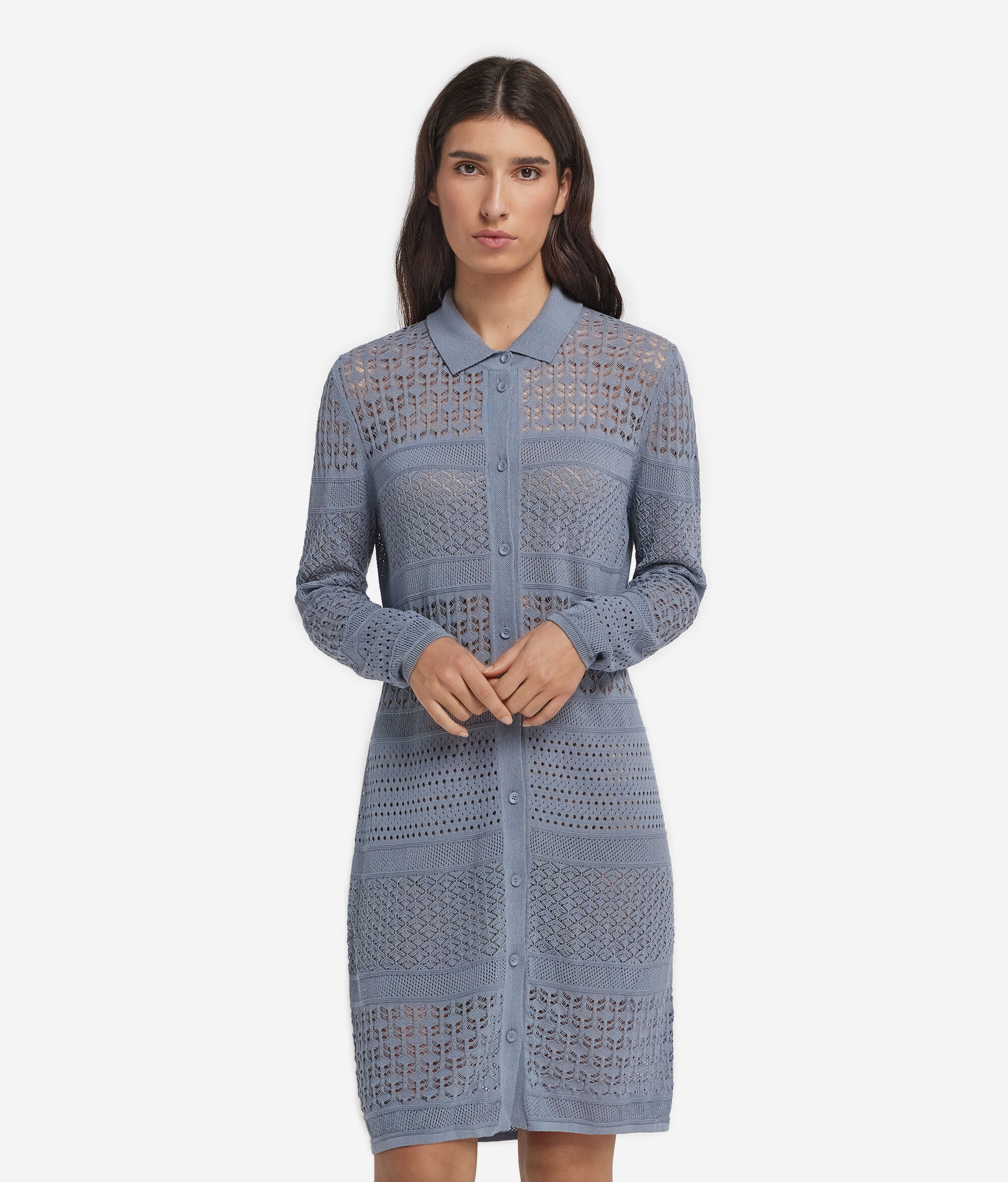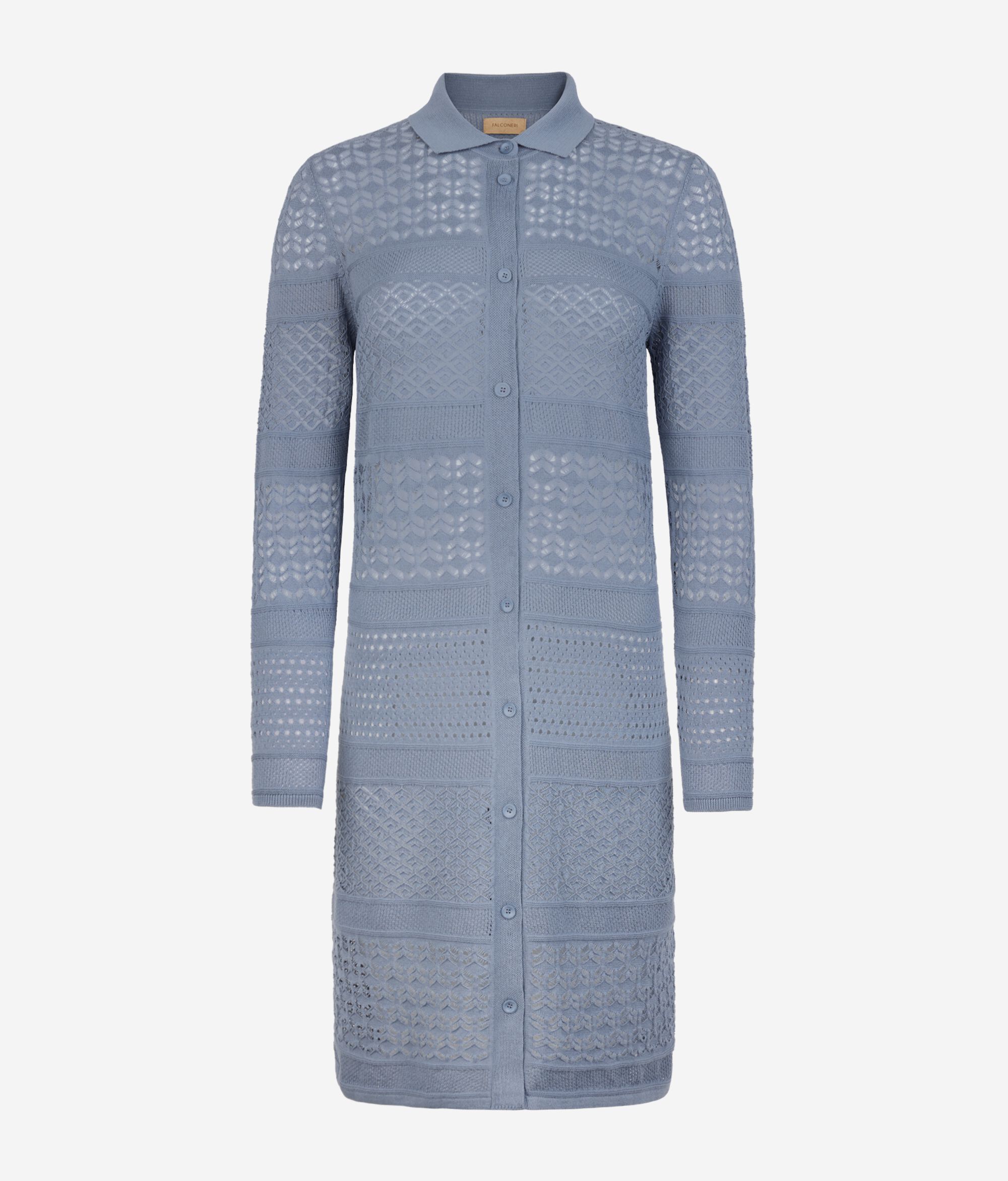 Dieses Hemdblusenkleid aus Baumwolle zeichnet sich aus durch die akkurate Lochstrickverarbeitung in Häkeloptik, die dem Kleidungsstück eine besondere und einzigartige Struktur verleiht. Das edle Gewebe harmoniert mit den schlichten Linien des Designs und erzeugt so eine elegante und gehobene Silhouette. Der besondere Kragen und die Knopfleiste über die gesamte Länge an der Vorderseite machen das Kleidungsstück komplett.