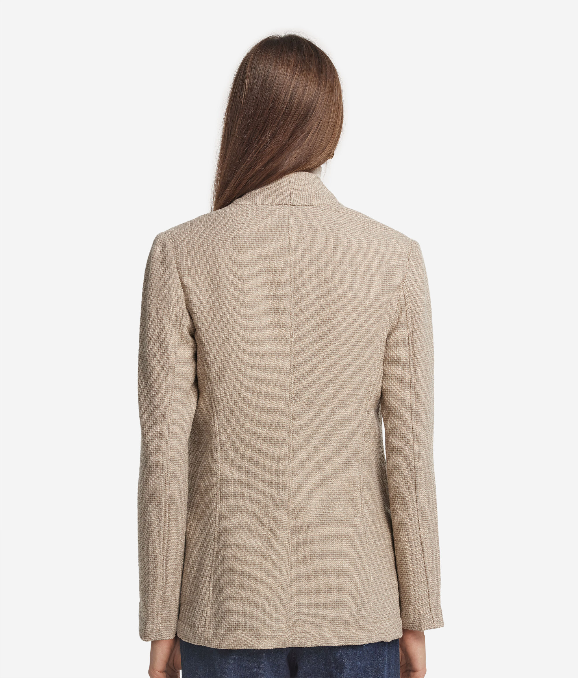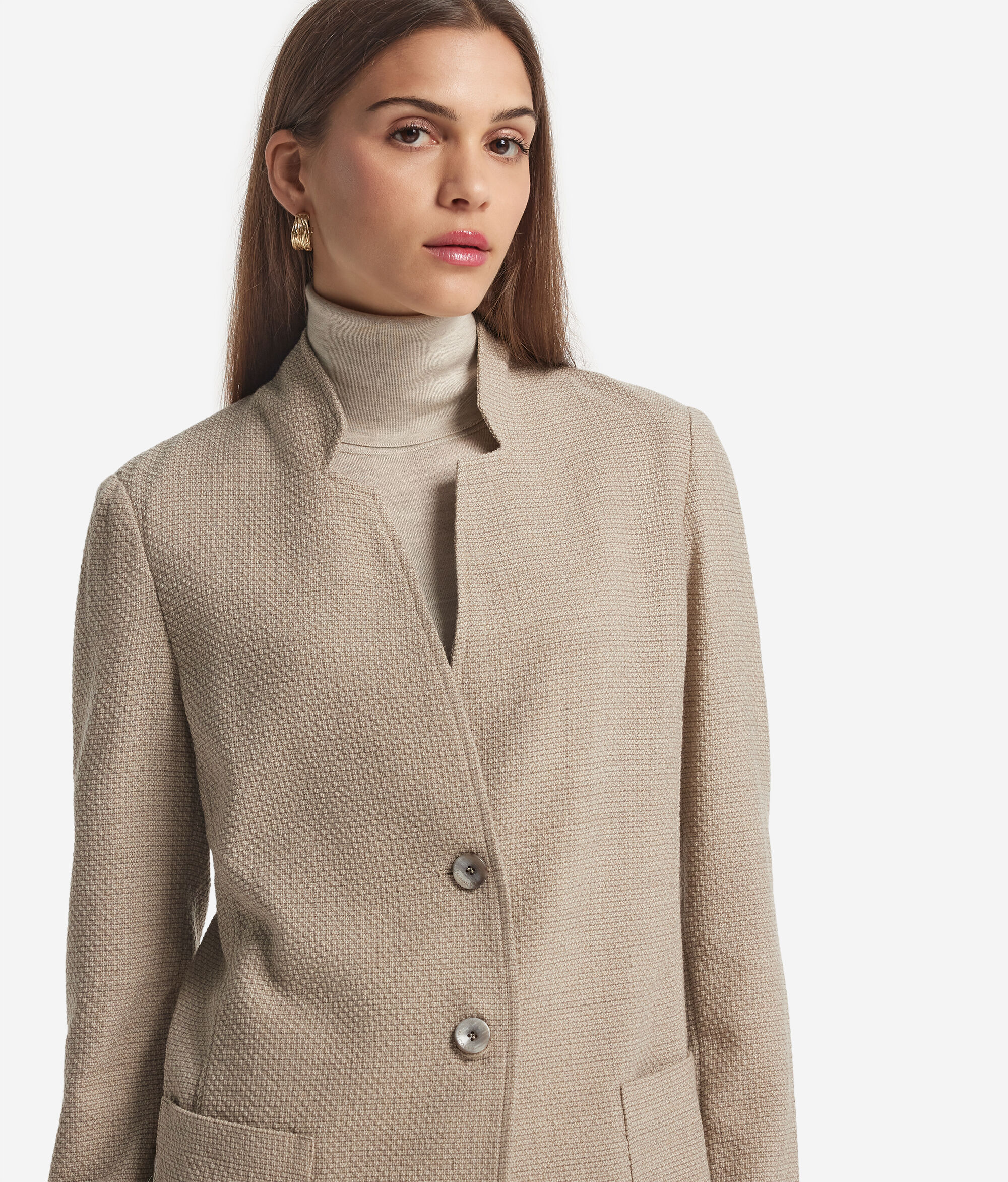 Dieser Blazer aus einem hochwertigen Wollstoff mit leichtem Stretchanteil vereint Struktur und Flexibilität. Er ist so konzipiert, dass er jeder Bewegung auf natürliche Weise folgt. Das klassische Revers, die normale Schulterpartie und eine schmale Passform erzeugen eine klare und dennoch ausdrucksstarke Linie. Die aufgesetzten Taschen sorgen für einen modernen Touch, während der einreihige Zwei-Knopfverschluss das Design dezent abrundet. Durch die Hüftlänge eignet er sich ideal für vielseitige Looks, von formell bis elegant-leger.