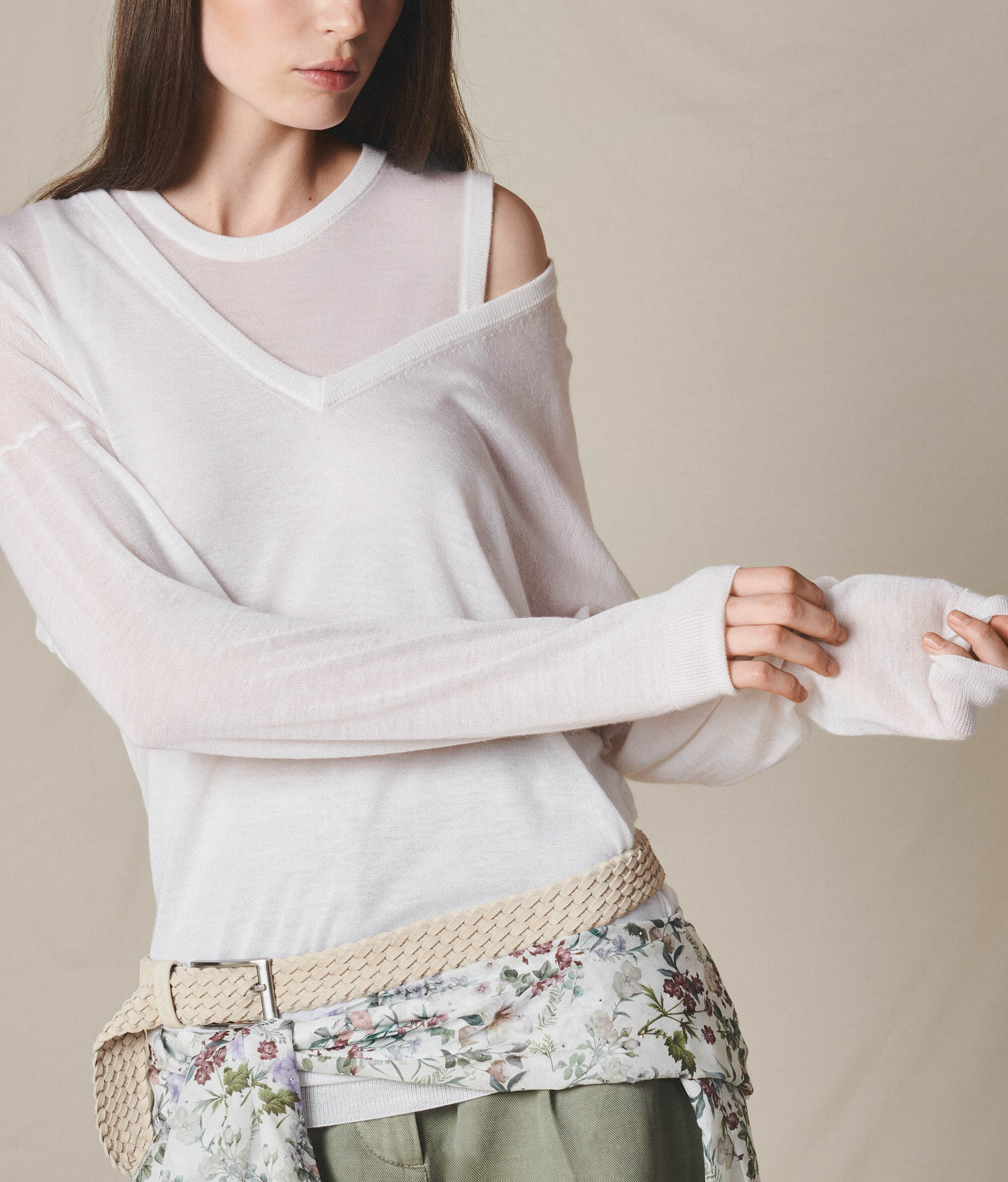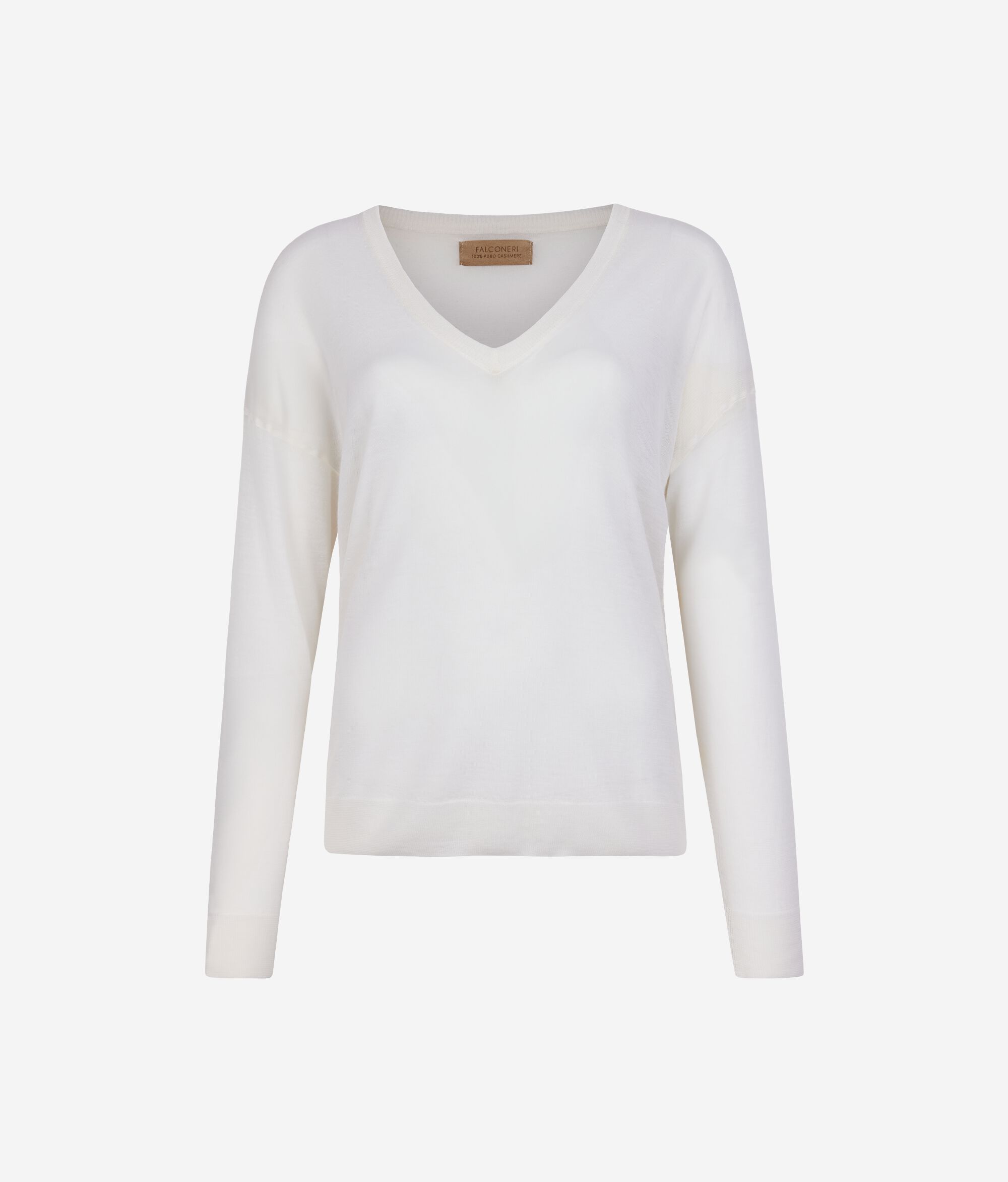 Pullover aus edlem Kaschmir Airfine, leicht und mit hauchzartem Griff, mit besonderer Transparenz, die dessen Weichheit betont. Die zart verhüllende Textur vermittelt von der ersten Berührung an ein Gefühl von Leichtigkeit. Das Kleidungsstück verfügt über einen doppelten V-Ausschnitt, der das Dekolleté betont, während die überschnittene Schulter und die lockere Passform eine moderne und harmonische Silhouette definieren.