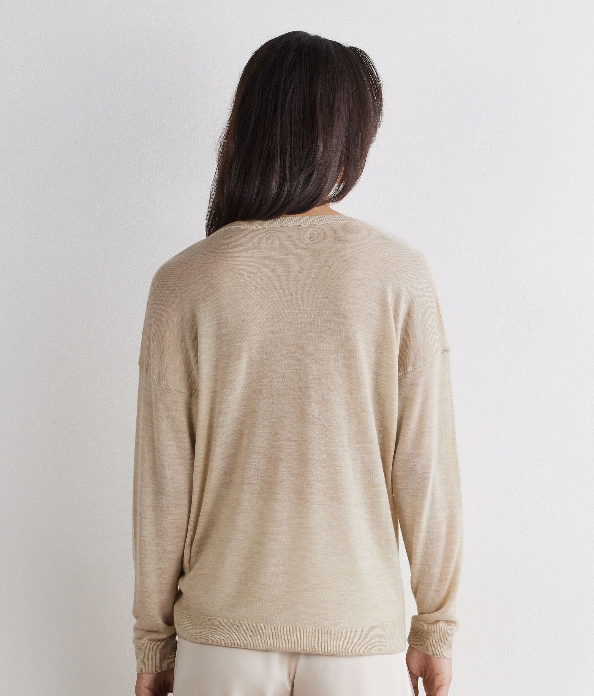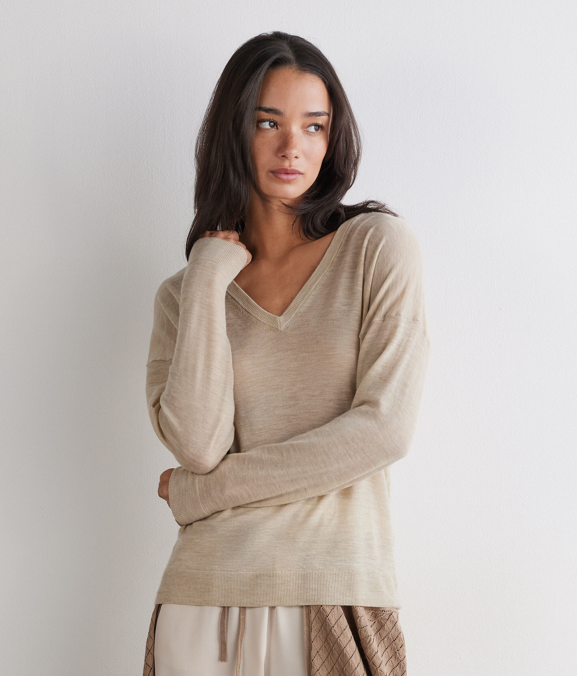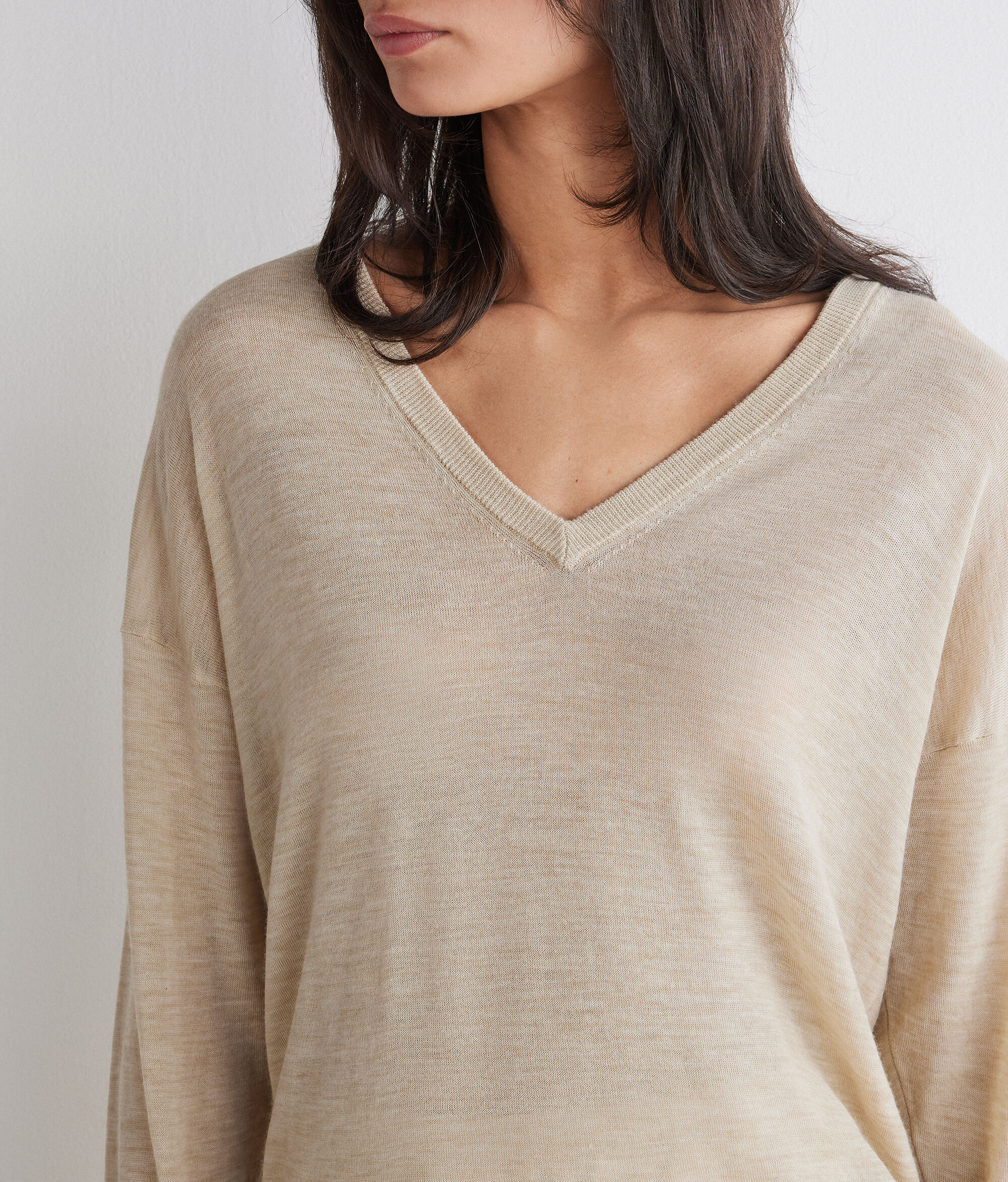 Pullover aus edlem Kaschmir Airfine, leicht und mit hauchzartem Griff, mit besonderer Transparenz, die dessen Weichheit betont. Die zart verhüllende Textur vermittelt von der ersten Berührung an ein Gefühl von Leichtigkeit. Das Kleidungsstück verfügt über einen doppelten V-Ausschnitt, der das Dekolleté betont, während die überschnittene Schulter und die lockere Passform eine moderne und harmonische Silhouette definieren.