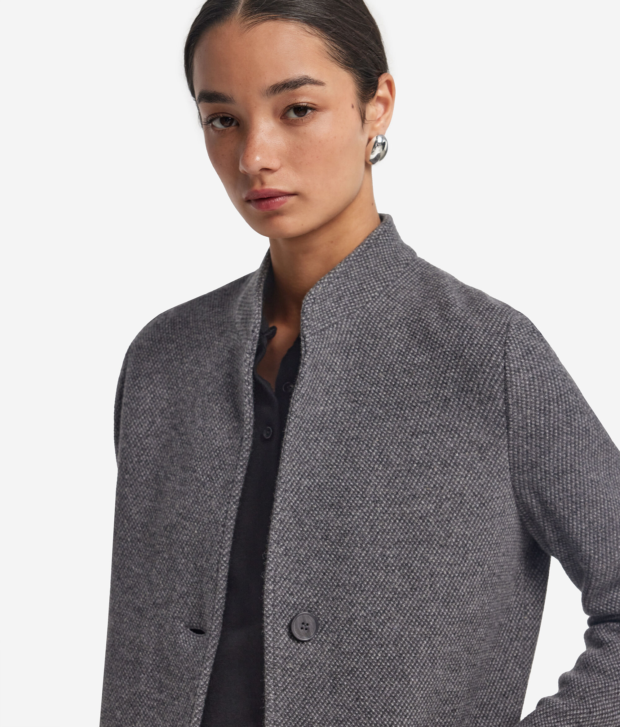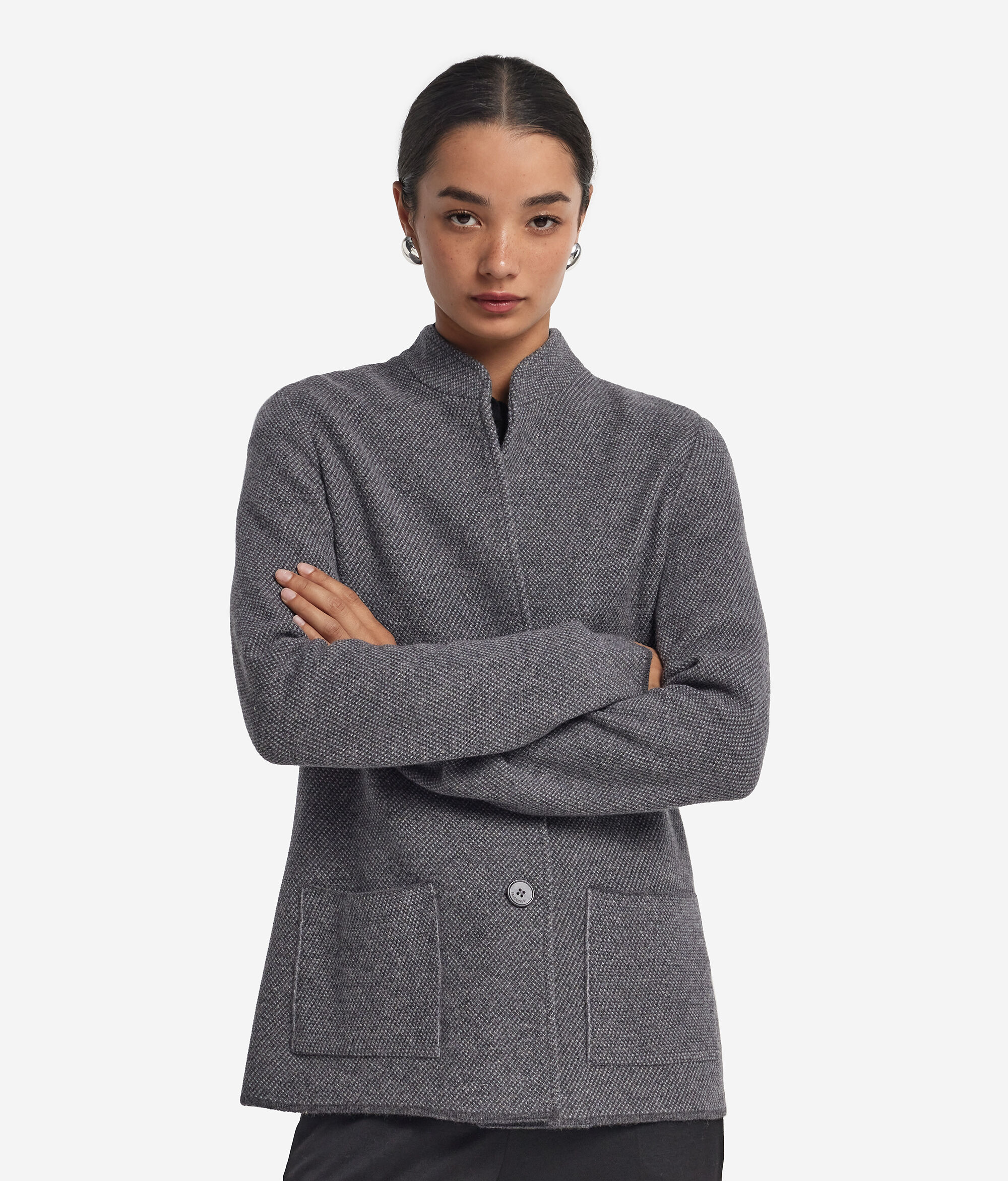 Diese aus Wolle und Kaschmir Ultrasoft gefertigter Blazer vereint Wärme und Raffinesse in einem Kleidungsstück mit weicher und anschmiegsamer Textur. Der Stehkragen und die einreihige Knopfleiste verleihen ihm eine schlichte Eleganz, während der zweifarbige Strick für einen Hauch Charakter sorgt. Der hüftlange Blazer mit normaler Schulterpartie und aufgesetzten Taschen bietet eine ausgewogene und vielseitige Passform.