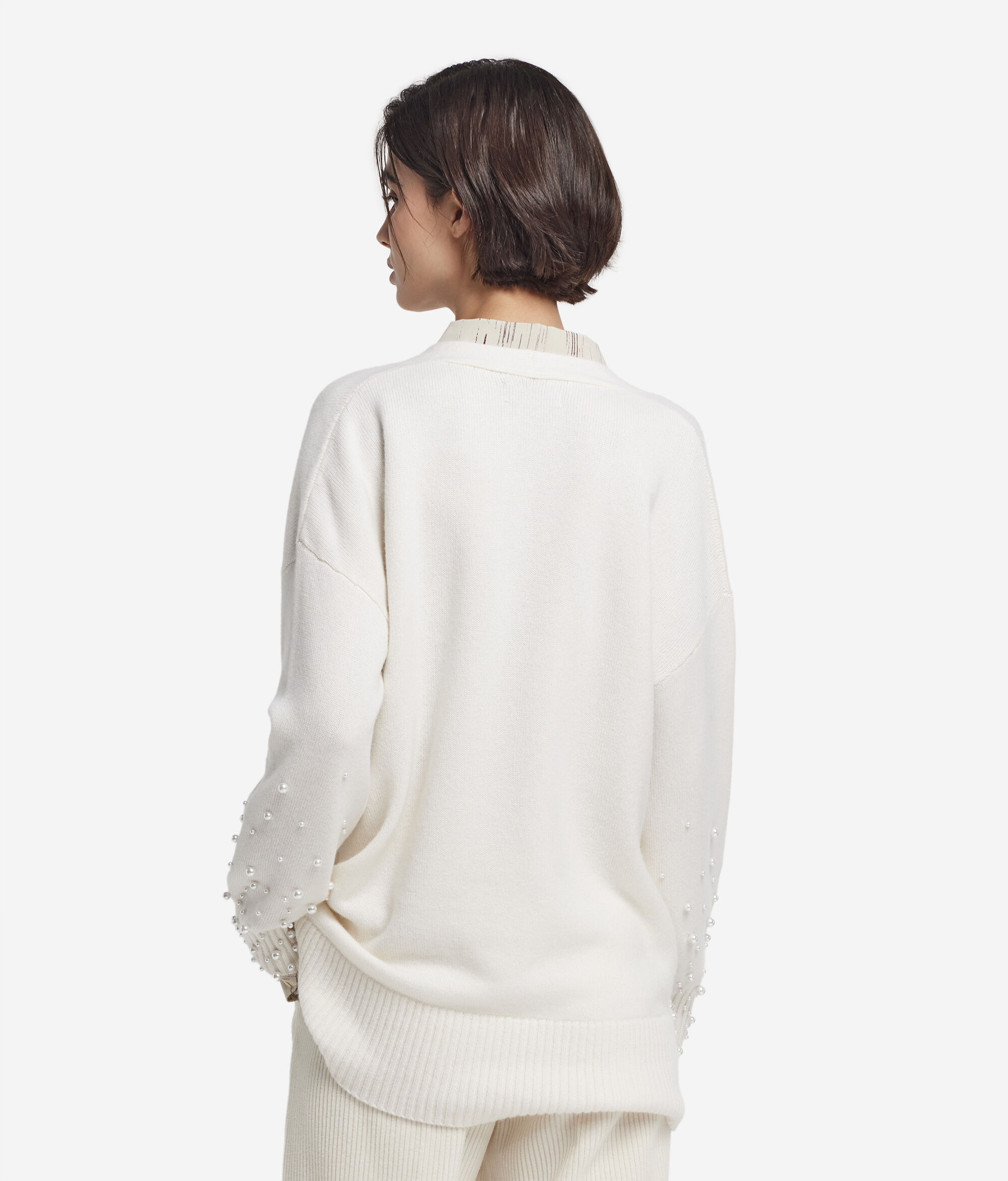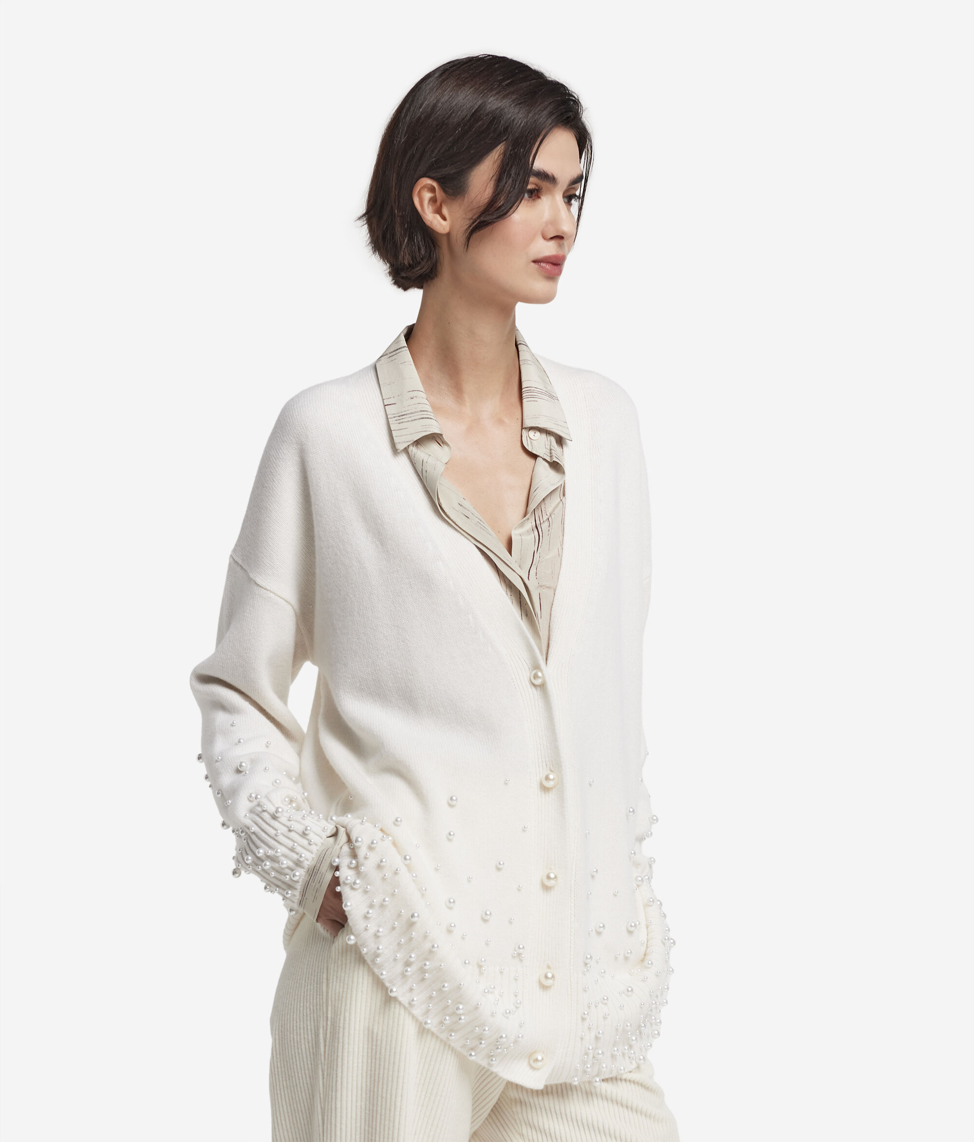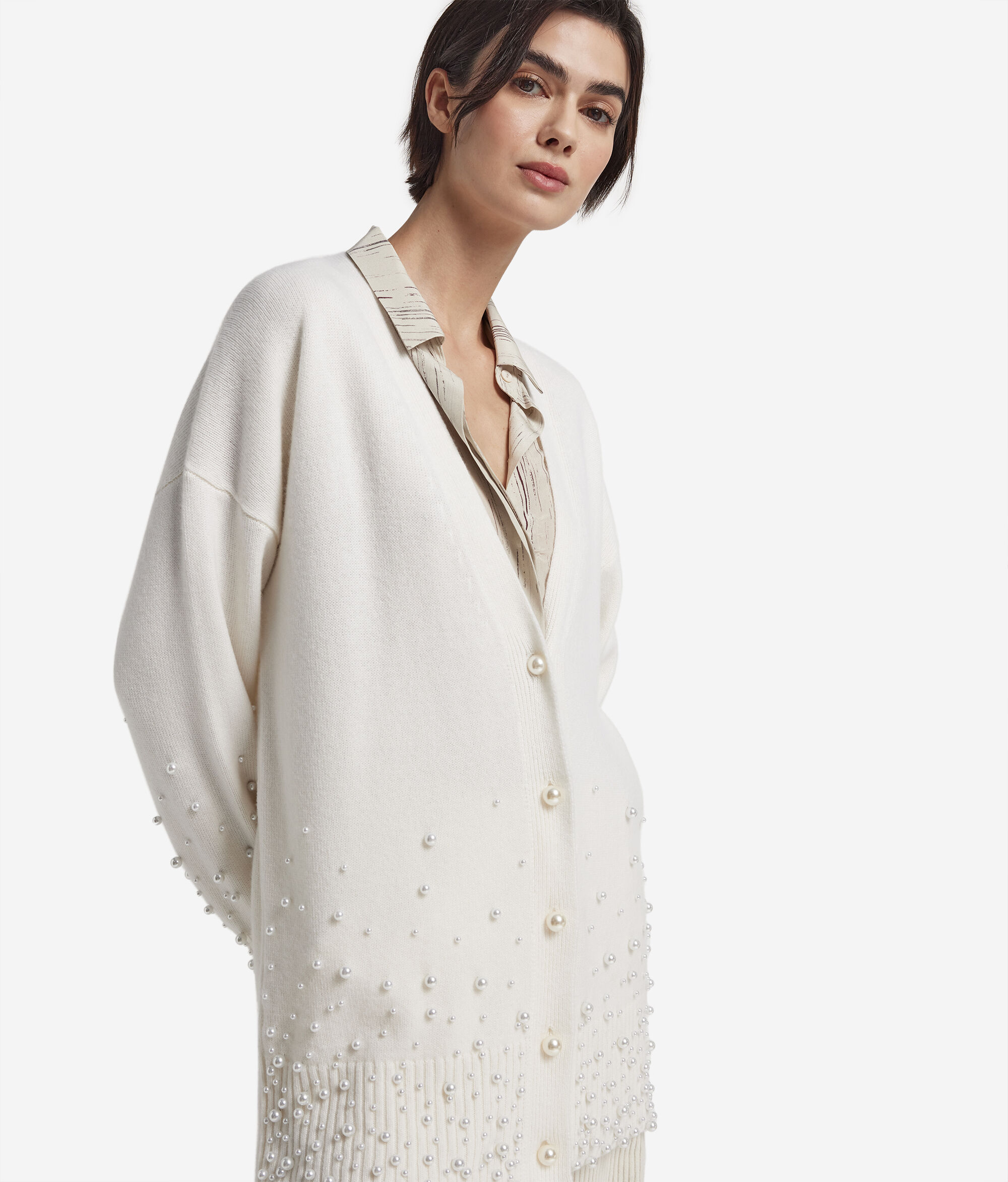 The quality of the yarn enhances the soft and feminine line of this Ultrasoft Cashmere cardigan. Gracefully adorning the hem and sleeves, the beads embellish the garment, transforming every gesture into a romantic detail. The front button fastening and the ribbed finish complete the garment, giving it character and defining the silhouette effortlessly.