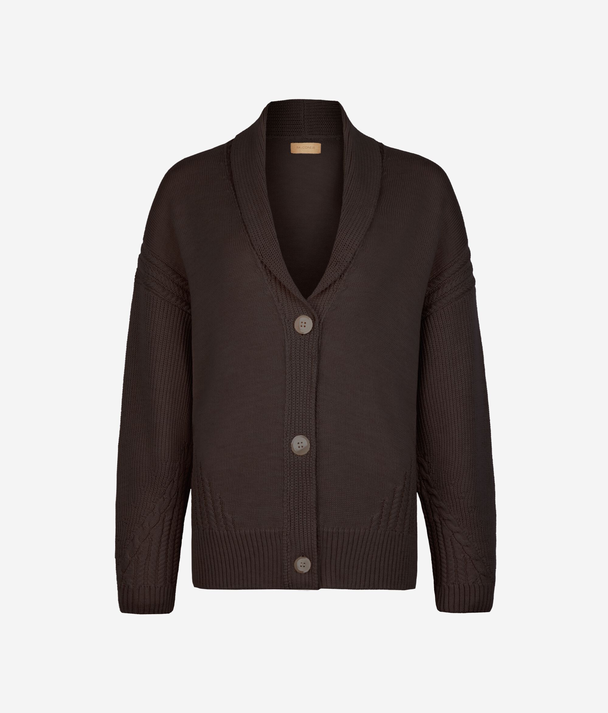The turned-down neckline and button fastening give it an elegant allure, while the dropped shoulders and relaxed fit convey a modern, unrestricted style. The ribbed knit on the sleeves and the cable knit on the sides transform every detail into a true masterpiece of craftsmanship, enhanced by ribbed cuffs and hem.