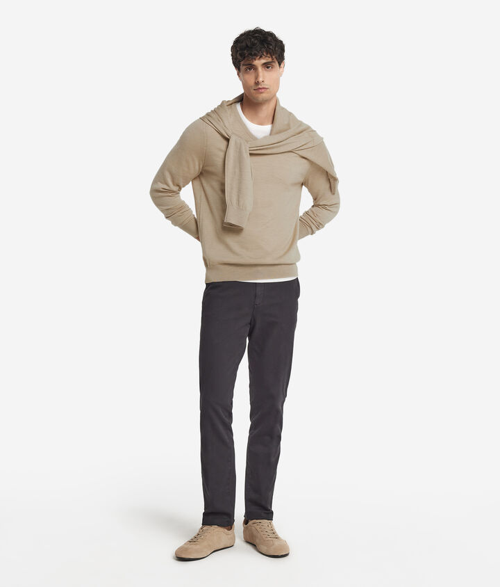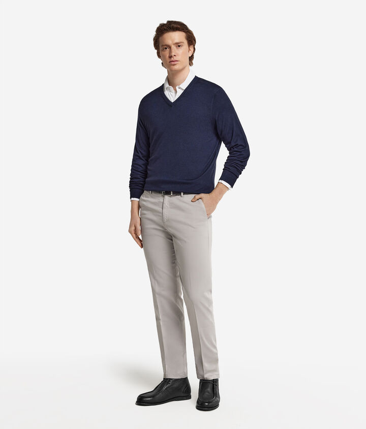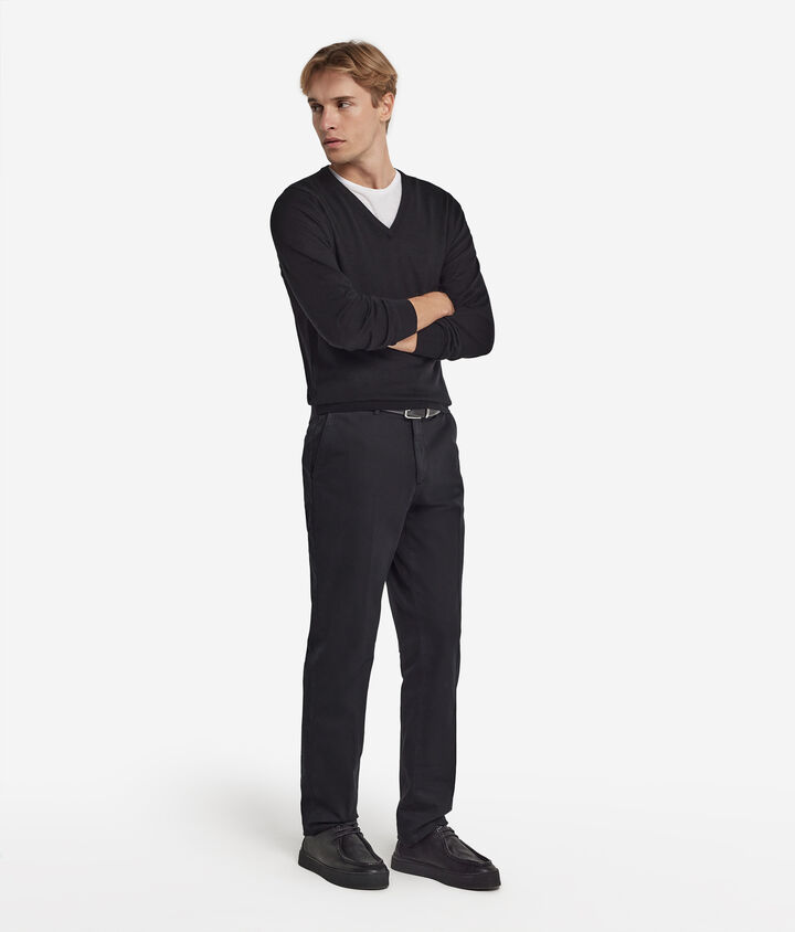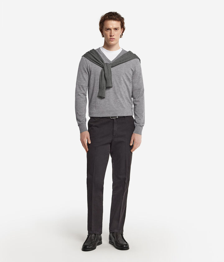 Ni trop classe, ni trop informel, le pull col V est le compromis idéal pour créer un ensemble à la fois chic et casual. Nombreux sont ceux qui l’enfilent pour porter une tenue professionnelle décontractée. Cet essentiel du dressing masculin se décline sous plusieurs couleurs chez Falconeri. Retrouvez-le sous des tons sobres et élégants, comme le pull noir col en V pour homme, gris foncé, ou turquoise pour un soupçon d’originalité.