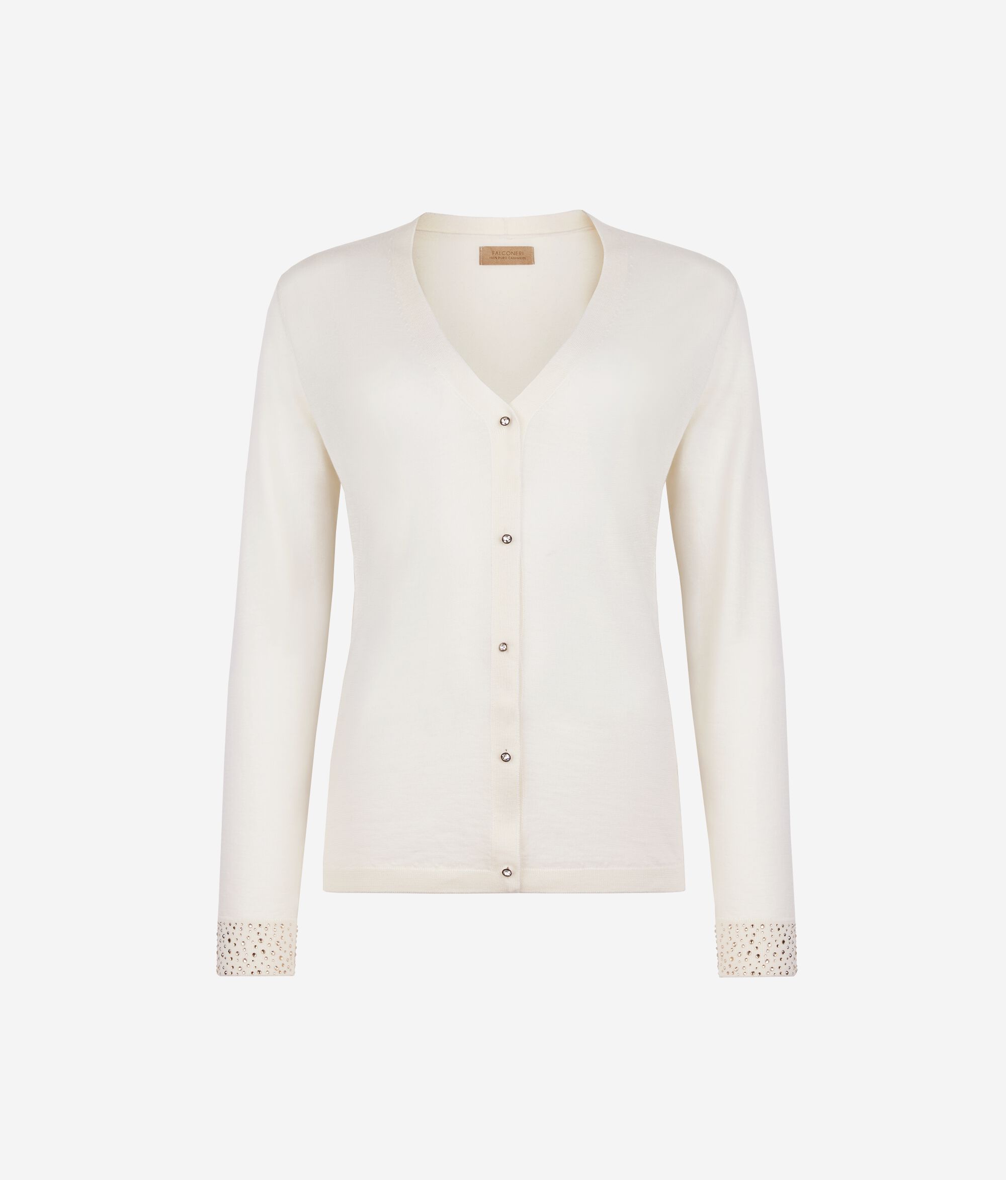 Raffinement et élégance intemporelle rehaussent l'esprit classique de ce pull en cachemire ultra-fin. Le col en V pigeonnant rehausse délicatement le décolleté tandis que la fermeture sur le devant est agrémentée de boutons bijoux apparents, apportant une touche de lumière et de sophistication. Il se termine par des finitions côtelées sur l'encolure, l'ourlet et les poignets, ces derniers étant ornés d'une délicate application de strass lumineux qui ajoutent une note glamour discrète au vêtement.