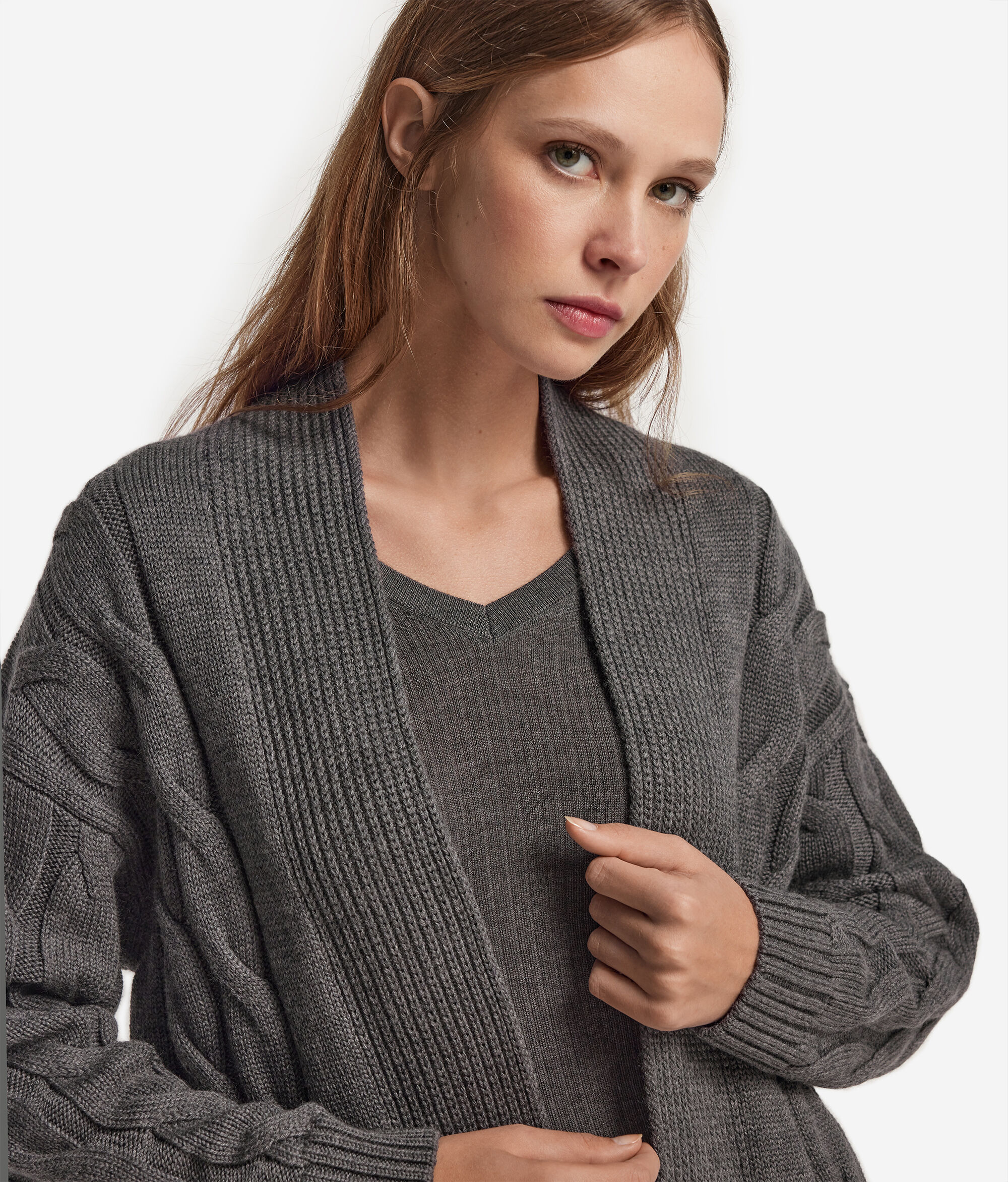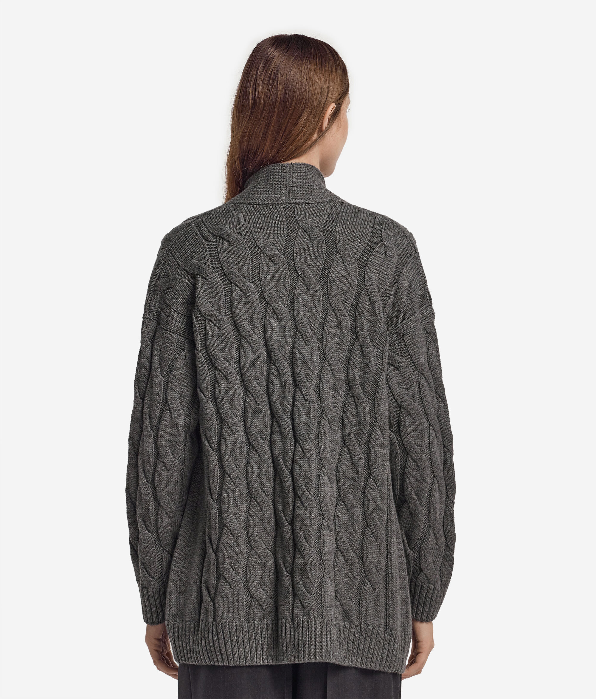 Confectionné en laine douce, ce cardigan à coupe décontractée allie confort et élégance intemporelle. L'ouverture avant à revers sublime la silhouette, tandis que les emmanchures basses lui confèrent une touche fluide et confortable. Sa maille à torsades verticales, associée à des poignets et à un ourlet côtelés, lui appose un brin de relief et une touche artisanale. Sa longueur au-dessus du genou en fait un vêtement polyvalent, idéal pour donner du caractère à toutes vos tenues quotidiennes.