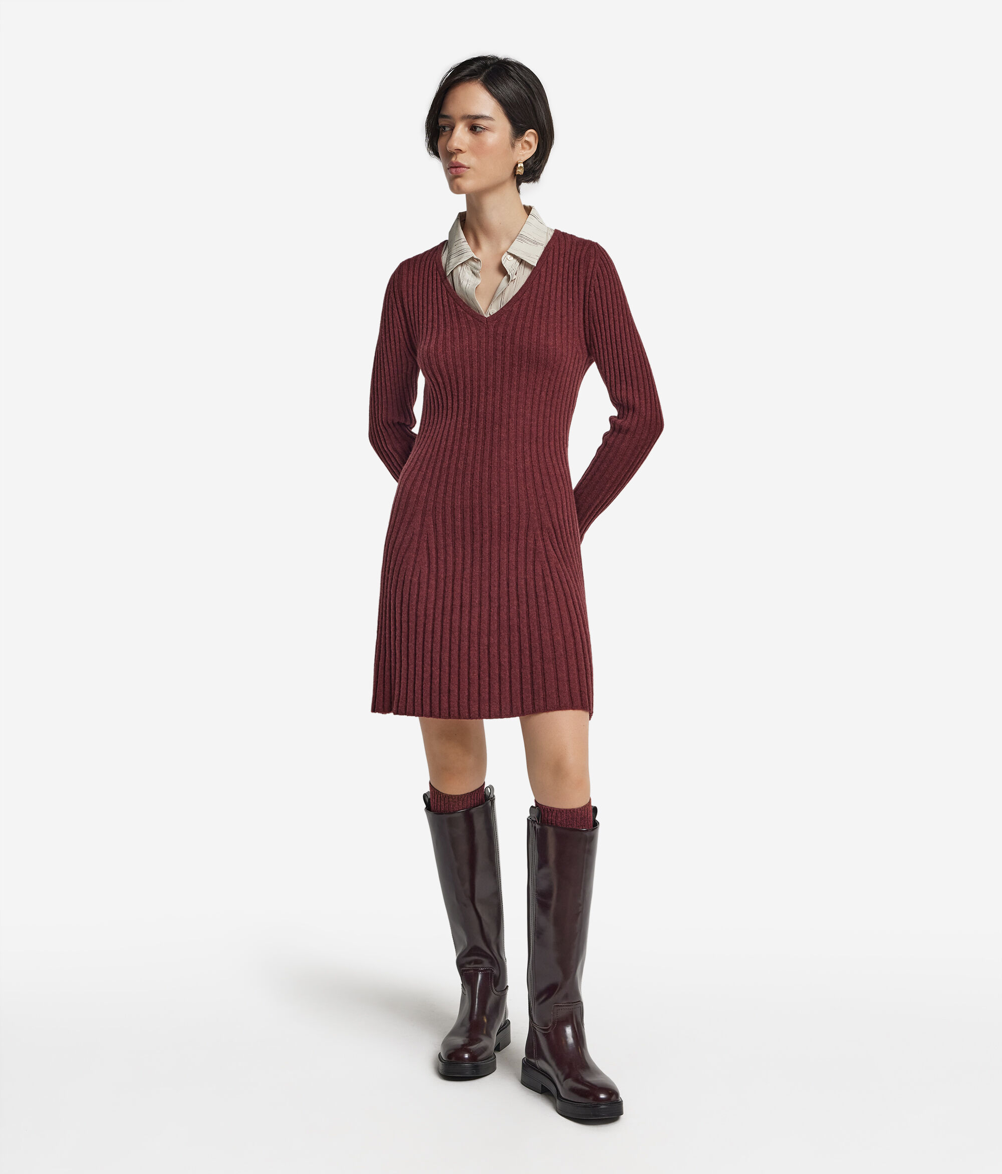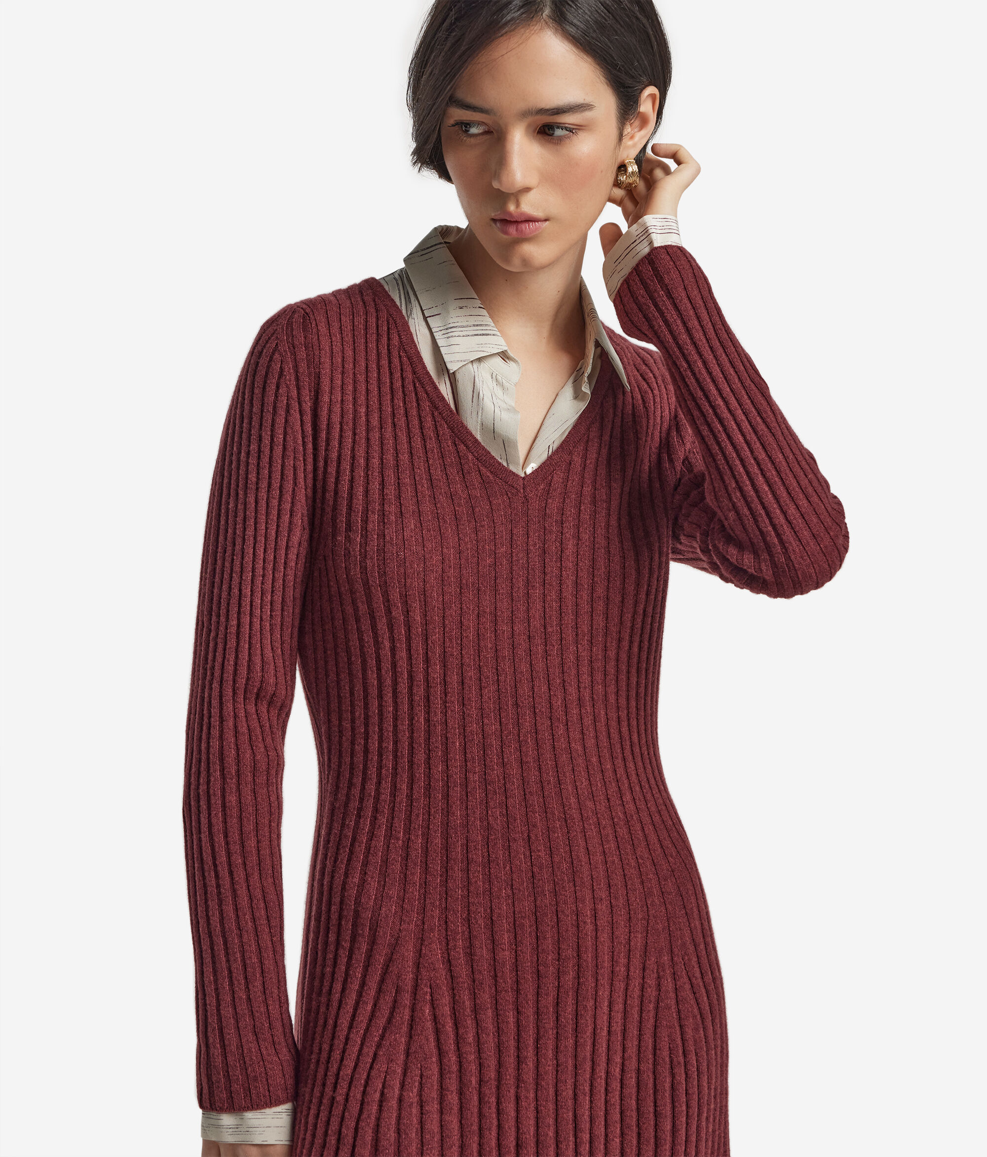 Un abito che racchiude eleganza e leggerezza. Realizzato in pregiato Cashmere Ultrasoft, accarezza la pelle con una morbidezza impalpabile. La vestibilità slim incontra la naturale fluidità della linea svasata, esaltata da uno scollo a V sensuale e discreto. La lavorazione a coste impreziosisce il filato con un raffinato gioco di texture, mentre la lunghezza sopra il ginocchio regala freschezza e modernità a un capo pensato per accompagnare con stile ogni occasione.