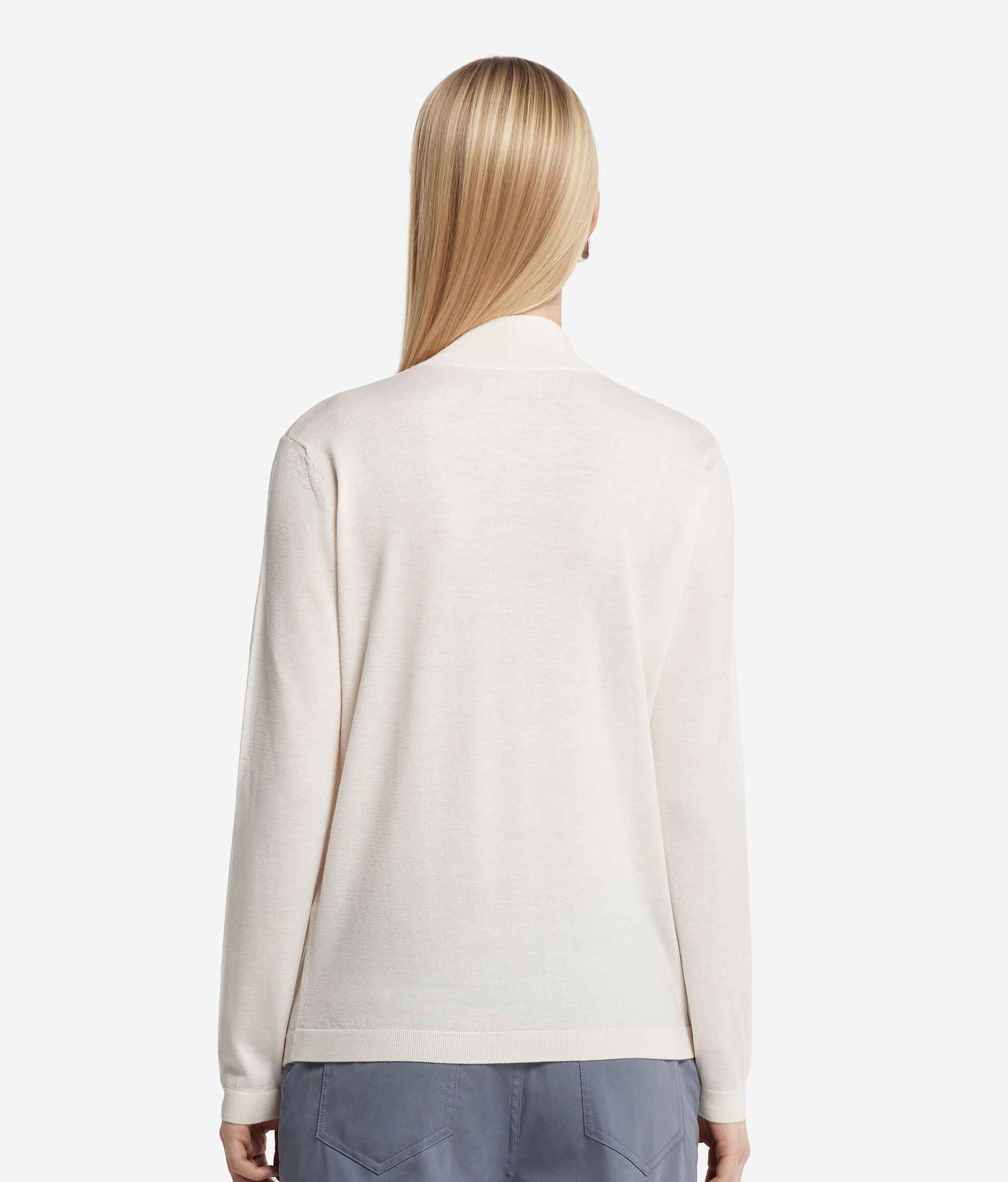 Dieser besondere und bequeme Pullover mit Stehkragen aus Kaschmir Ultrafine bietet ein einzigartiges weiches Tragegefühl. Der überkreuzte hohe Kragen ist ein unverwechselbares Detail, das dem schlichten Design Charakter und Stil beschert. Durch die Hüftlänge ist er perfekt, um ihn zu Hosen oder Röcken zu kombinieren, ideal für Casual-Chic-Looks oder elegantere Outfits.