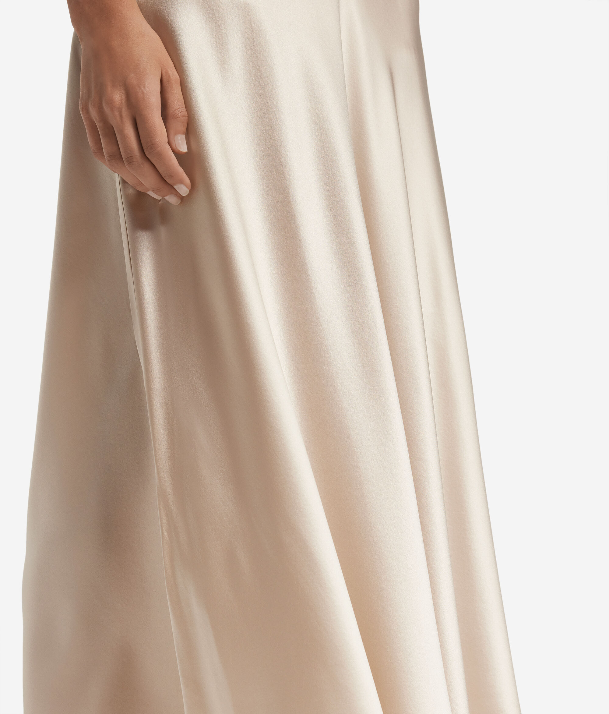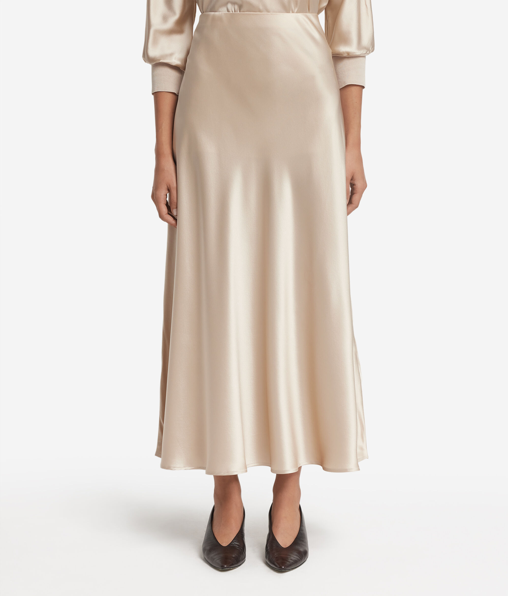 Entdecken Sie die Eleganz und die Raffinesse dieses Rocks, der vollständig aus Seidensatin gefertigt wurde. Der elastische Taillenbund zeichnet das Design aus und bietet bequemen und anpassbaren Tragekomfort. Die Wadenlänge verleiht ihm einen Hauch von Klasse, wodurch er ideal am Tag als auch am Abend getragen werden kann. Das Satingewebe sorgt für einen luxuriösen und leichten Touch für einen garantiert eleganten und zeitlosen Look.