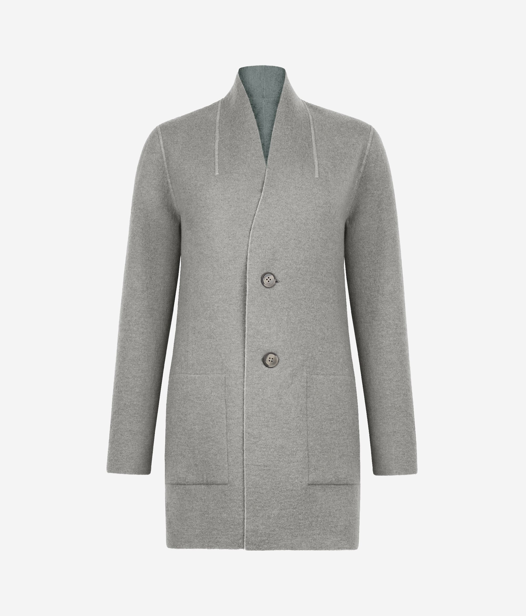 Dieser Wendemantel vereint zwei Identitäten in einem einzigen Kleidungsstück. Der Mantel aus Kaschmir Ultrasoft mit zweifarbiger Rundstrickverarbeitung bietet anschmiegsame Weichheit und ein besonderes Spiel der Kontraste. Der Schalkragen und der Zwei-Knopfverschluss definieren eine elegante Linie, während die unterschiedlichen Taschen auf beiden Seiten die Vielseitigkeit hervorheben. Mit seiner normalen Passform spiegelt er die Übergangszeit mit fließenden Linien wider und bietet Eleganz im Alltag.