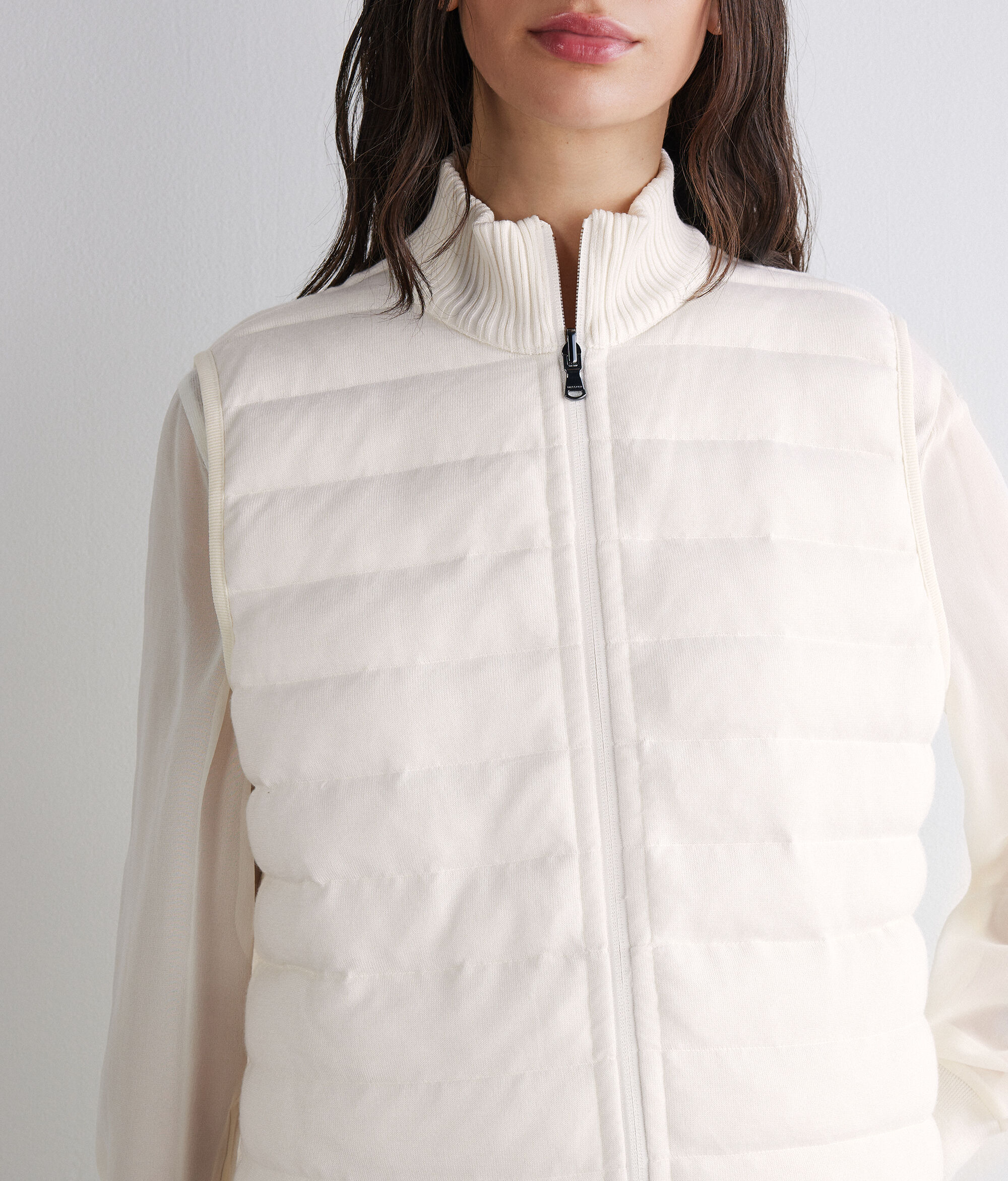 Oboustranná péřová bunda bez rukávů vyznačující se sofistikovaností a moderním provedením. Jedna strana je z matného funkčního materiálu, druhá z prvotřídního kašmíru Ultrafine. Vysoký žebrovaný límec a dvojitý jezdec na zipu jsou funkčními, ale i sofistikovanými prvky. Ozvláštňují ji pečlivě propracované detaily, jako jsou neviditelné kapsy a žebrované elastické lemy, které jsou umocněny úzkým střihem, jenž přirozeně kopíruje postavu.