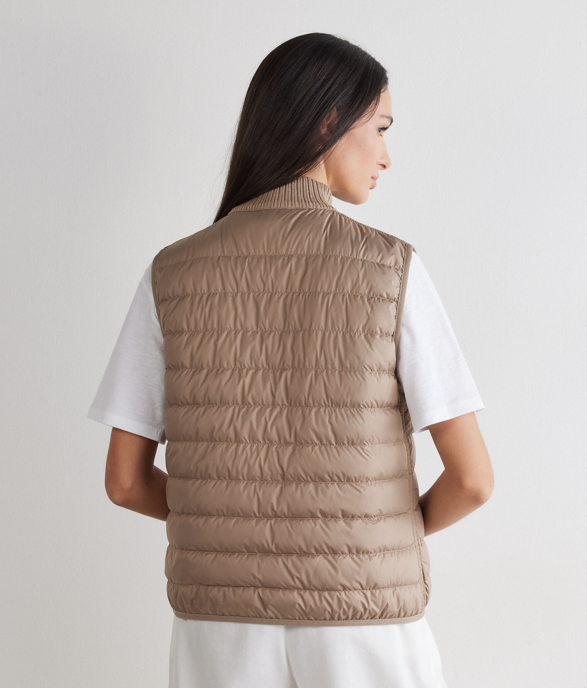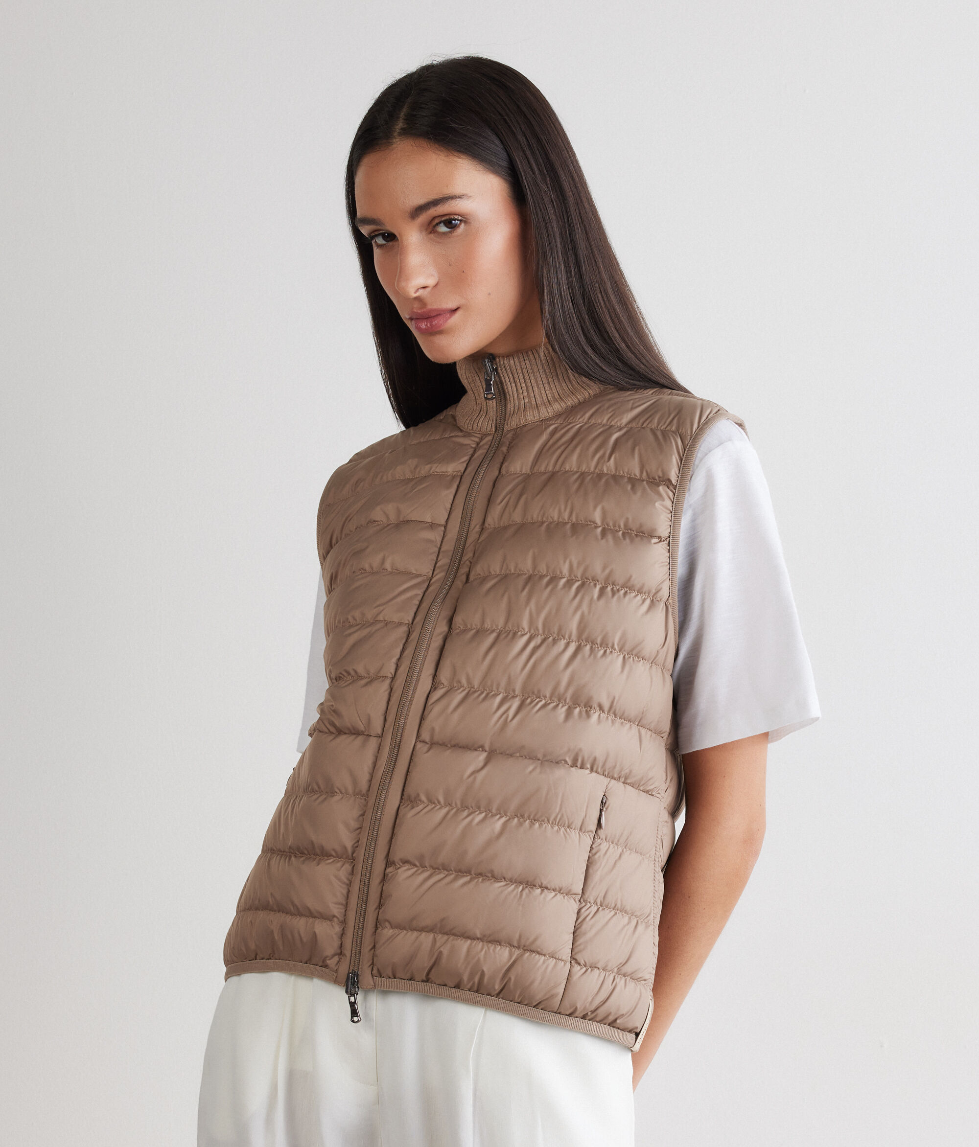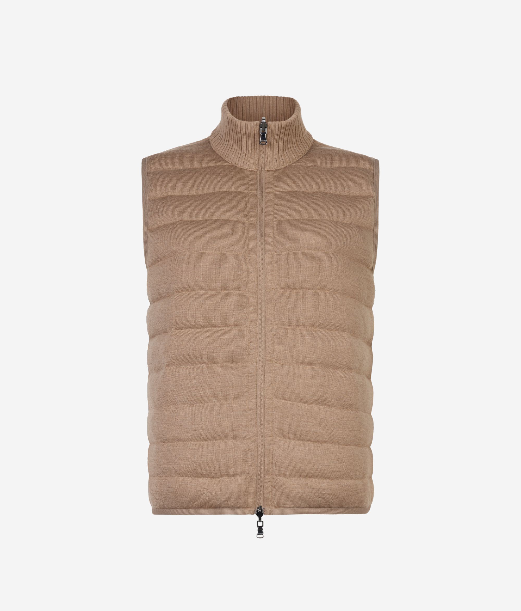 Oboustranná péřová bunda bez rukávů vyznačující se sofistikovaností a moderním provedením. Jedna strana je z matného funkčního materiálu, druhá z prvotřídního kašmíru Ultrafine. Vysoký žebrovaný límec a dvojitý jezdec na zipu jsou funkčními, ale i sofistikovanými prvky. Ozvláštňují ji pečlivě propracované detaily, jako jsou neviditelné kapsy a žebrované elastické lemy, které jsou umocněny úzkým střihem, jenž přirozeně kopíruje postavu.