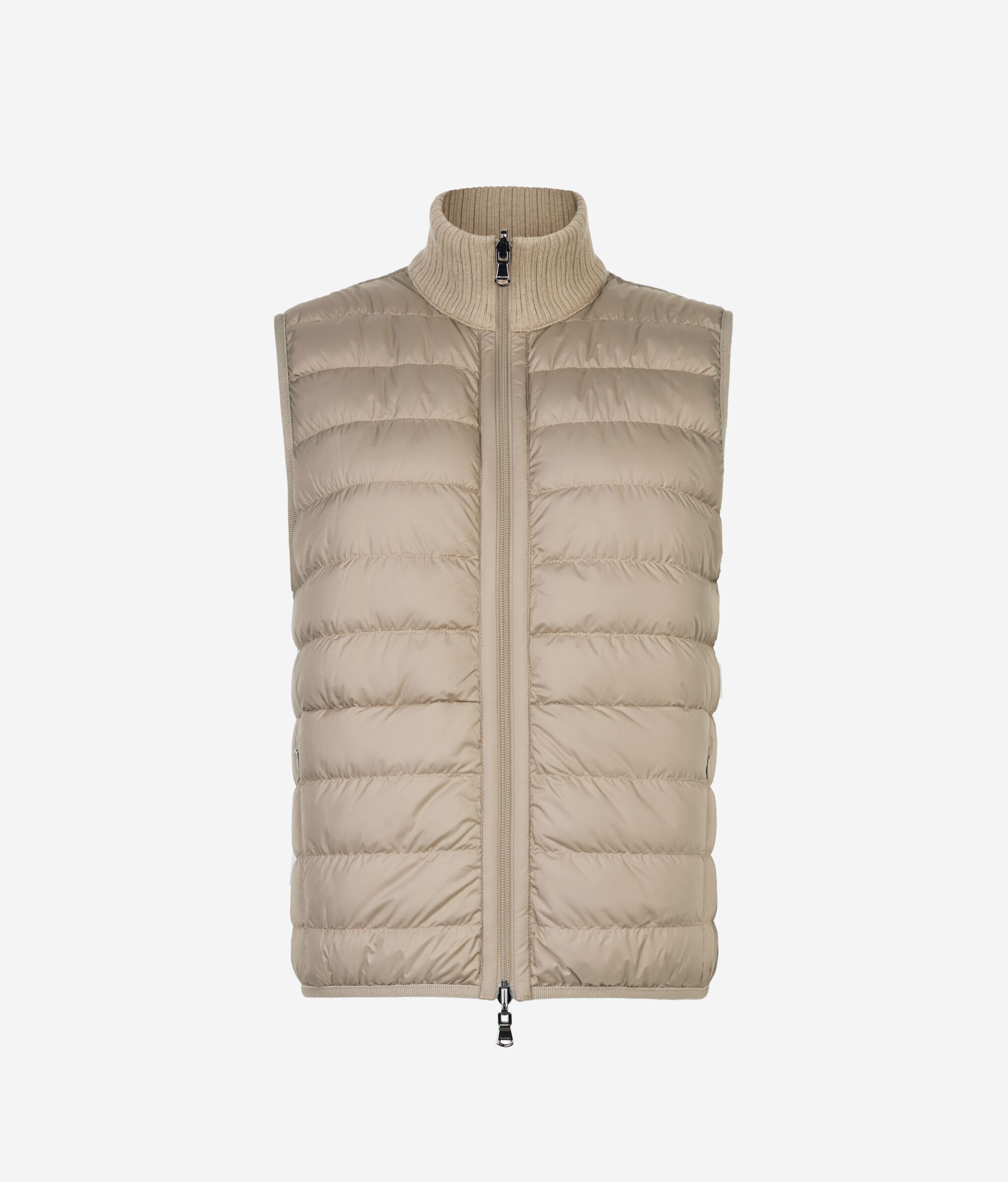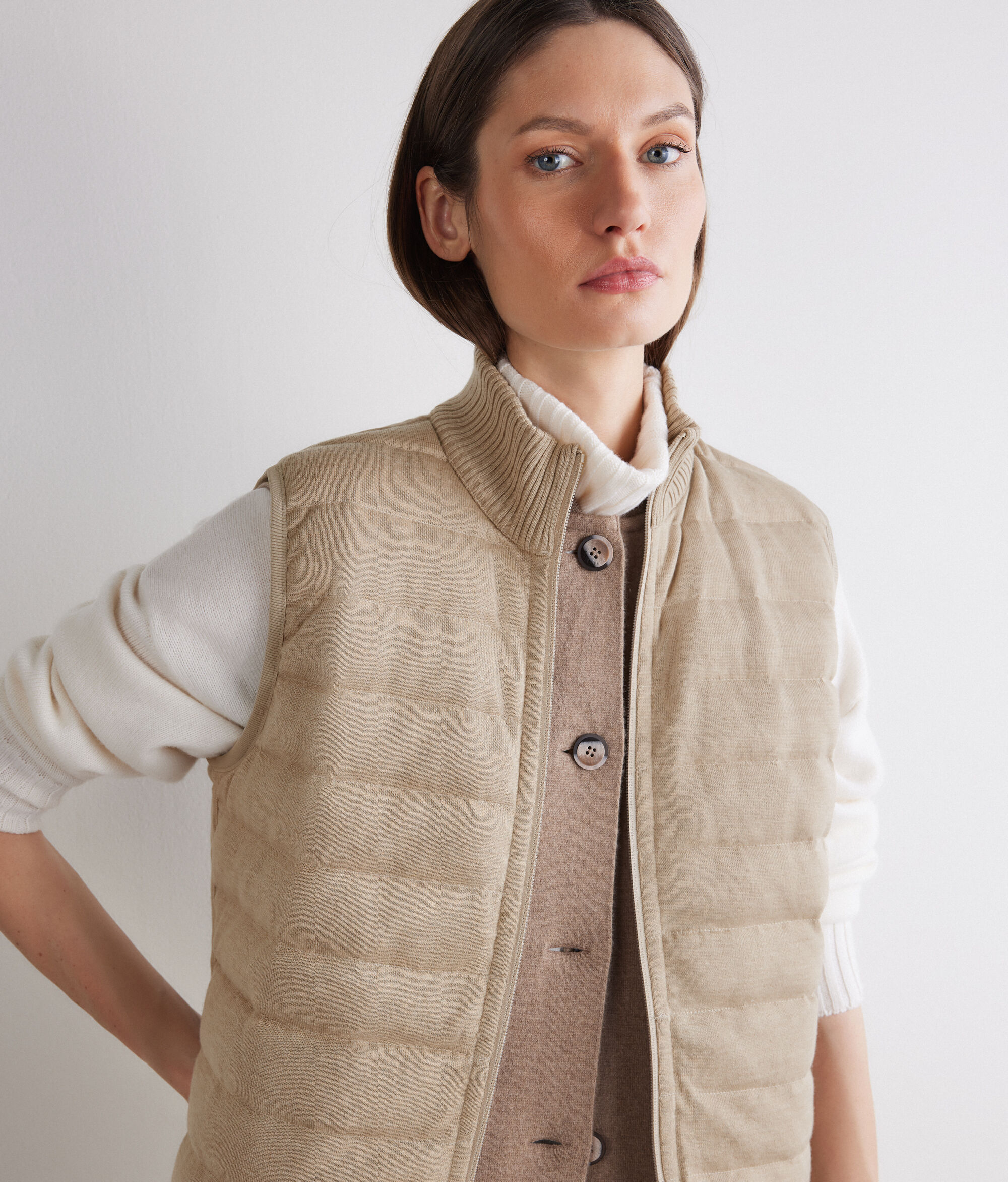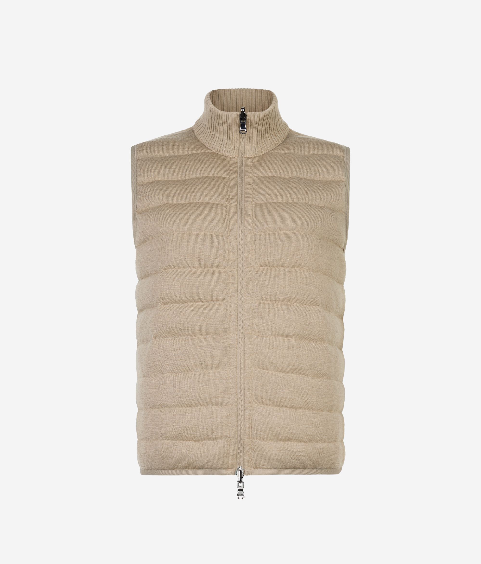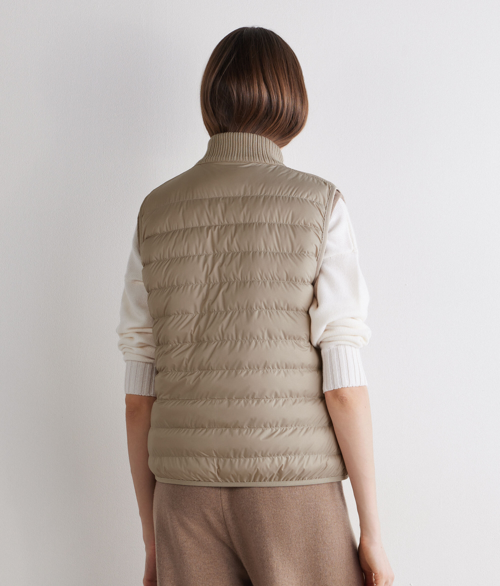 Oboustranná péřová bunda bez rukávů vyznačující se sofistikovaností a moderním provedením. Jedna strana je z matného funkčního materiálu, druhá z prvotřídního kašmíru Ultrafine. Vysoký žebrovaný límec a dvojitý jezdec na zipu jsou funkčními, ale i sofistikovanými prvky. Ozvláštňují ji pečlivě propracované detaily, jako jsou neviditelné kapsy a žebrované elastické lemy, které jsou umocněny úzkým střihem, jenž přirozeně kopíruje postavu.
