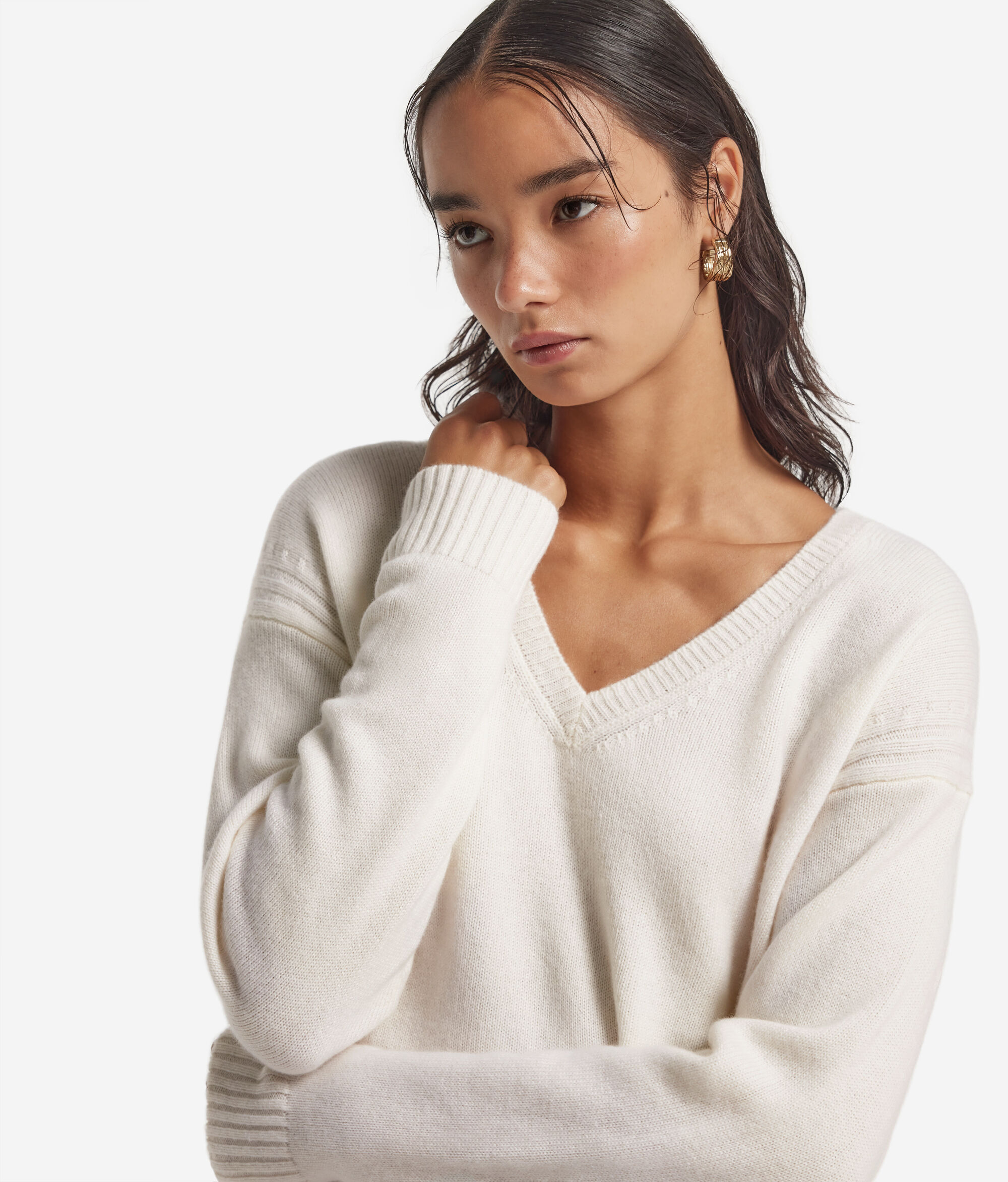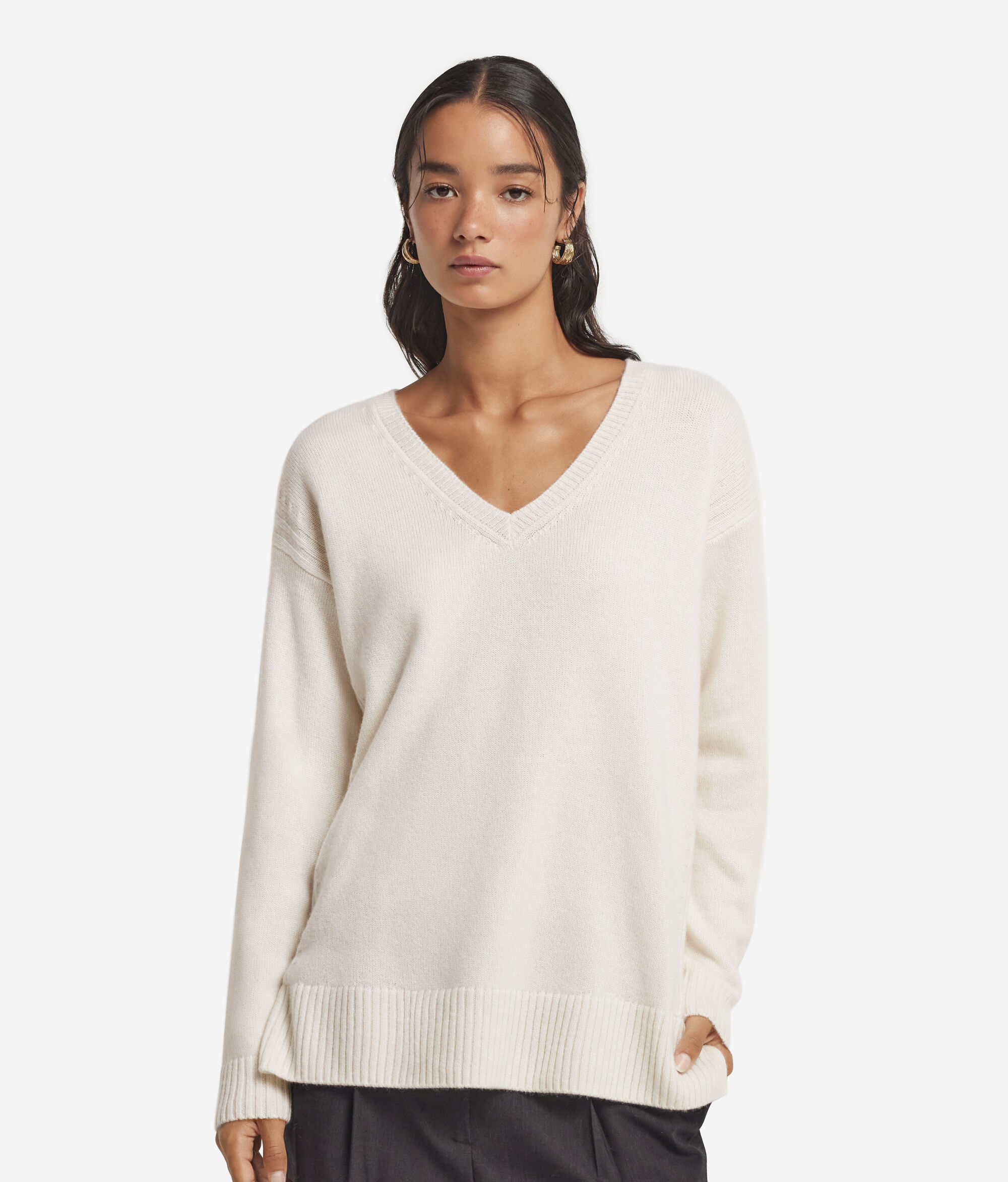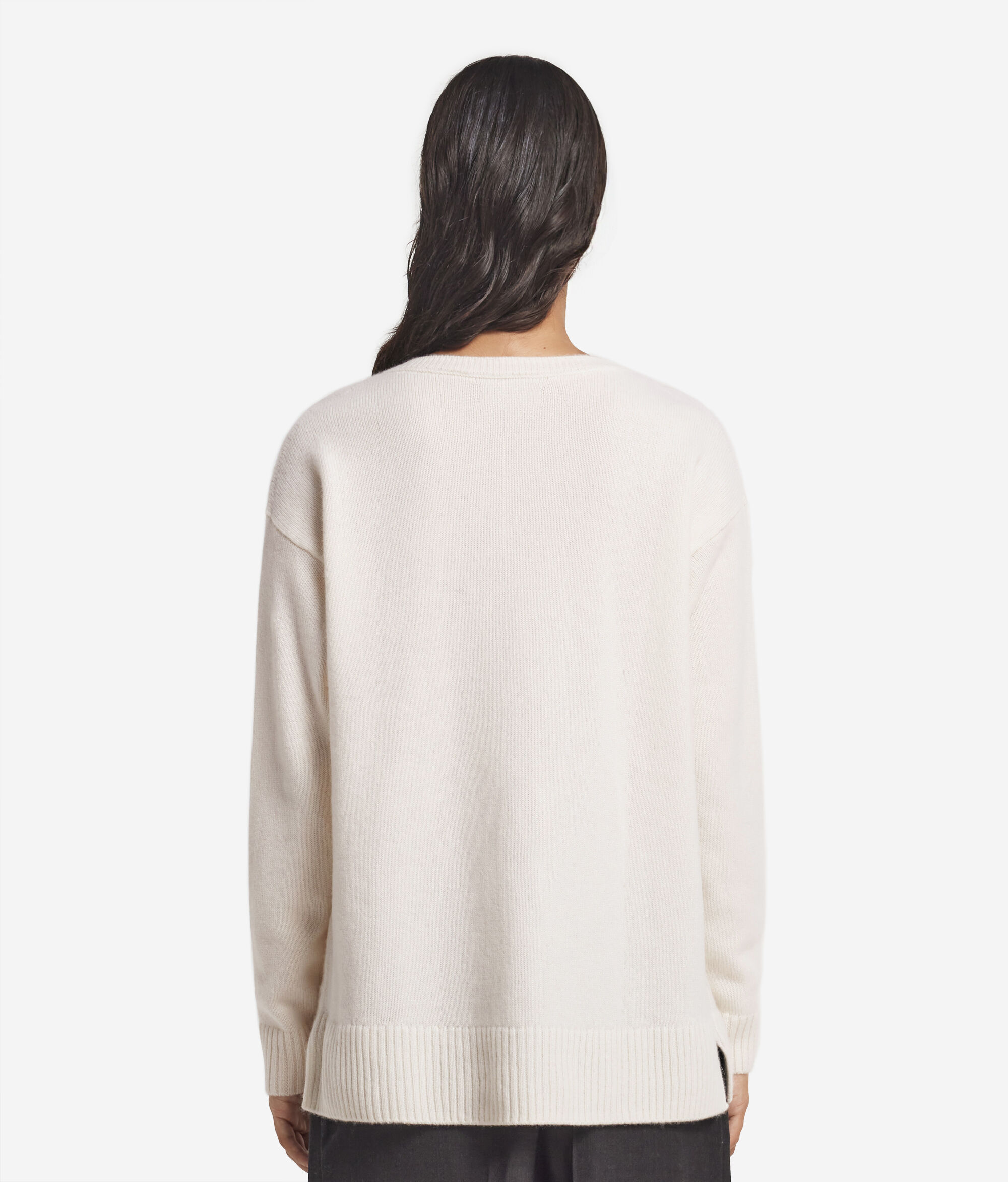 Tento svetřík vyrobený z kašmíru ultrasoft propůjčuje pocit okamžitého pohodlí a elegantní linie. Výstřih do V přirozeně rámuje dekolt, zatímco detail v podobě copánkování po stranách dodává modelu nádech vytříbeného řemeslného zpracování. Jemné boční rozparky umocňují splývavost volného a ležérního střihu, který se skvěle hodí k jednoduchému, ale zároveň sofistikovanému stylu.