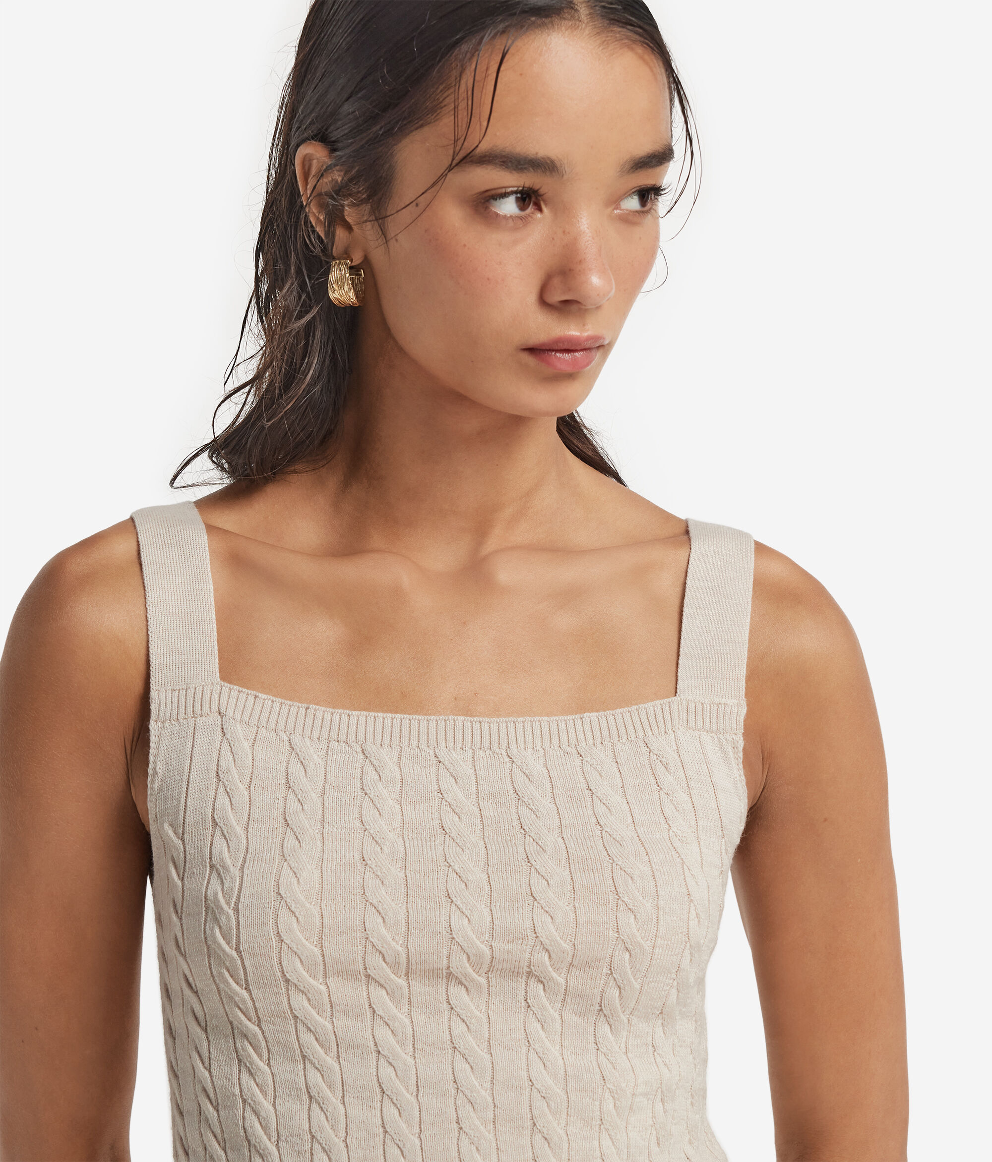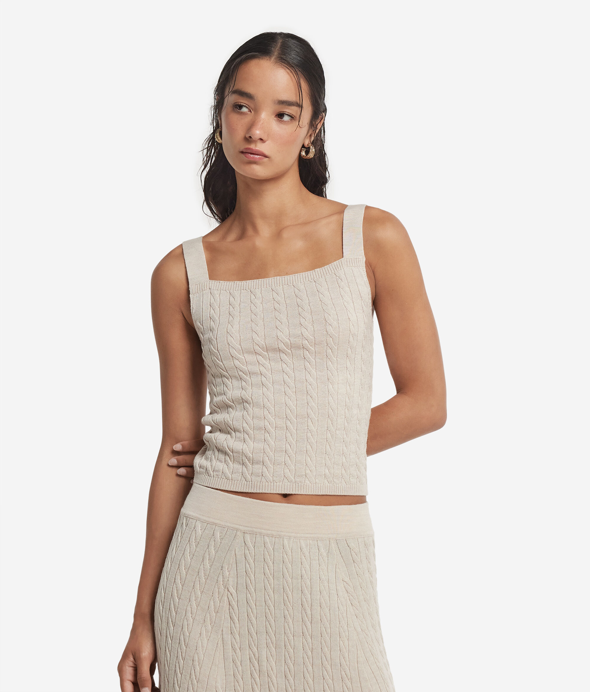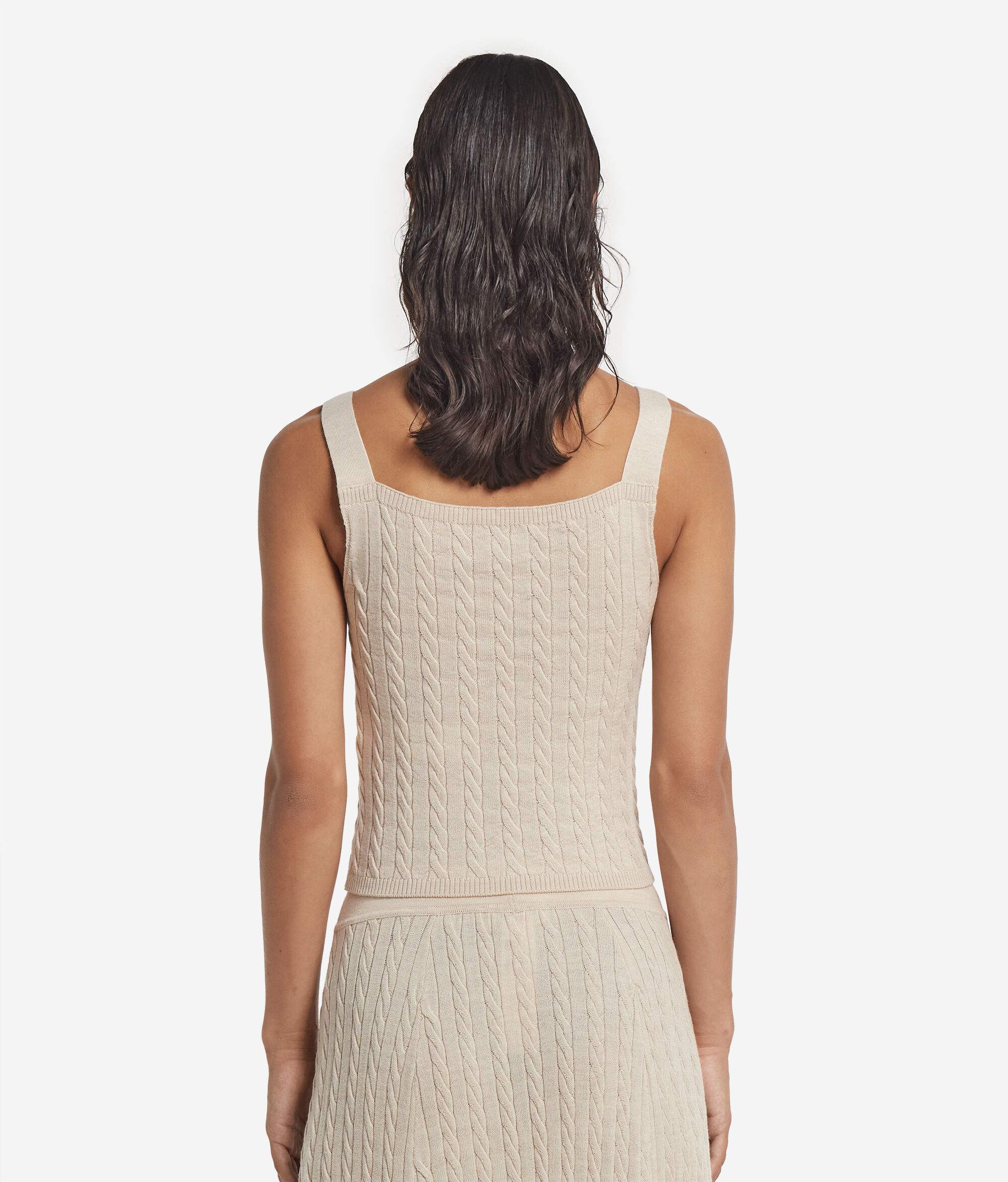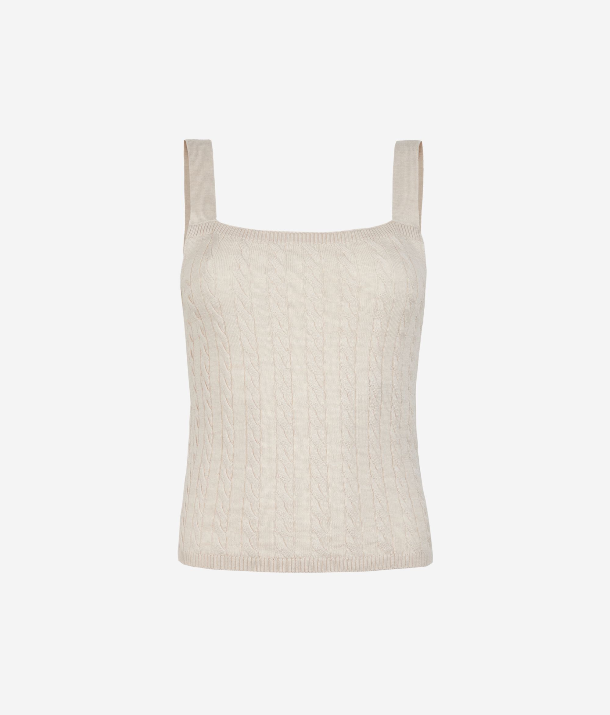 Tento vlněný top s jemnými vertikálními copánky se vyznačuje svým jednoduchým vzhledem s širokými ramínky a rovným výstřihem. Žebrované lemy dodávají oděvu osobitost, zatímco přiléhavý střih přirozeně zdůrazňuje siluetu, díky čemuž je perfektním oděvem k nošení samostatně, nebo pod saka a kardigany.