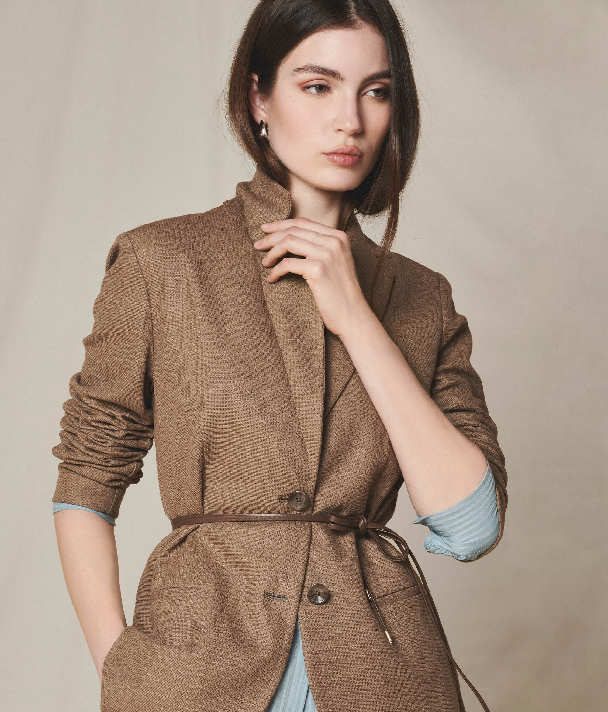 • Einreihiger Knopfverschluss mit zwei Metallknöpfen