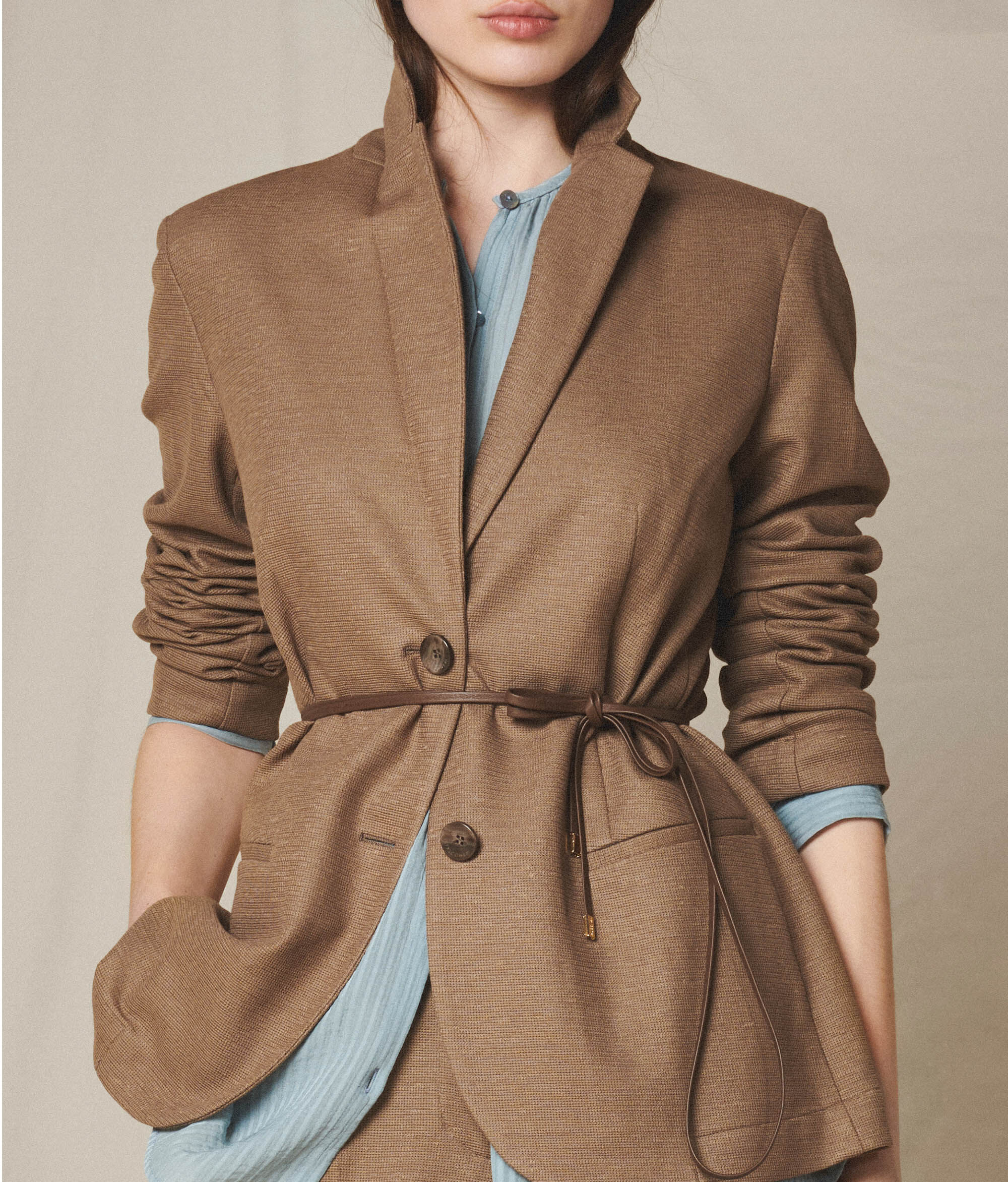 Dieser Used-Blazer aus Baumwollleinen verkörpert lässige, moderne Eleganz. Das steigende Revers betont das Design mit einem markanten einen Hauch von Schneiderkunst, während der einreihige Verschluss mit zwei Metallknöpfen einen glänzenden Akzent setzt. Die aufgesetzten Taschen runden das Kleidungsstück ab, wodurch es sich perfekt sowohl für formelle Looks als auch für legere Outfits eignet.