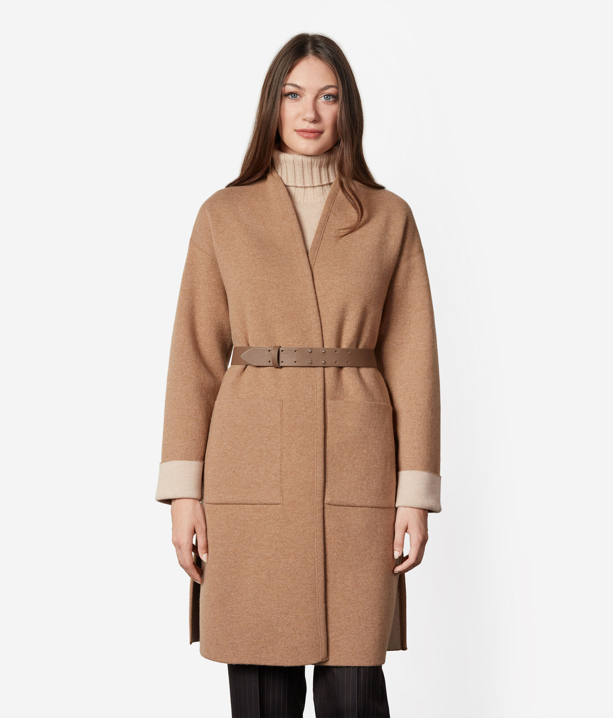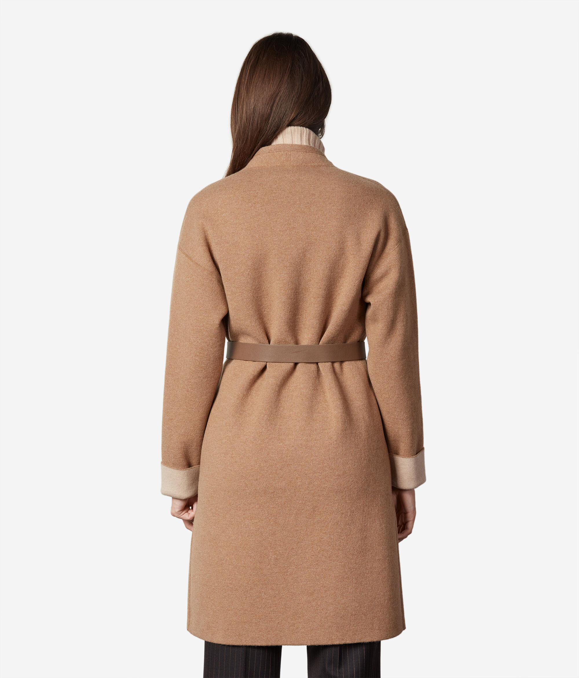Dieser Doubleface-Mantel verkörpert den Look eines eleganten und besonderen Stils. Ein Kleidungsstück, das die Details der Schneiderkunst anhand der Verwendung von reinem Kaschmir hervorhebt und die Formen mit dem Ledergürtel betont.