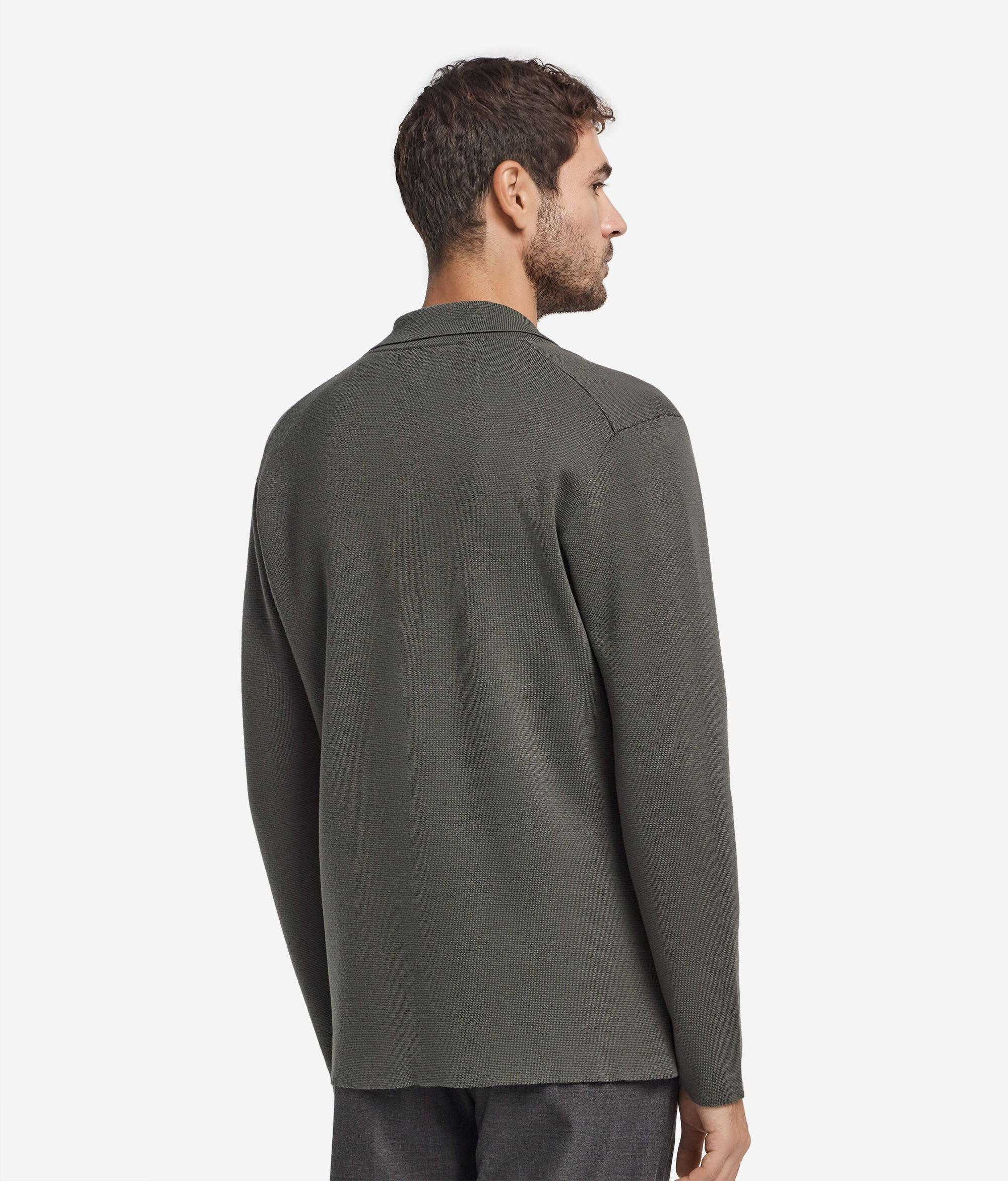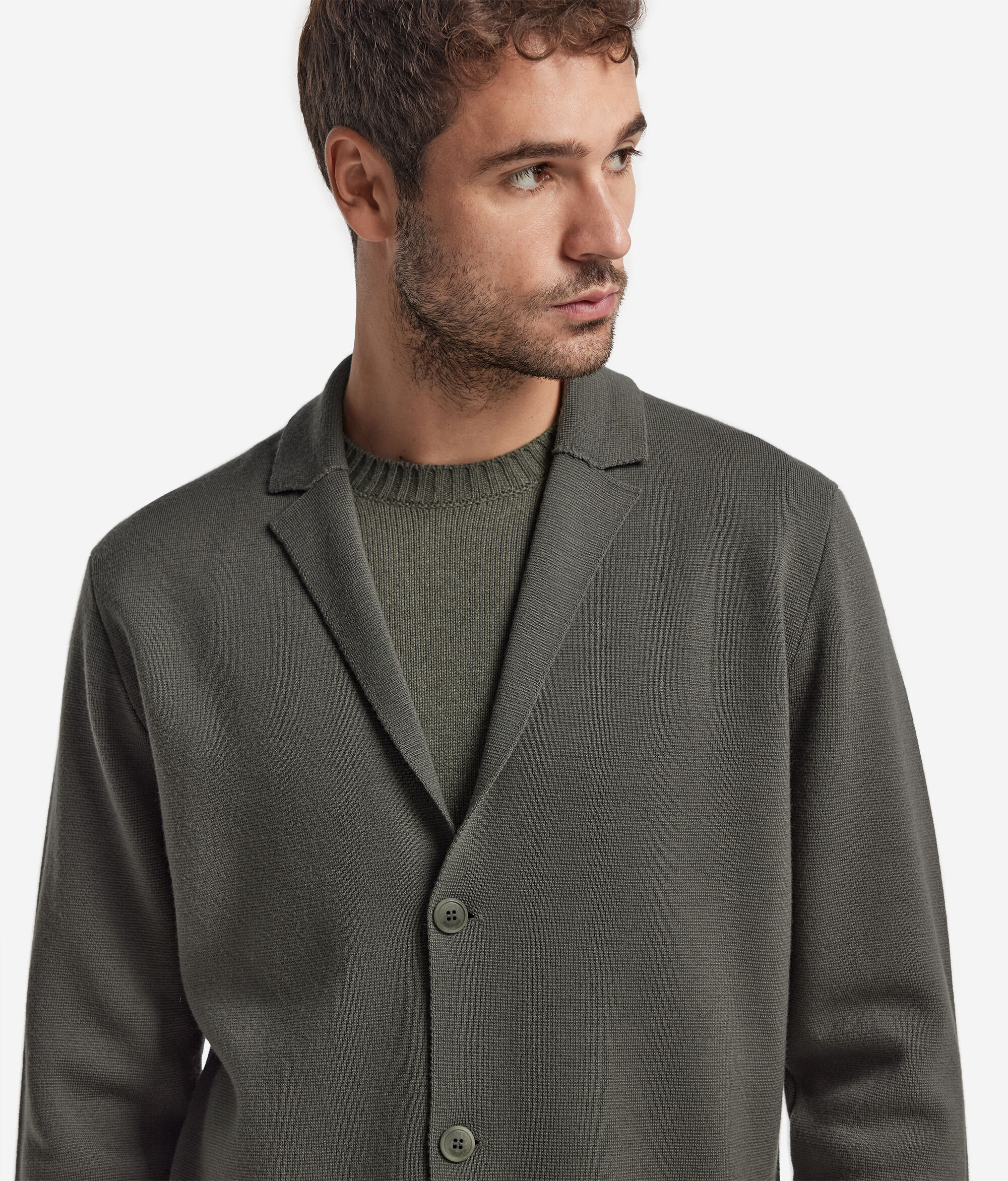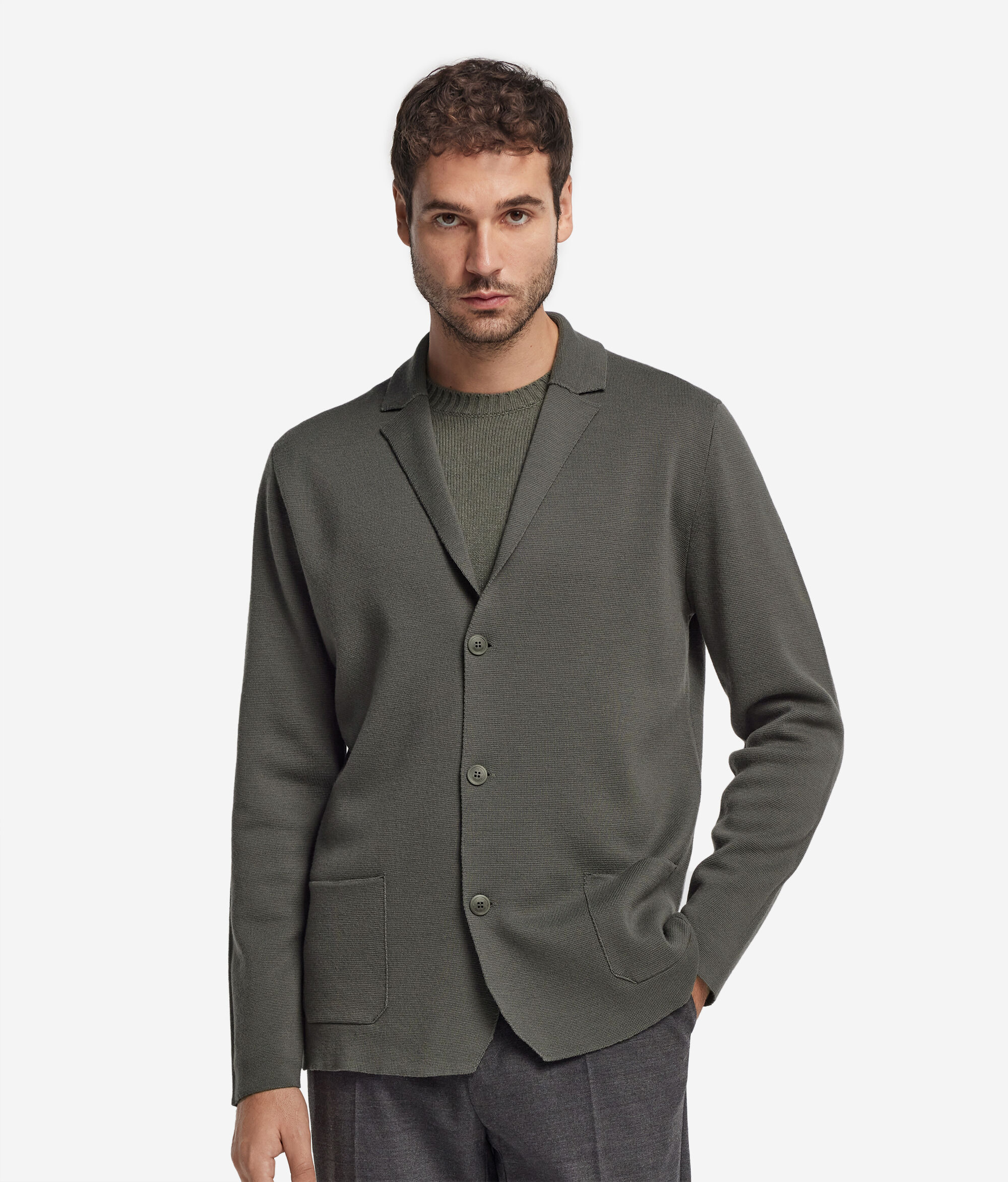 Die feinen Wollqualitäten bereichern die Jacke in Stoffstichverarbeitung. Das elegante Revers, die langen Ärmel und der einreihige Zwei-Knopf-Verschluss zeugen von subtiler Eleganz. Die diskreten und funktionalen aufgesetzten Taschen fügen sich natürlich in den normalen Schnitt ein, der jede Bewegung mühelos begleitet.