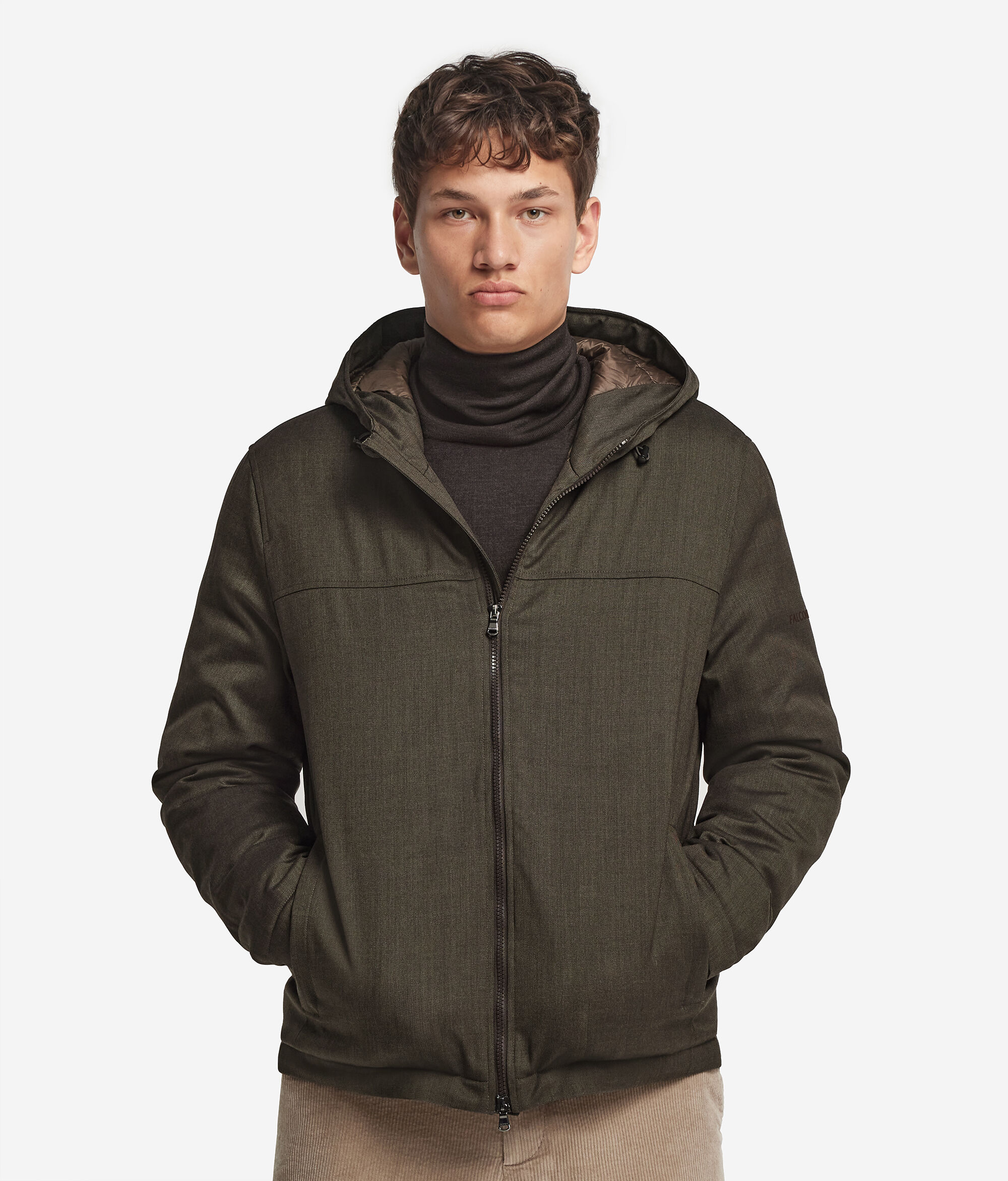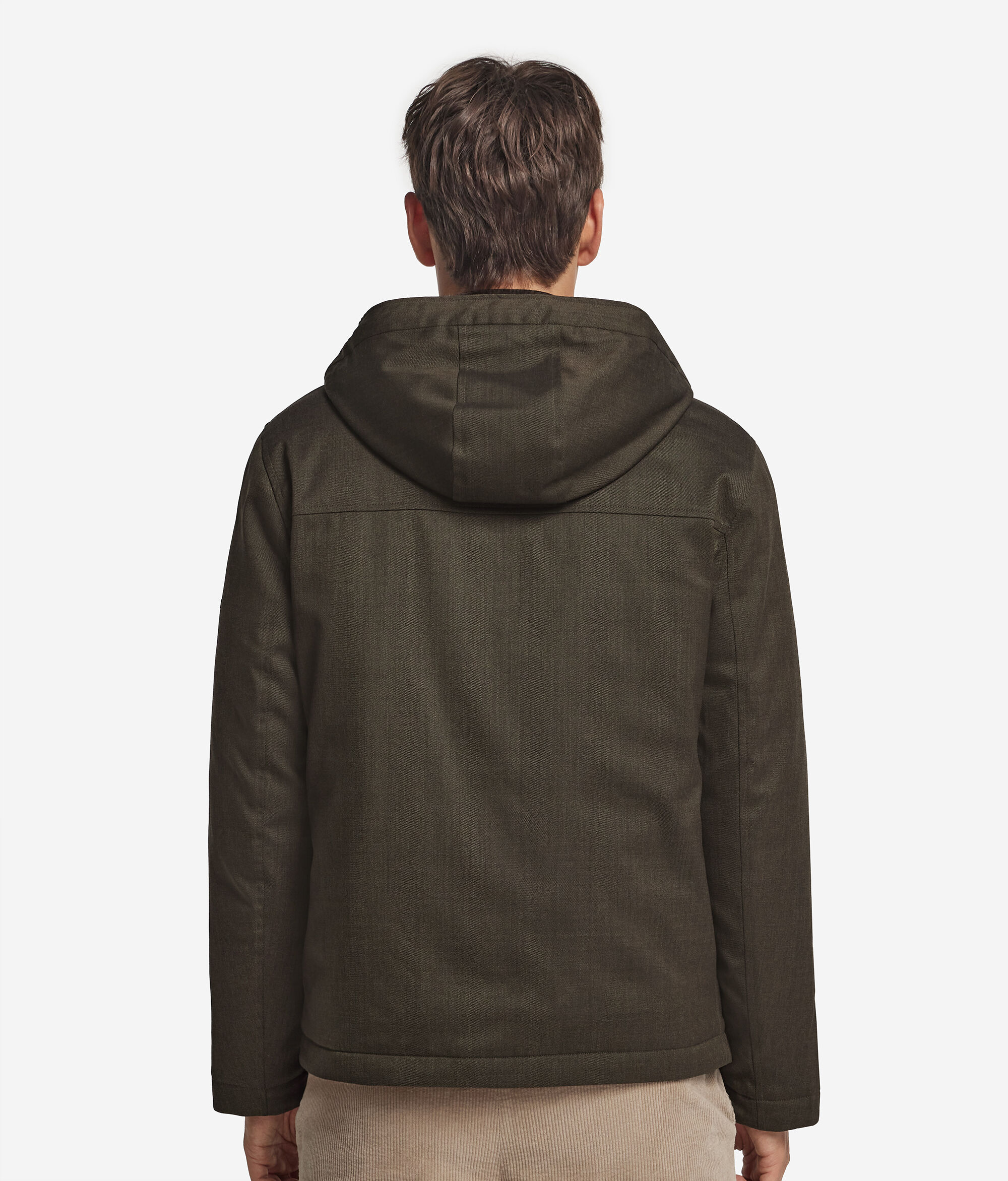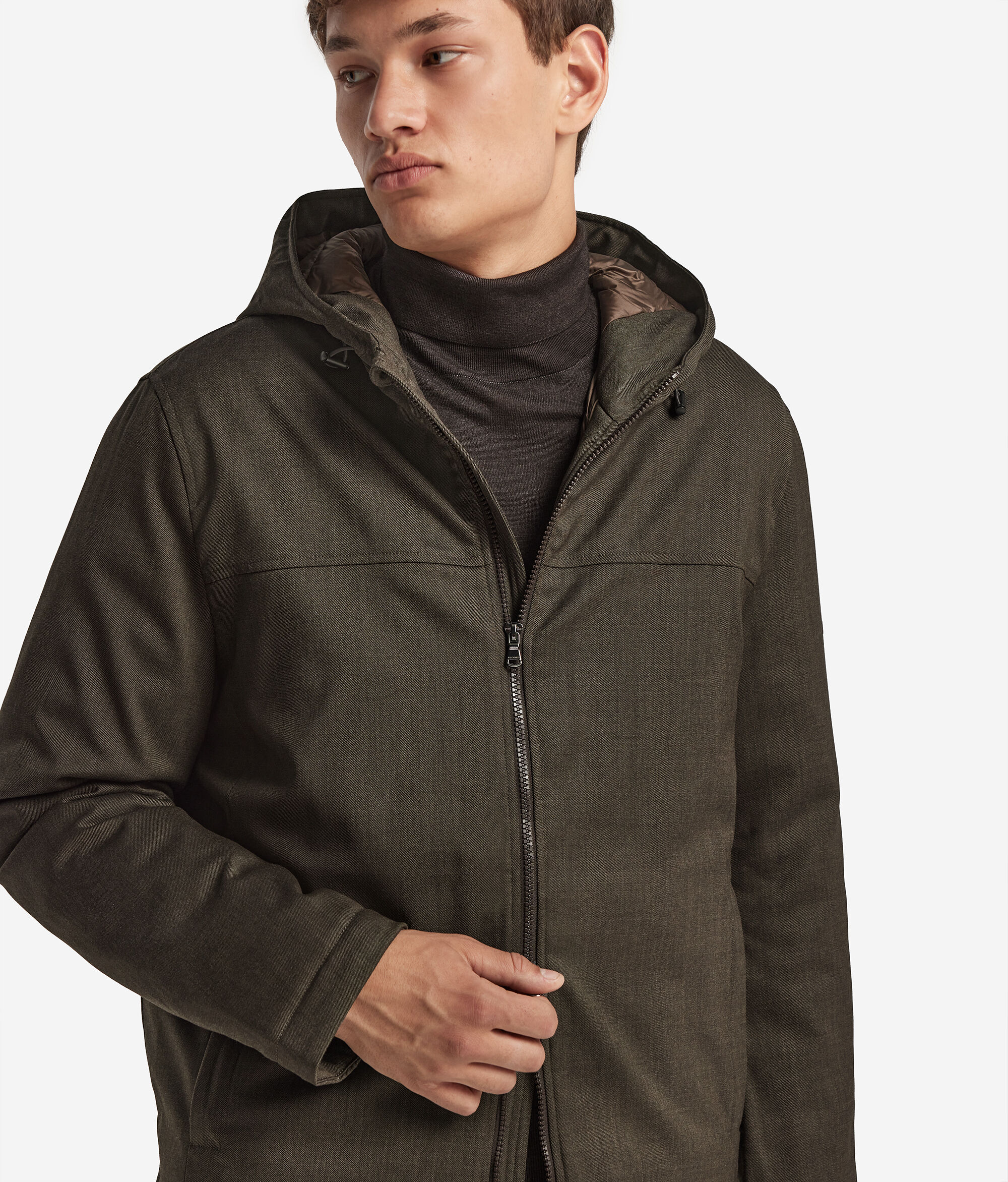 Diese Jacke aus wasserabweisender Funktionswolle mit einer Innenseite aus Funktionsfutter mit Daunenfüllung bietet Wärme und Leichtigkeit, ideal, um Funktionalität mit einem urbanen Stil verschmelzen zu lassen. Die verstellbare Kapuze mit Tunnelzug bietet Funktionalität und Schutz an kühleren Tagen, die Passe mit Taschen sorgt für eine klare und moderne Ästhetik.