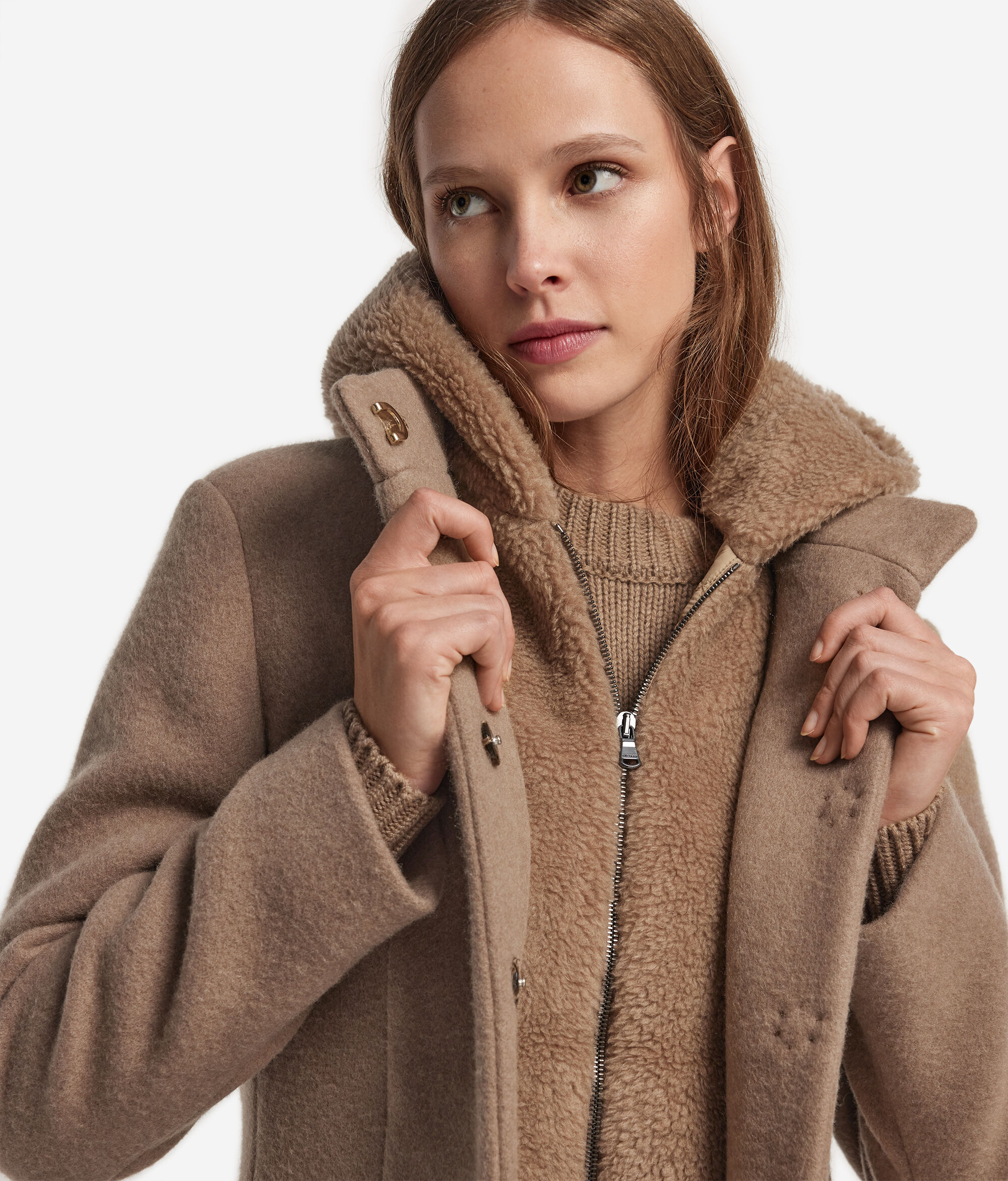 Dieser Mantel aus besonderem Kaschmirgewebe vereint schlichten Stil und edle Details. Die Kapuze in Felloptik sorgt für einen Hauch von Weichheit und Materialkontrast, während die klaren Linien durch eine normale Schulterpartie und eine Knopfleiste mit versteckten Druckknöpfen definiert werden. Die Vordertaschen und die Knielänge machen das besondere Design mit normaler Passform und modernem Stil komplett.