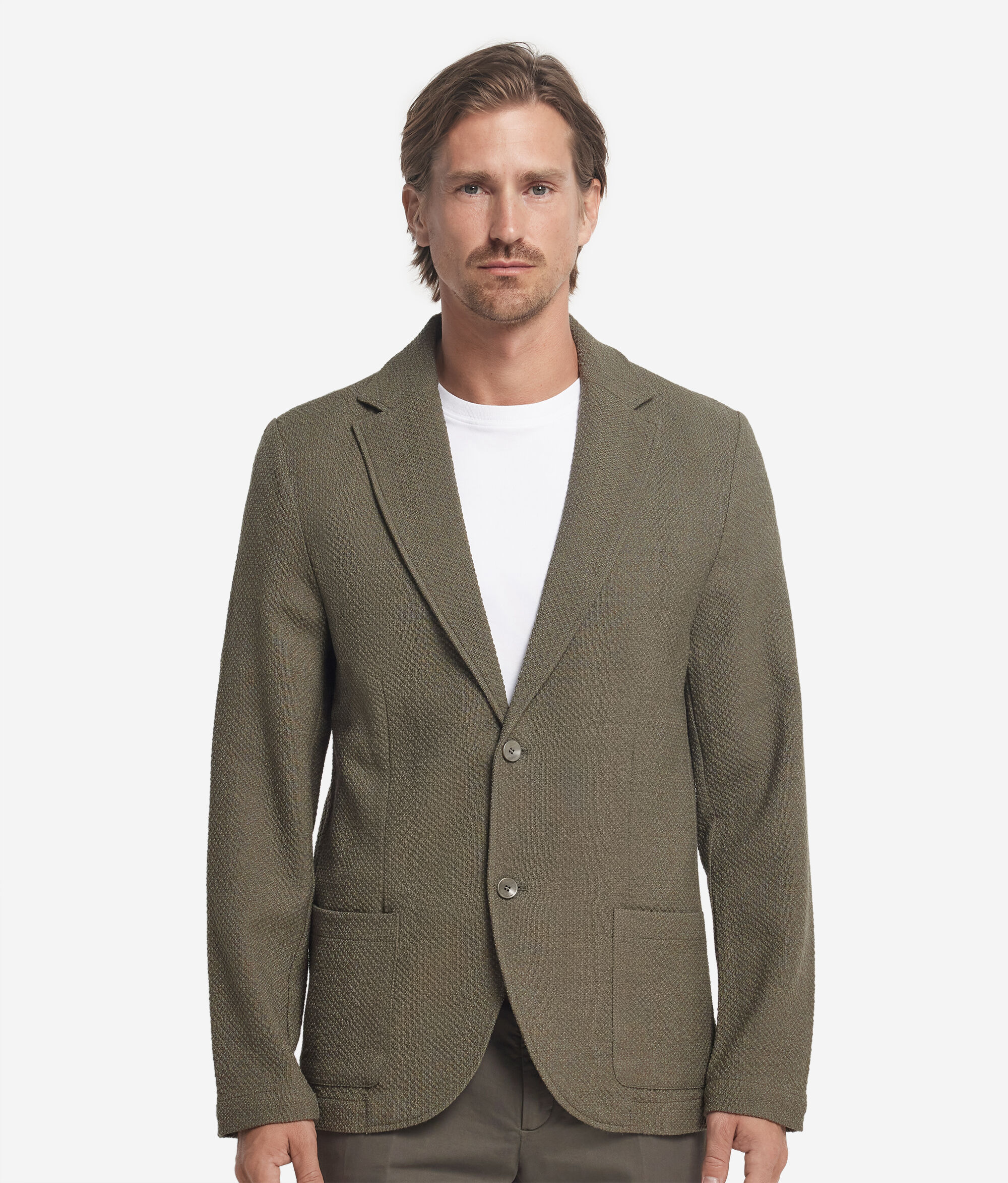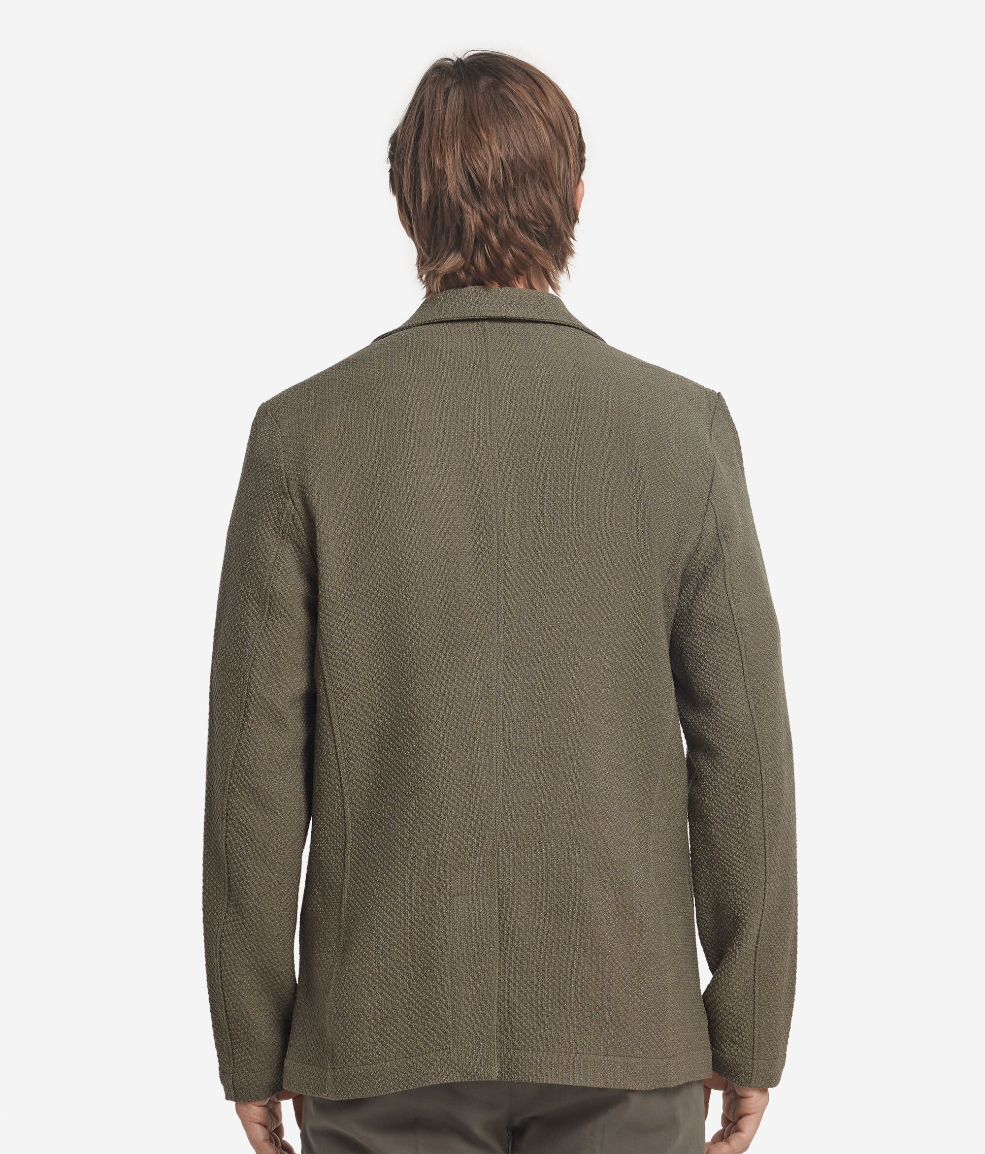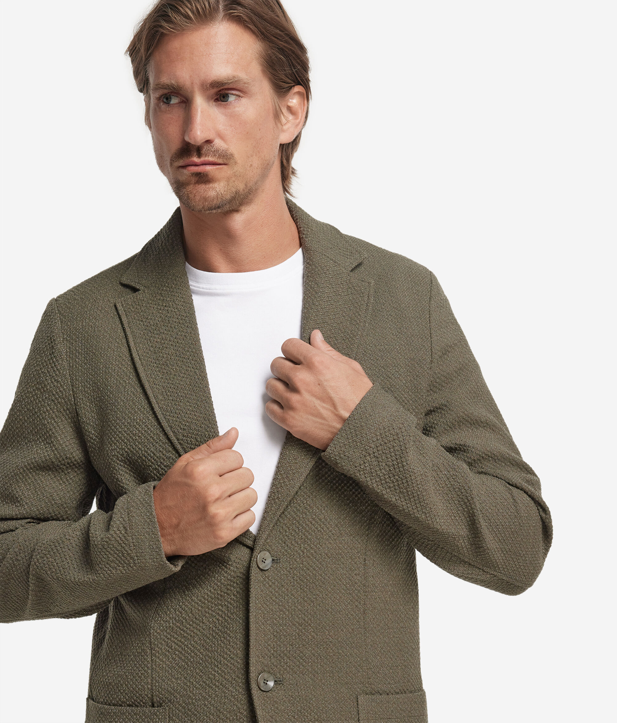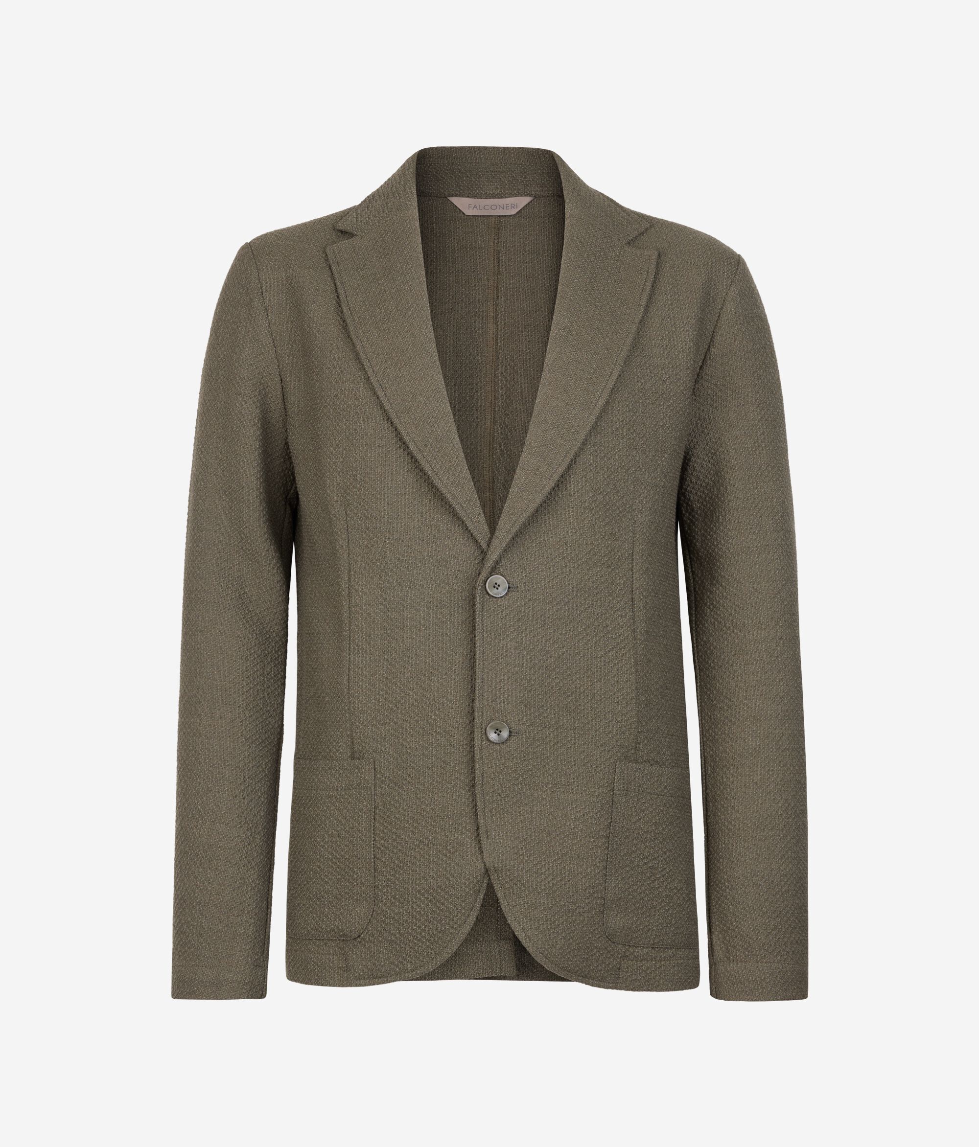 Dieses Sakko aus Mouliné-Wolle zeichnet sich durch eine schlichte und moderne Eleganz aus und besticht durch seine reiche Textur und sein leicht unruhiges Aussehen. Das klassische Revers mit Steppnähten und die aufgesetzten Taschen werten das geschneiderte Design auf, während die mittige Knopfleiste und der Schlitz an der Rückseite eine perfekte Balance zwischen minimalistischem Stil und erlesenen Details bieten.
