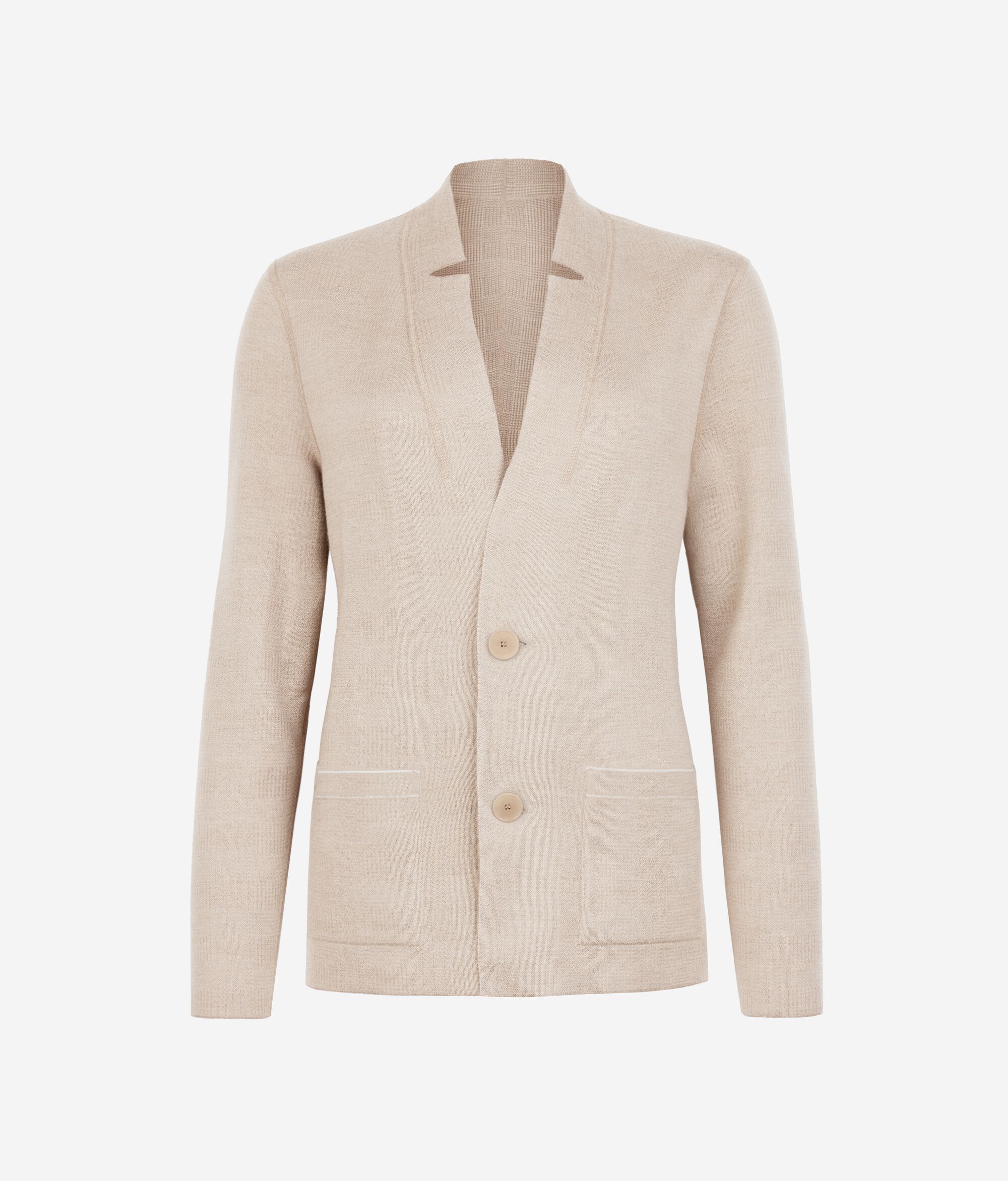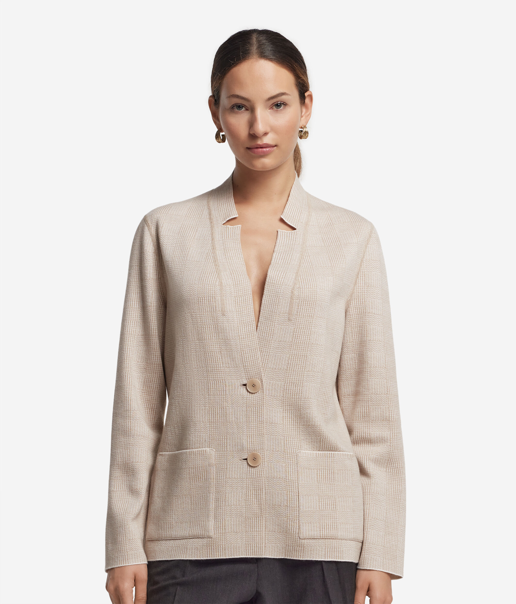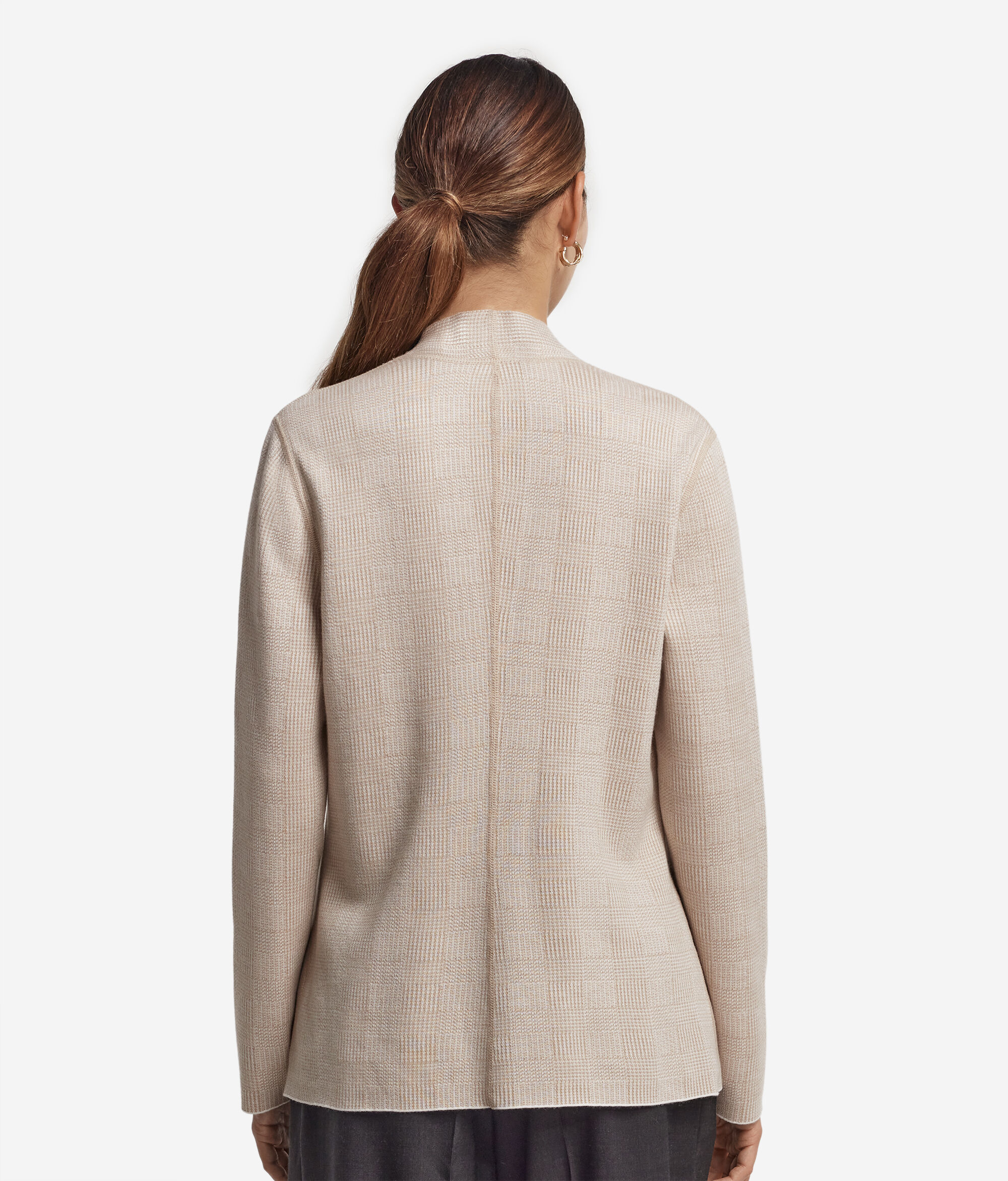 • Einfarbig gestrickt auf der einen Seite und zweifarbiger Glencheck-Strick auf der anderen