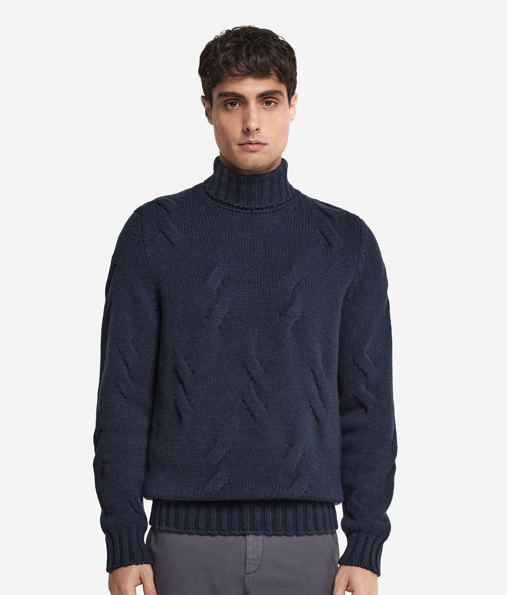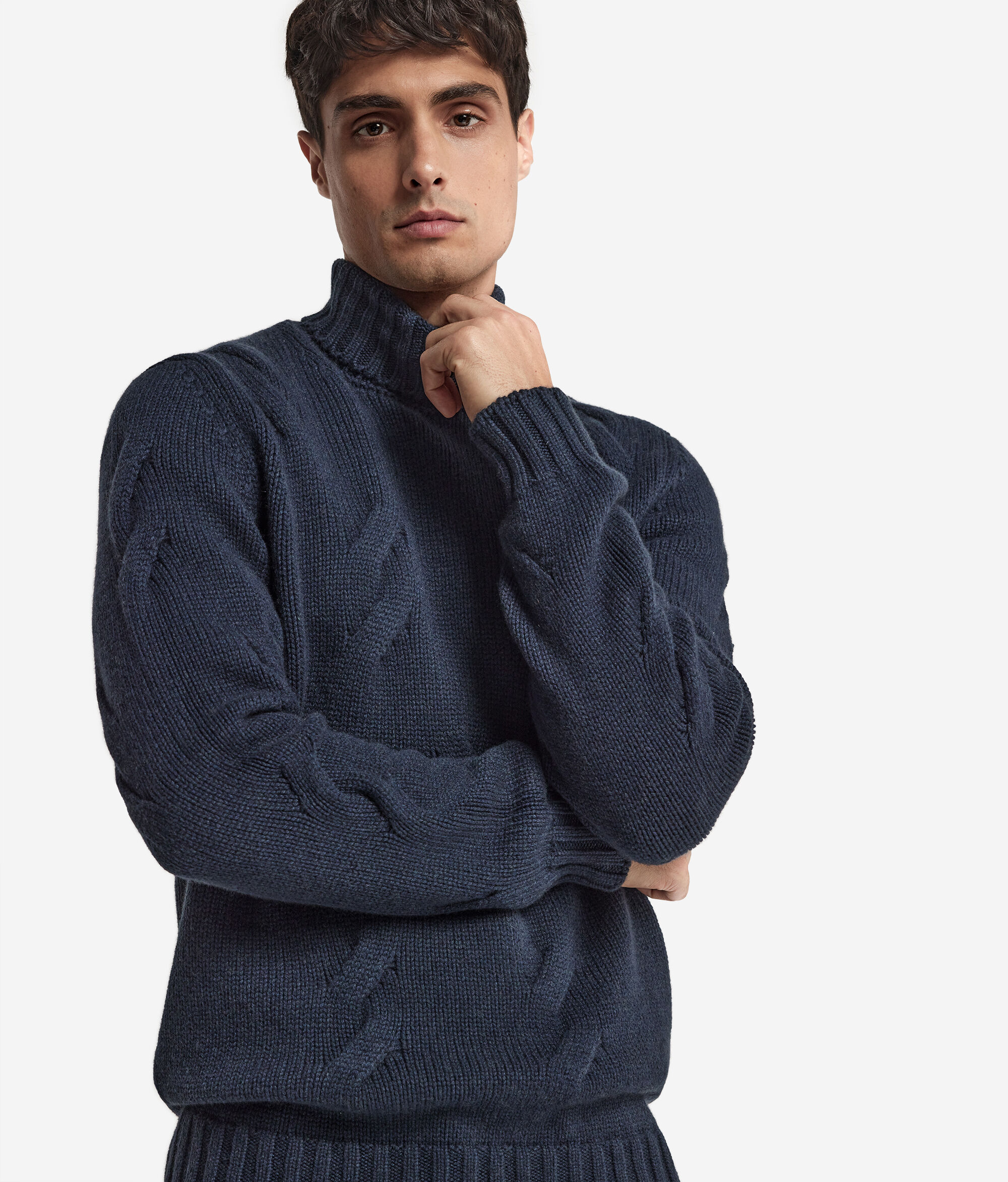 This Ultrasoft Cashmere turtleneck jumper features a refined cable pattern. Its comfort and Nordic design combine with a Regular Fit. We recommend sizing up one to two sizes for the best fit to make this garment ideal to wear all day.