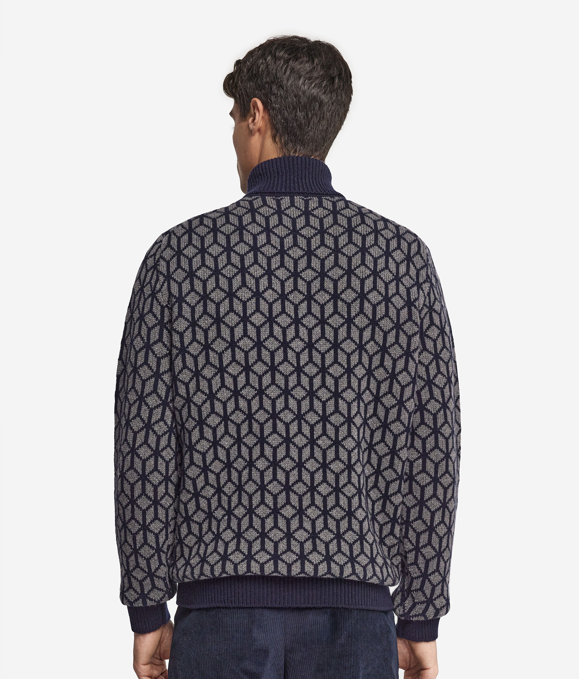 Featuring a two-tone optical jacquard pattern, this turtleneck in fine Ultrasoft Cashmere catches the eye with its modern and sophisticated design. The collar, together with the cuffs and hem, is crafted in single-coloured rib, offering a refined contrast. The pattern, created directly in the weave of the fabric, enhances the quality and workmanship of the garment.
