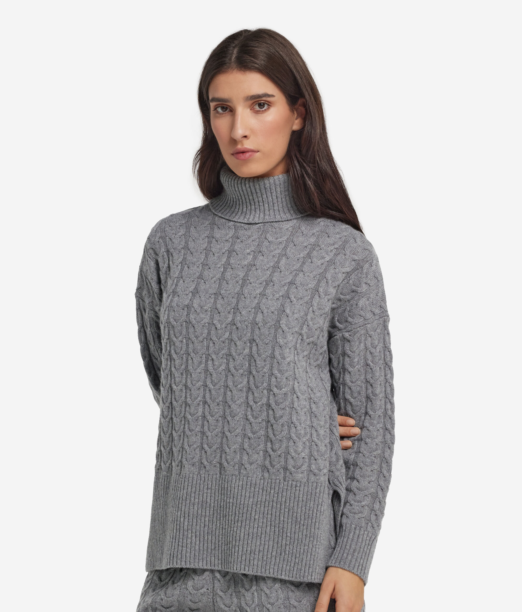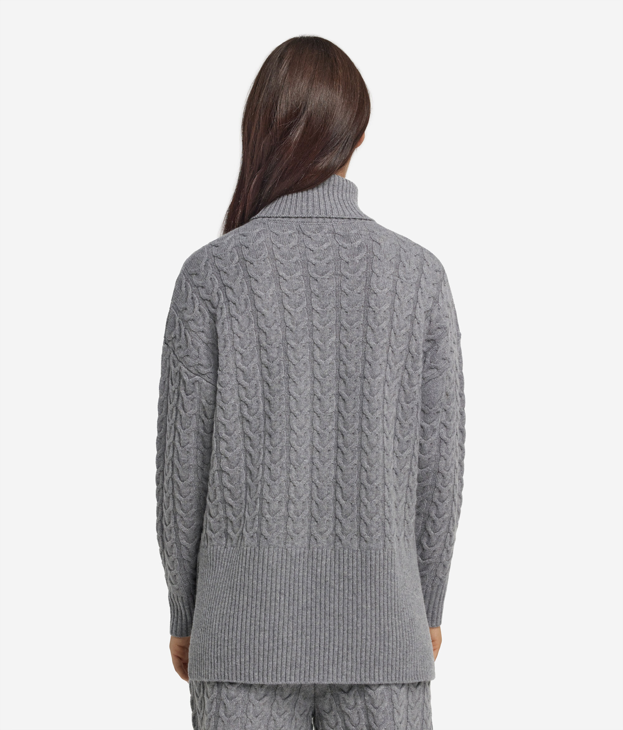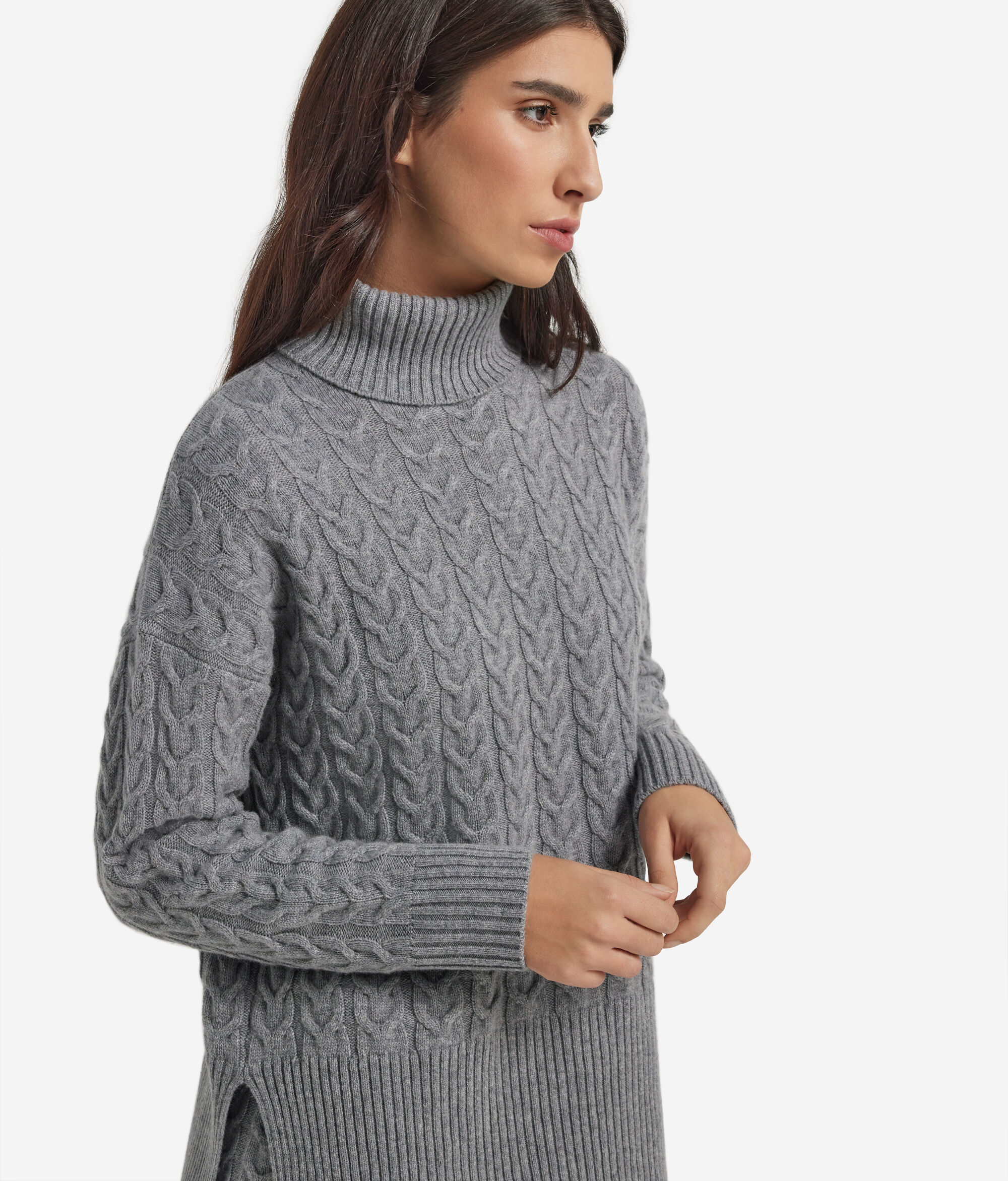 Soft and enveloping, this ultrasoft cashmere turtleneck blends comfort and elegance. The high collar and gently dropped shoulder create a refined allure, while the vertical cable stitch weave shapes the line. Ribbed details enhance the design with texture, while delicate slits at the hem add a touch of movement. The below-the-waist length and relaxed fit make it an essential companion on cooler days.