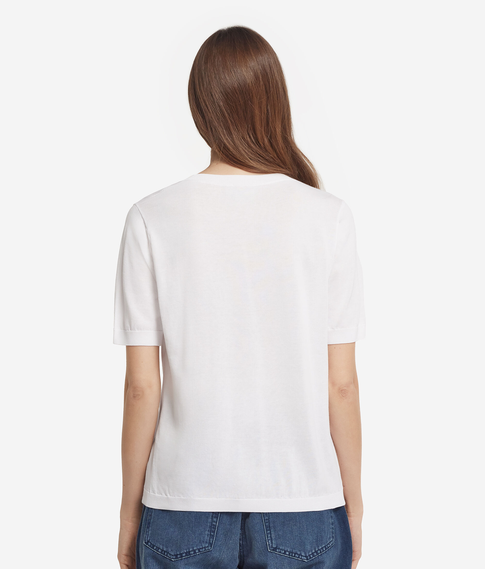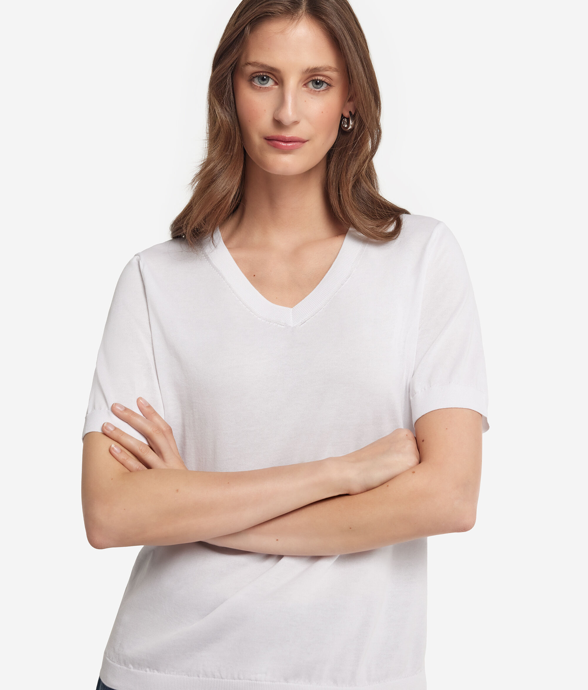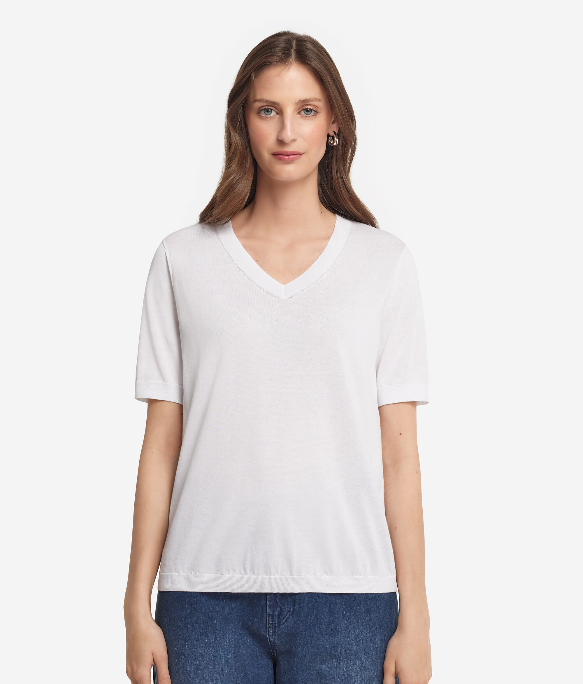 Made entirely of cotton, this T-shirt features an elegant V-neckline that beautifully frames and accentuates the neck. This garment provides a fresh, lightweight feel against the skin while maintaining attention to detail with its ribbed trim. The Regular Fit. We recommend sizing up one to two sizes for the best fit and above-the-hip length make this piece versatile and suitable for any occasion.