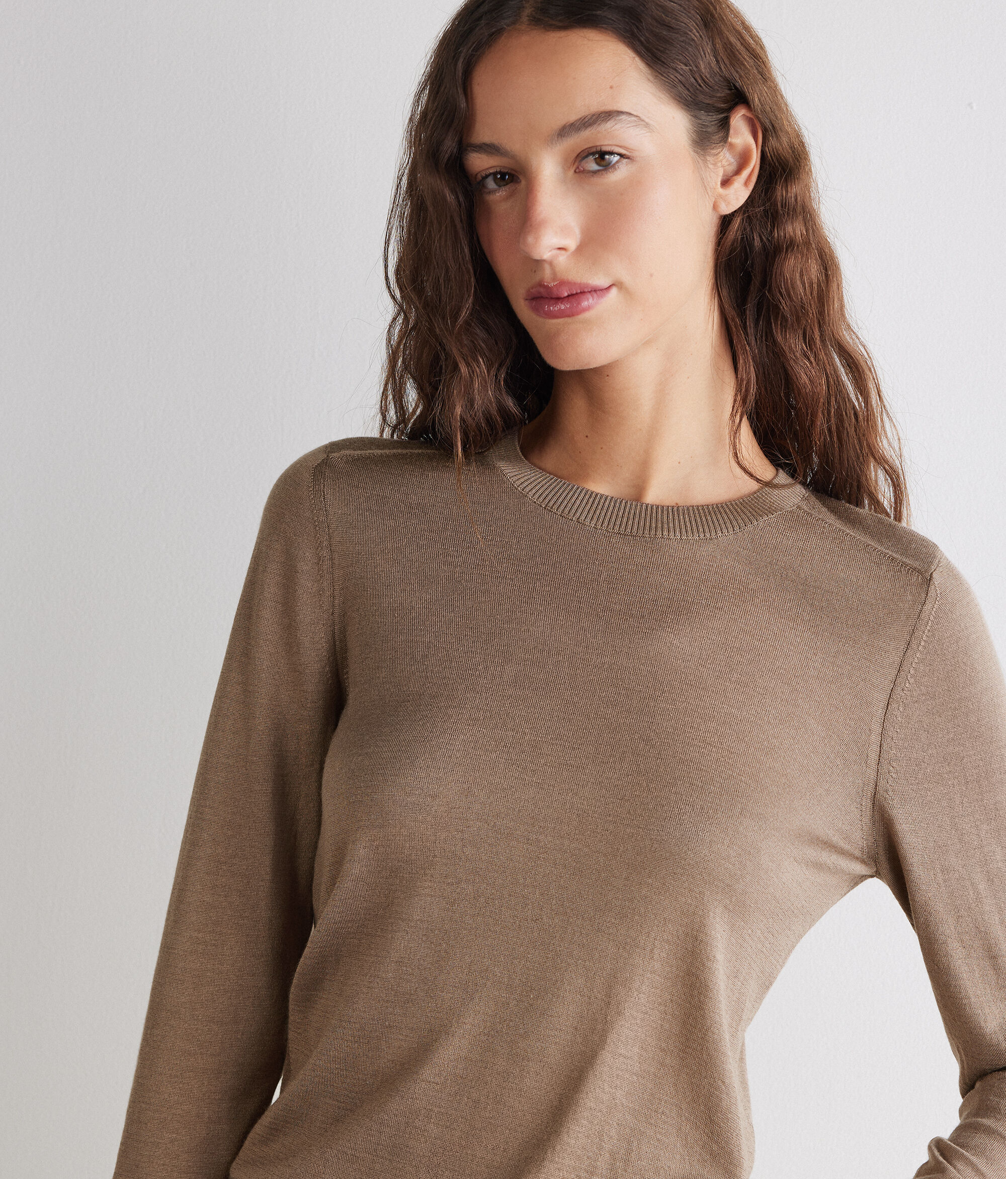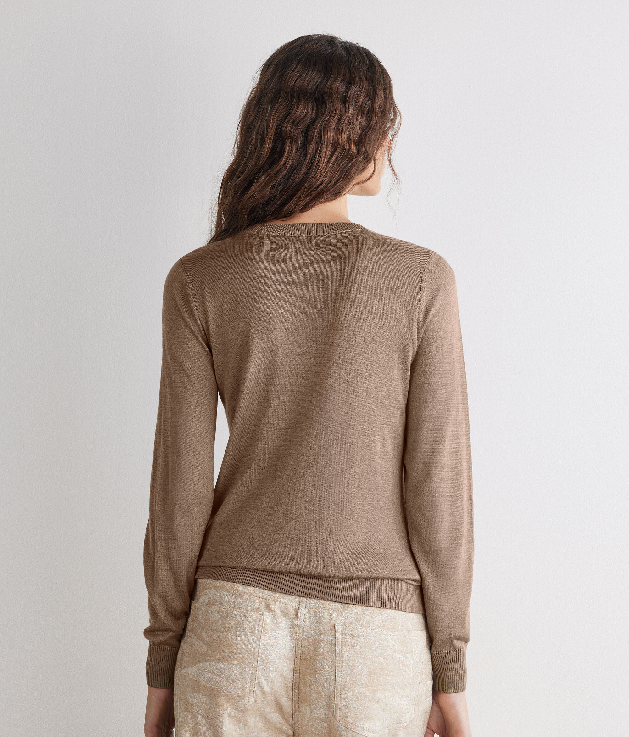 La carícia impalpable del cashmere es fusiona amb la lluentor natural de la seda en aquest jersei de coll rodó amb un encant essencial. El disseny polit adquireix caràcter en l'elaboració de canalé a l'escot, punys i baixos, detalls que donen estructura i un subtil refinament. Gràcies a un tall entallat, la peça segueix amb delicadesa les línies del cos, per a una elegància versàtil, perfecta tant per al dia com per a la nit.