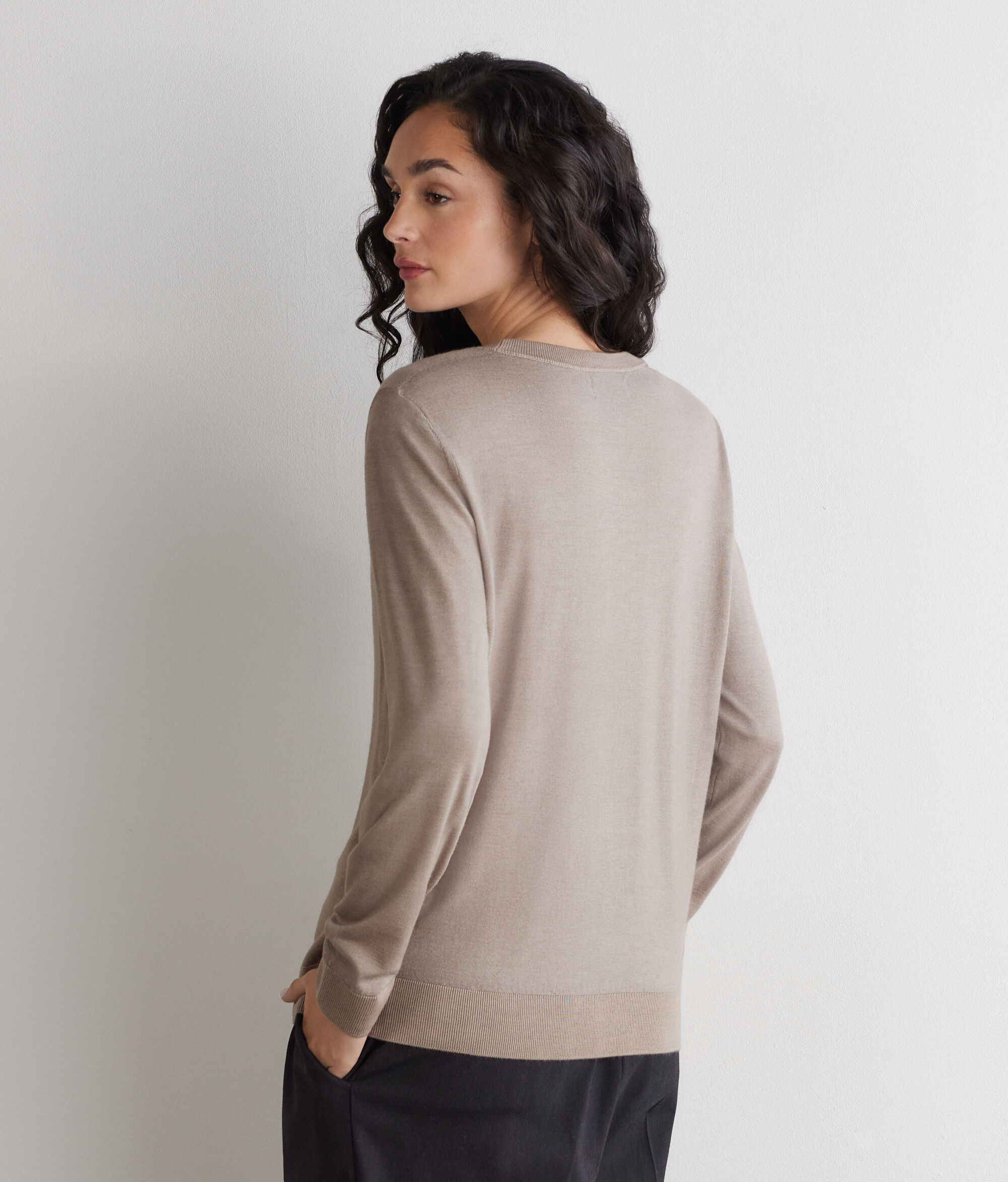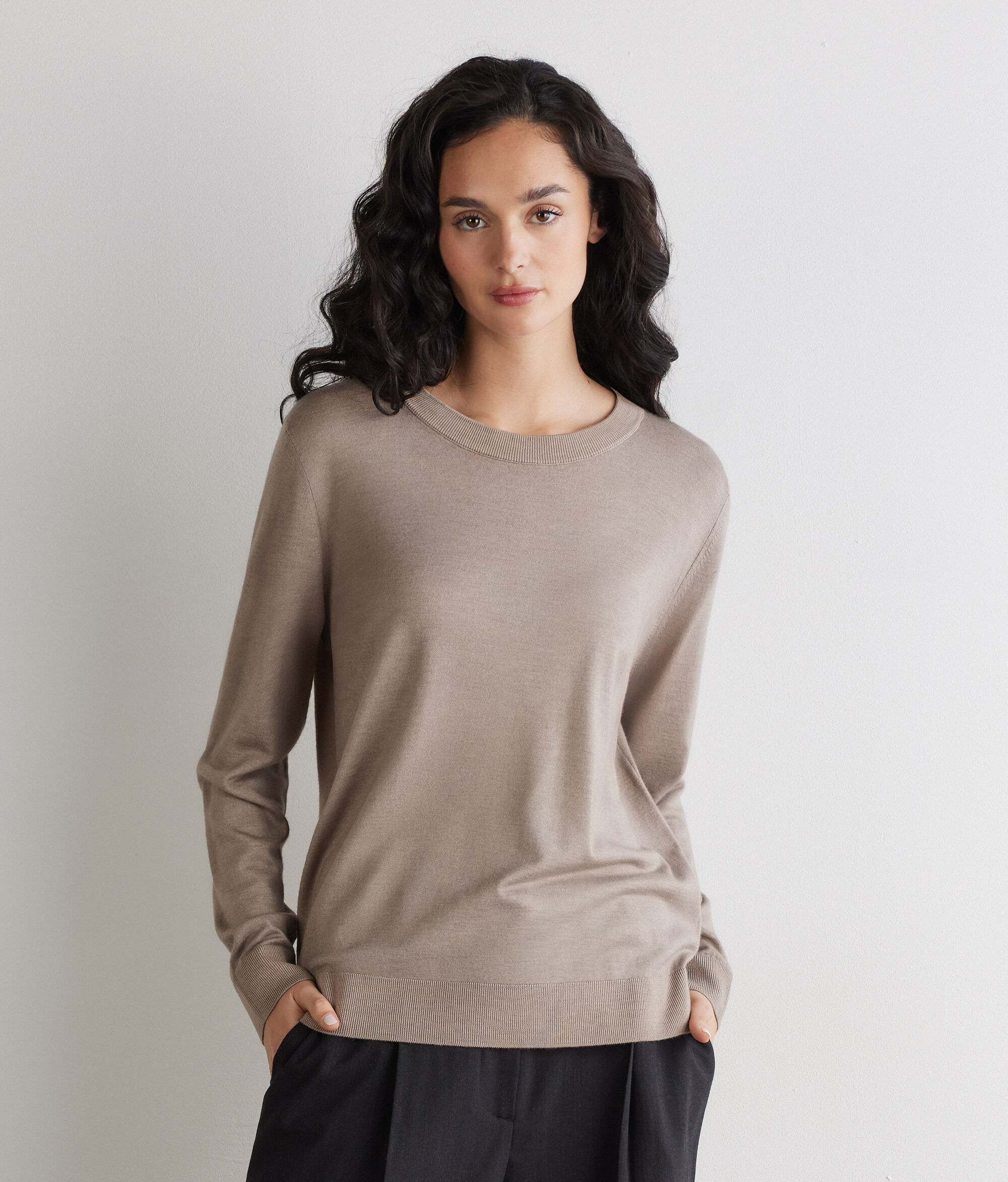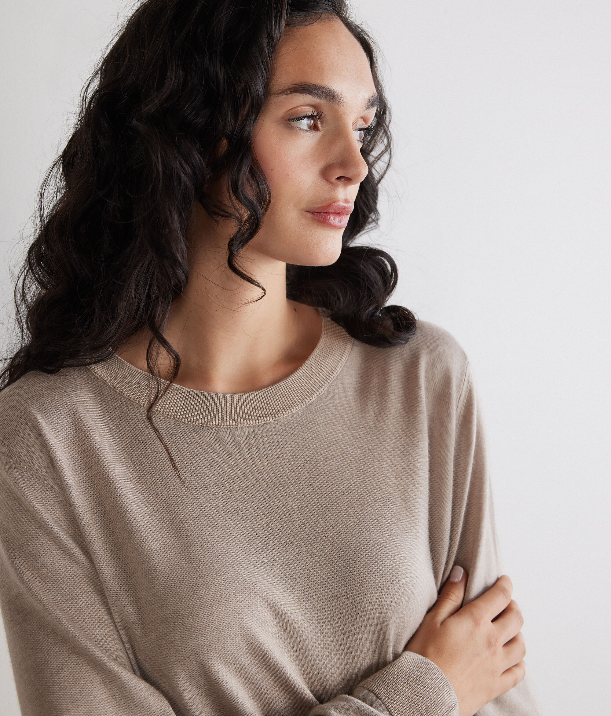 Dona un toc de luxe i comoditat al teu armari amb aquest jersei de coll rodó de preuat cashmere ultrafine. El disseny s'enriqueix amb un acabat de canalé a l'escot, punys i baixos que dona un toc de classe a l'estil polit de la peça. Perfecte per a la feina o per al temps lliure, serà una peça imprescindible en els dies més frescos.