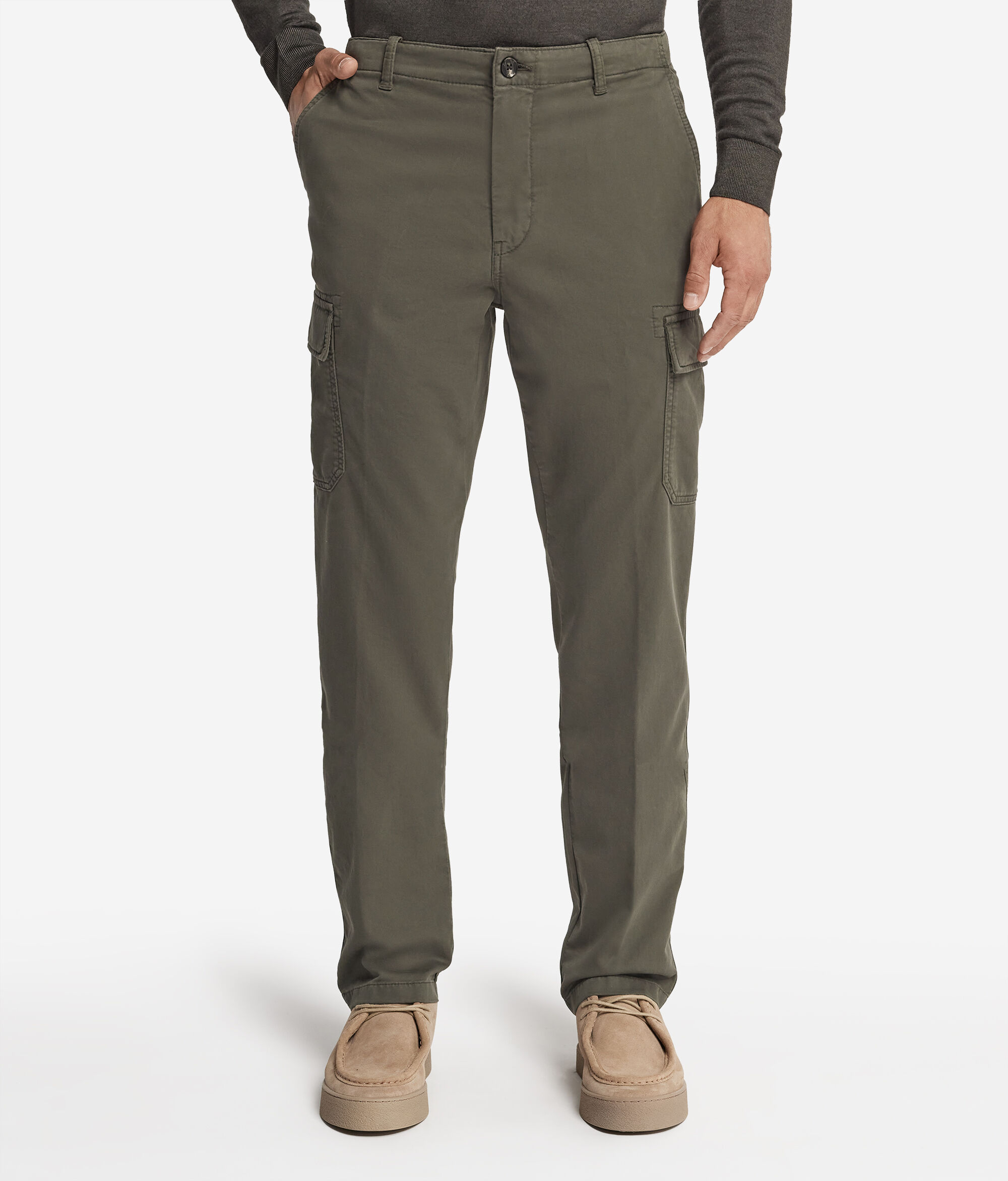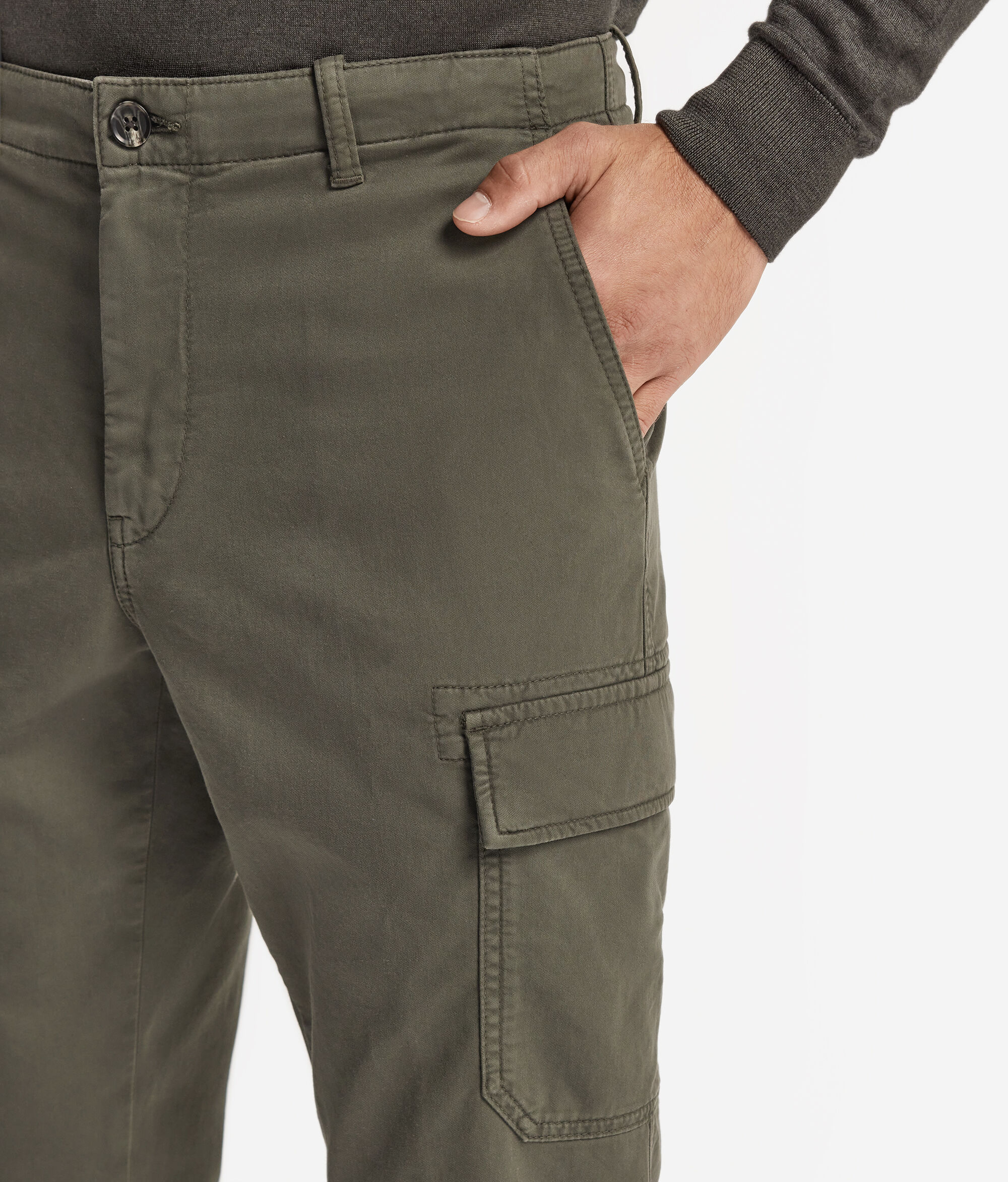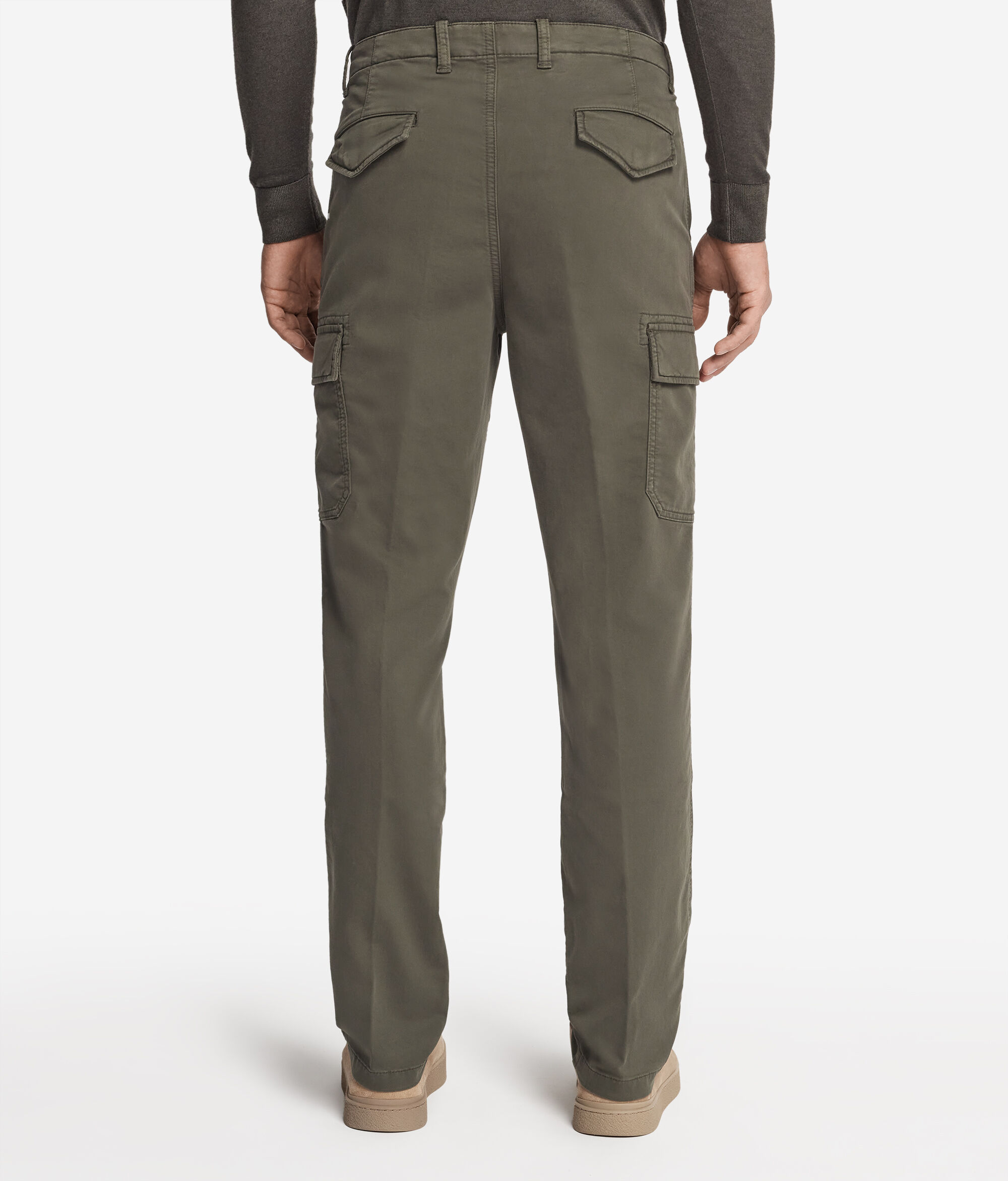 Confeccionats totalment amb cotó amb tintura de peces confeccionades, aquests pantalons representen una peça essencial per a l'armari que combina qualitat i estil. Es caracteritzen per la presència de dues butxaques als costats aplicades amb tancament de pressió amb botons. Les butxaques posteriors de trau donen un efecte minimalista i endreçat. Completa el look el cinturó interior personalitzat amb un brodat en contrast, un detall únic i distintiu.