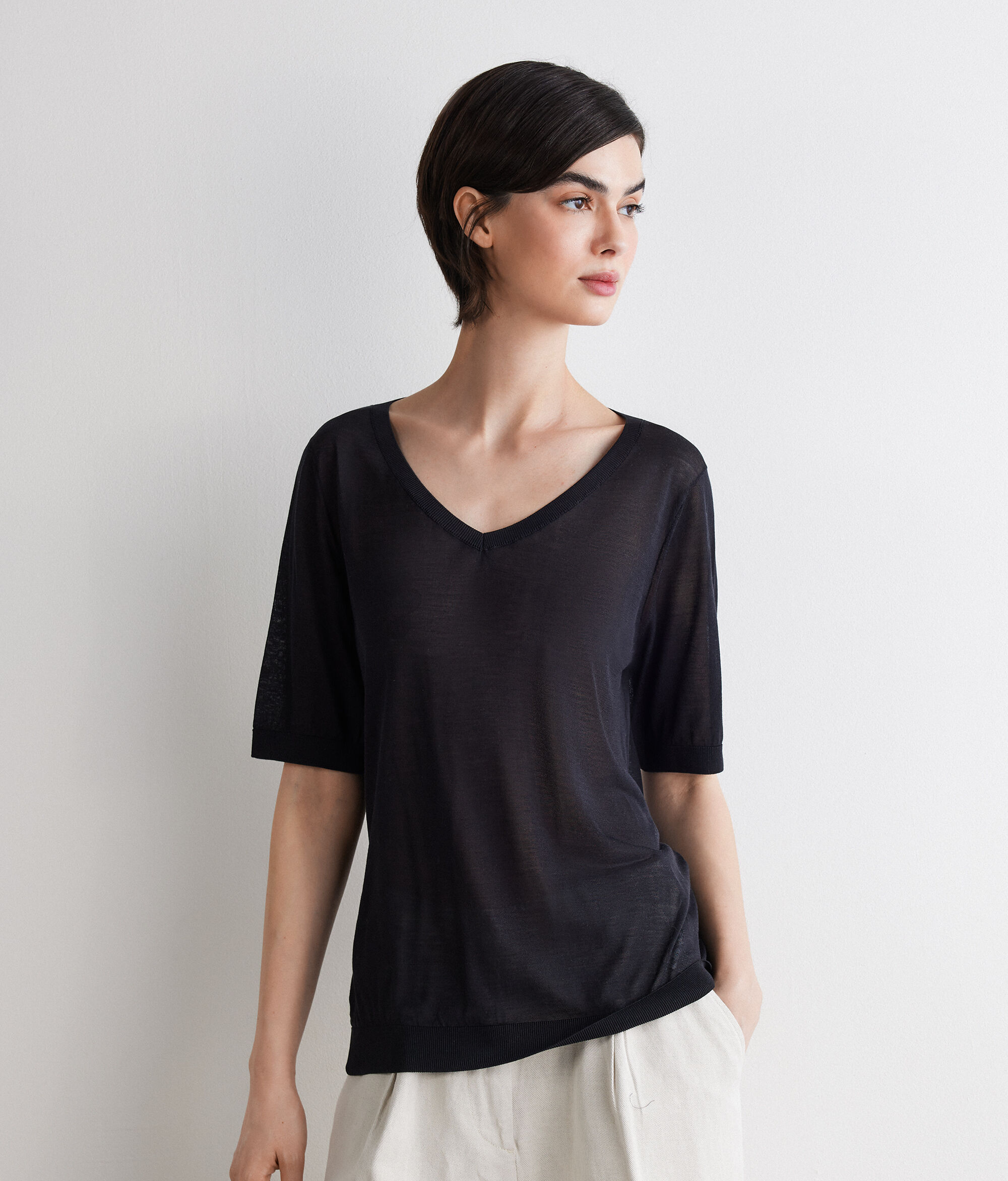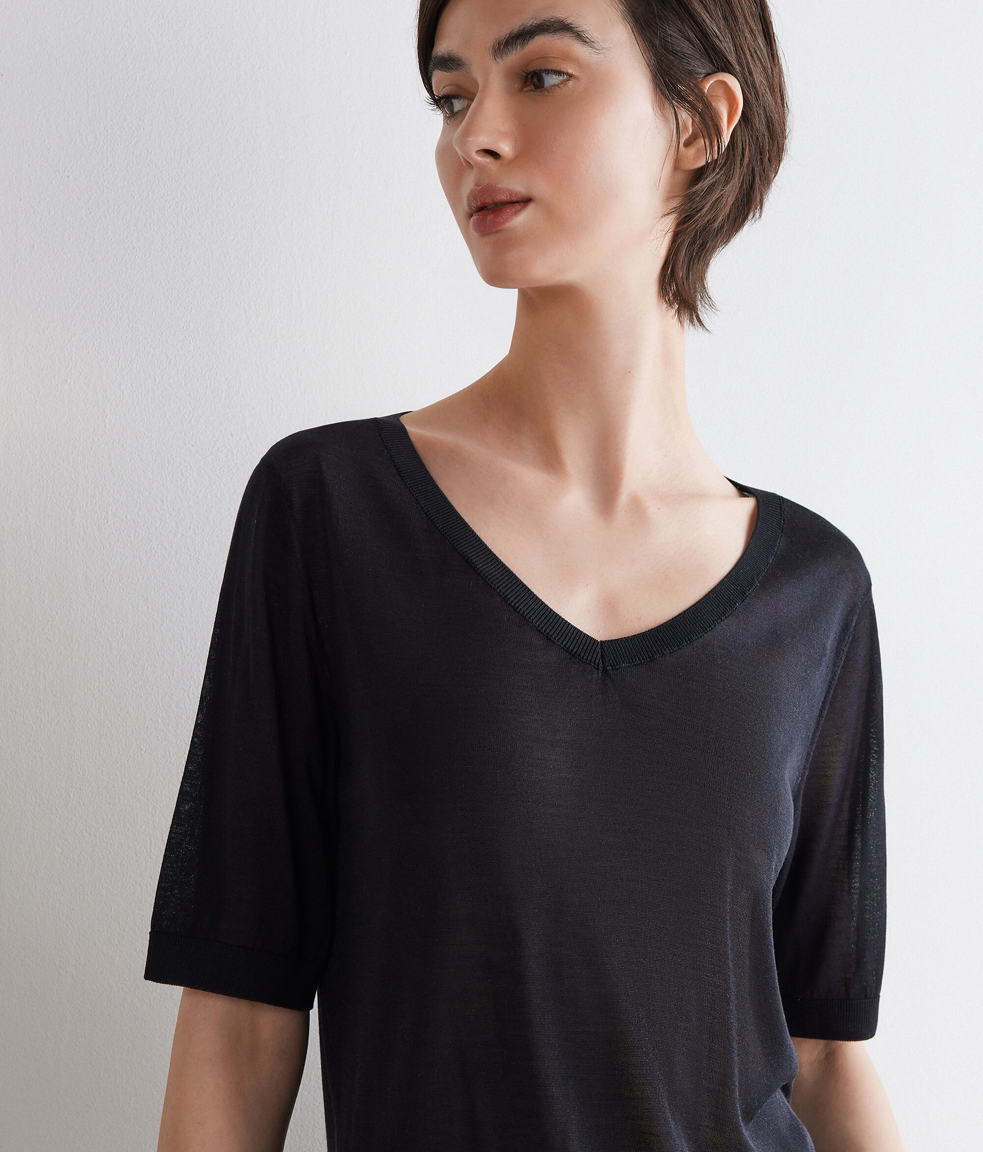 Samarreta amb escot en punta d'esplèndida seda, amb una textura lleugera i lluminosa. L'espatlla i tall estàndards garanteixen comoditat i línies harmonioses, mentre que els acabats de canalé als baixos i mànigues afegeixen un detall refinat. La llargada estàndard la fa una peça versàtil, ideal per portar sola o amb capes.