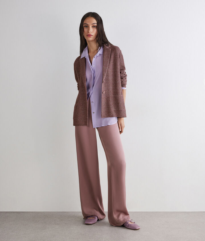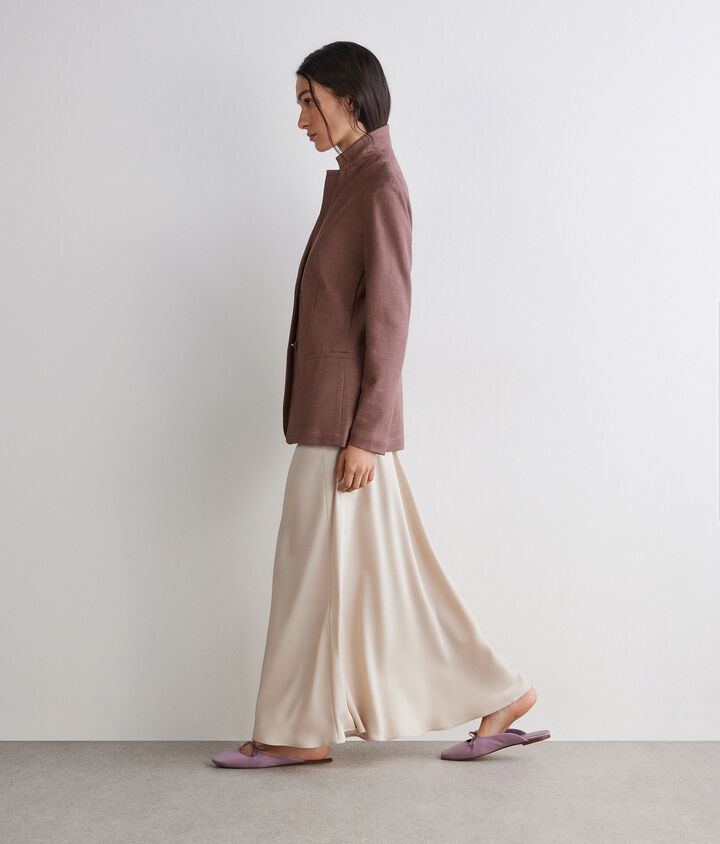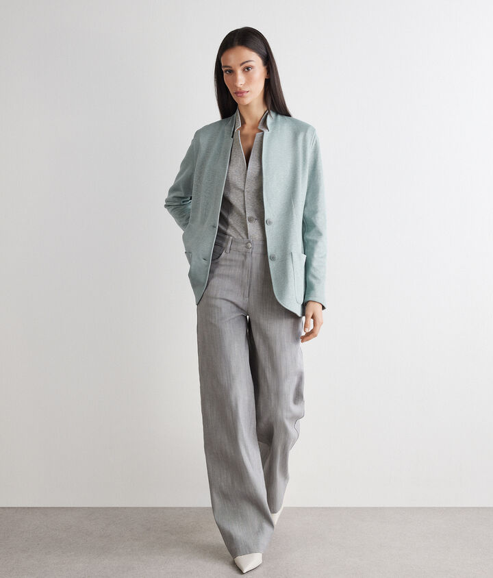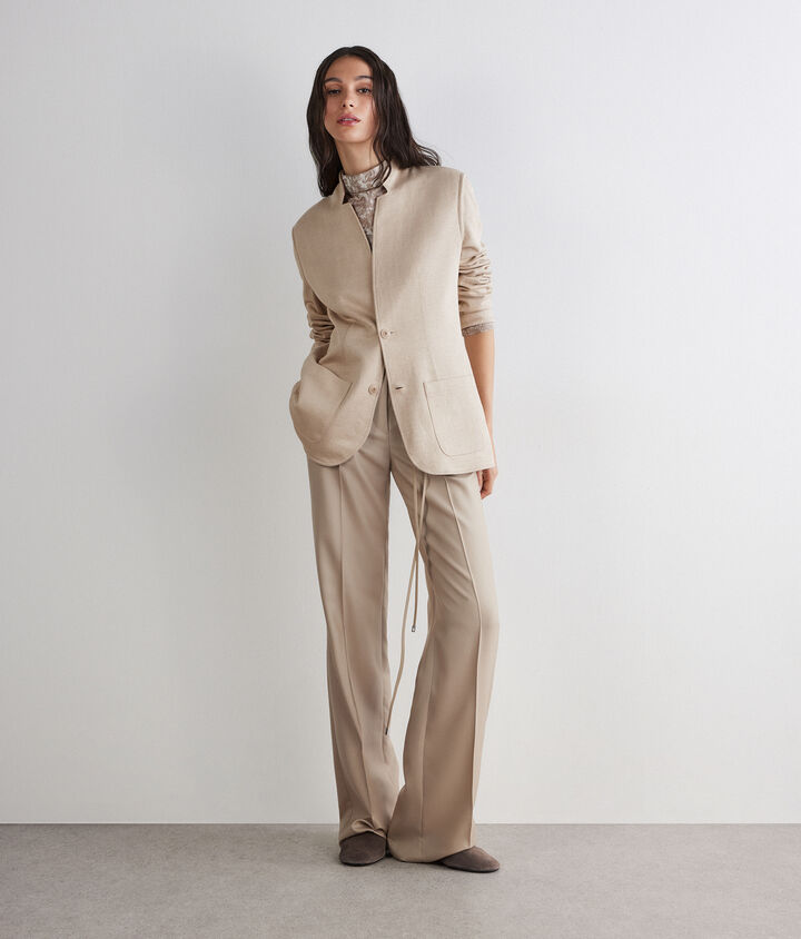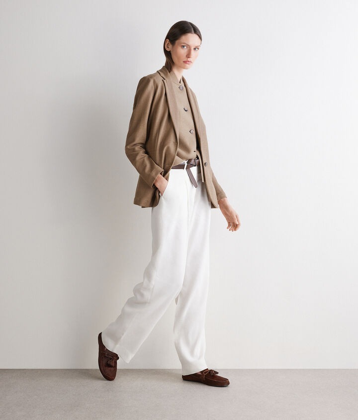 Combina un blazer de mujer en cashmere con unos pantalones palazzo para una apariencia elegante y moderna, o apuesta por una chaqueta corta de tweed con una falda de tiro alto, creando un conjunto femenino y sofisticado, ideal para cualquier evento formal o profesional.