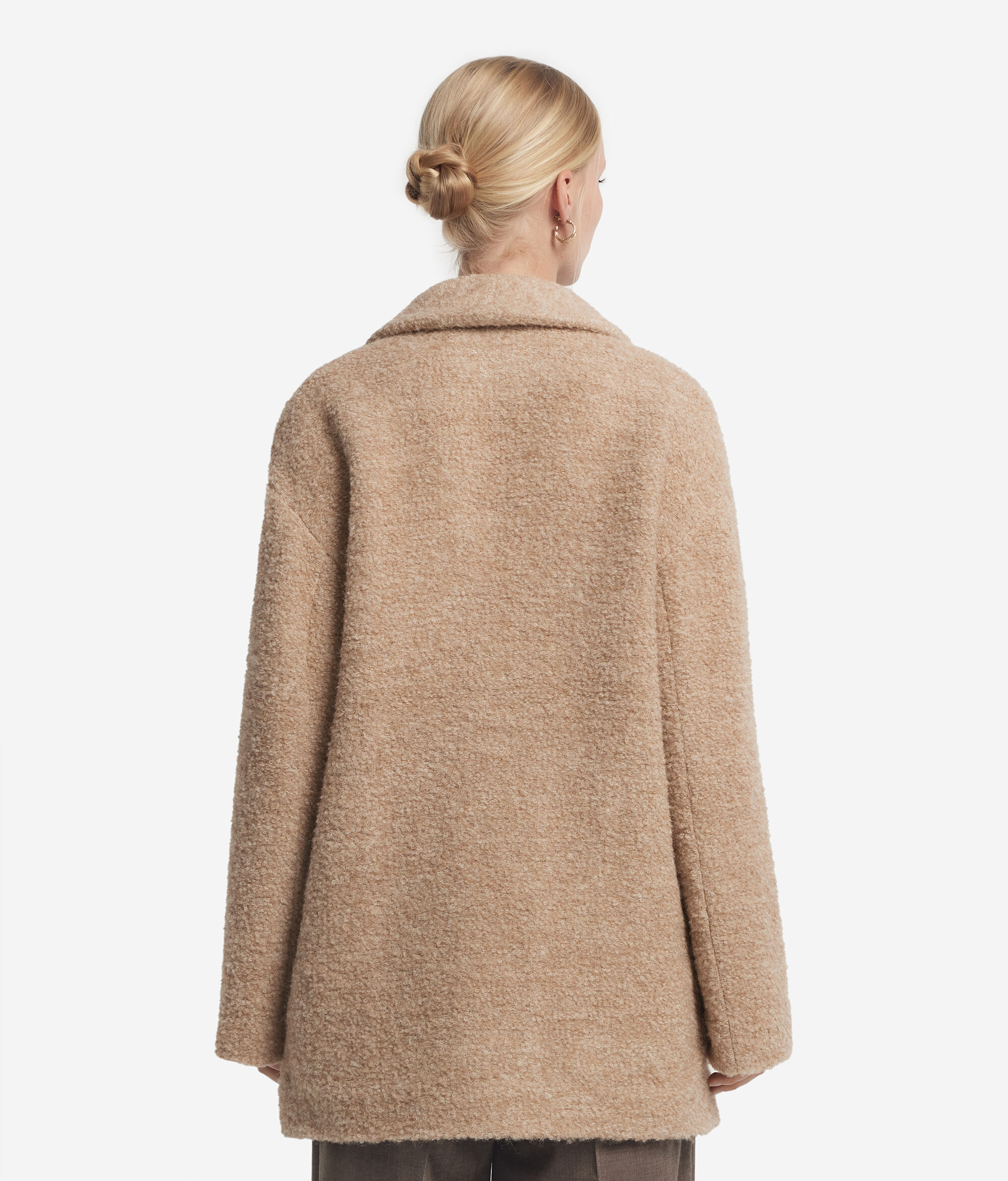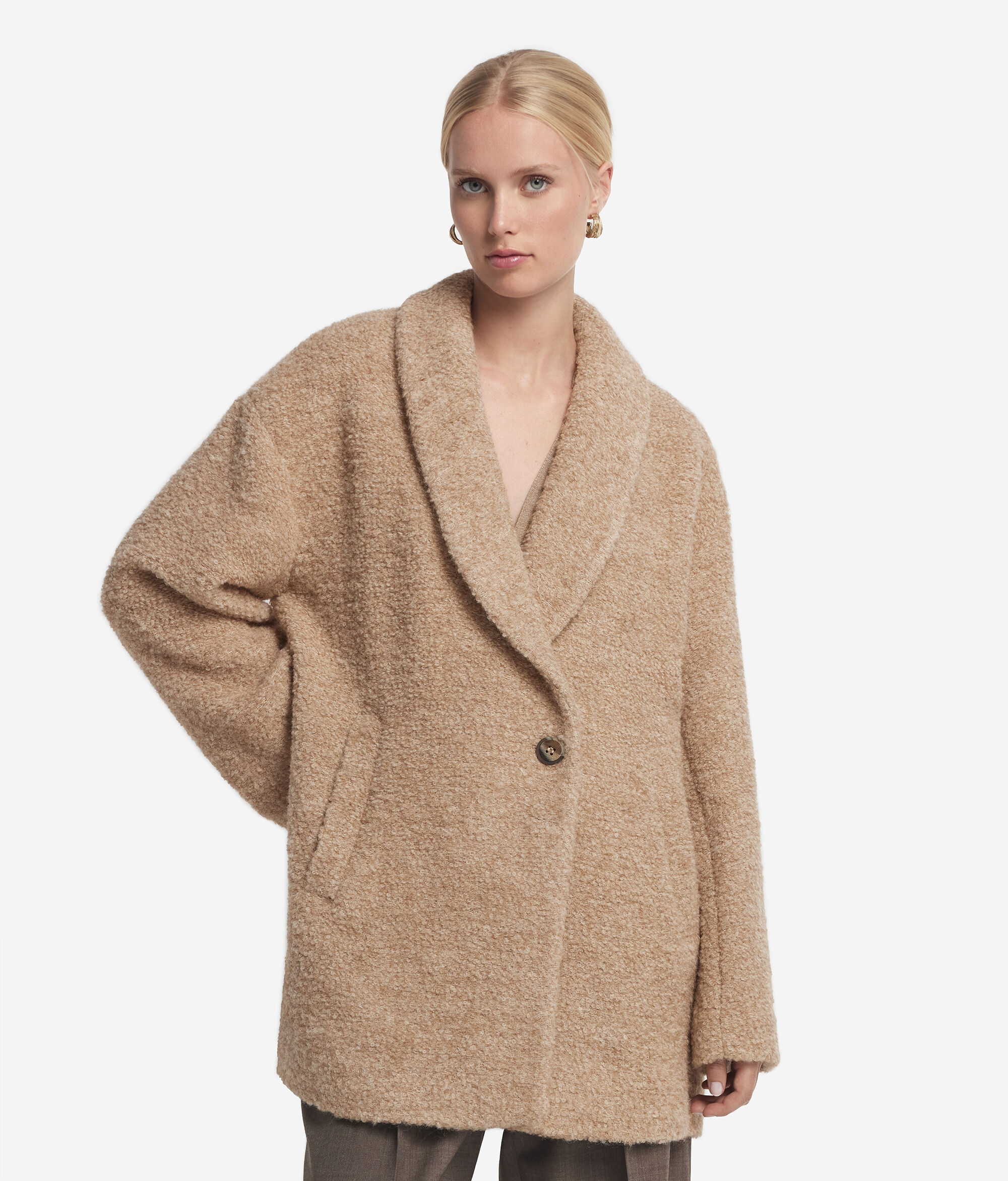 Envolvente y con cuerpo, este abrigo en tejido bouclé de lana alpaca se distingue por su textura cálida y sofisticada. La solapa redonda y el hombro caído delinean una silueta relajada, enfatizada con un corte muy holgado. El cierre de botonadura sencilla con botones y los amplios bolsillos aplicados completan su diseño funcional pero sofisticado. El largo hasta la rodilla hace que resulte ideal para lucir un estilo desenfadado y contemporáneo, perfecto en los meses más fríos.