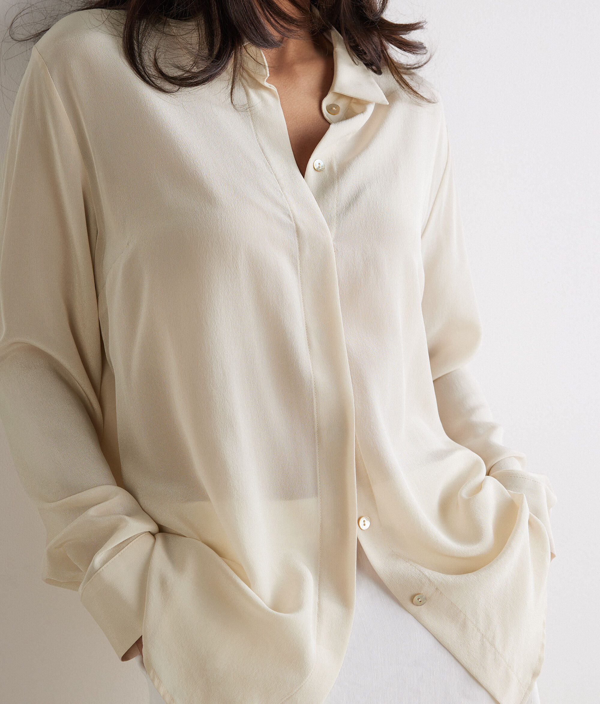 Descubre la elegancia atemporal de esta camisa confeccionada en crepé de China. El diseño, de líneas limpias y básicas, está adornado con un cuello clásico y un cierre con botones. Sobria pero claramente refinada, no puede faltar en el armario de quienes adoran la calidad y el estilo sin concesiones.