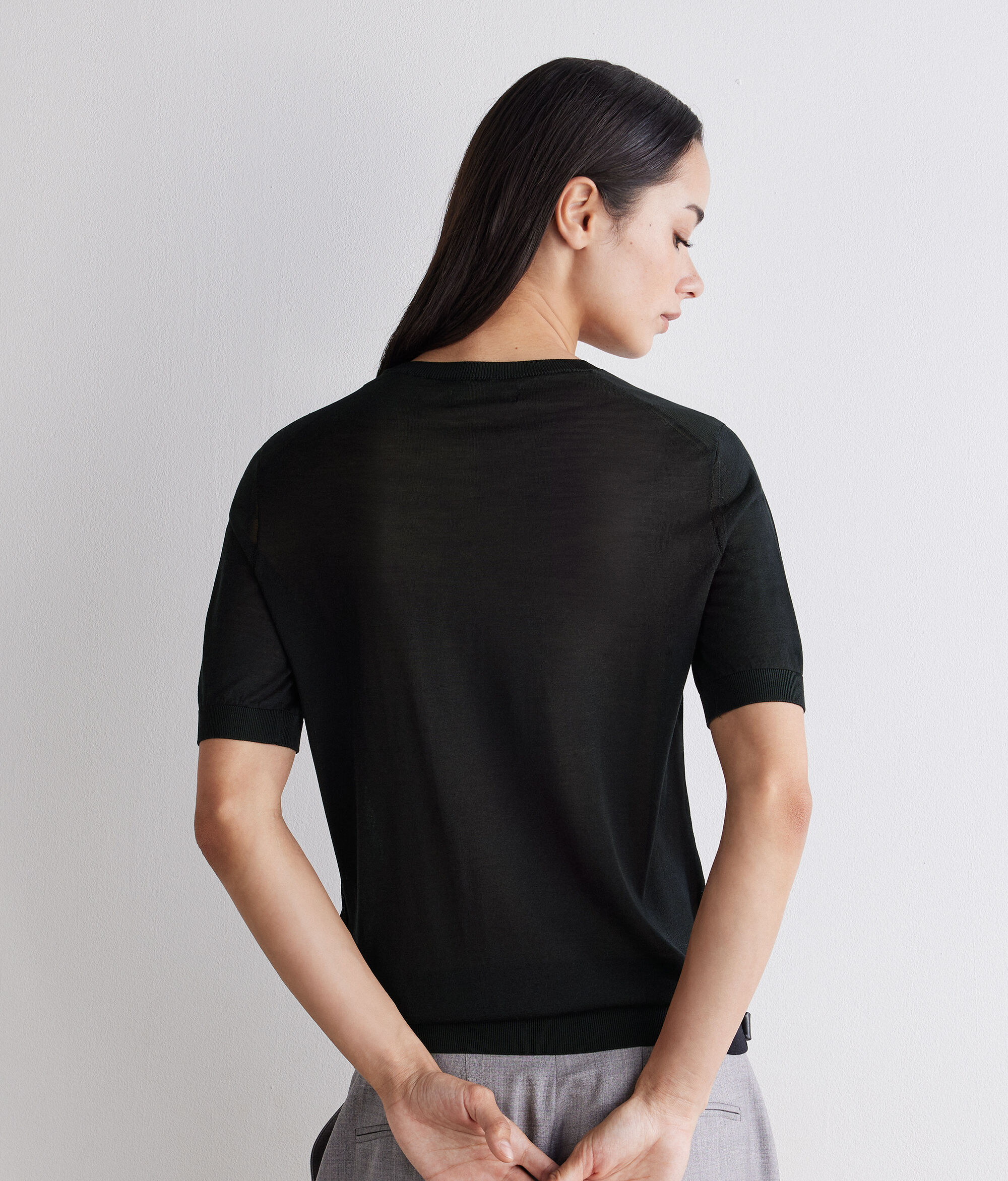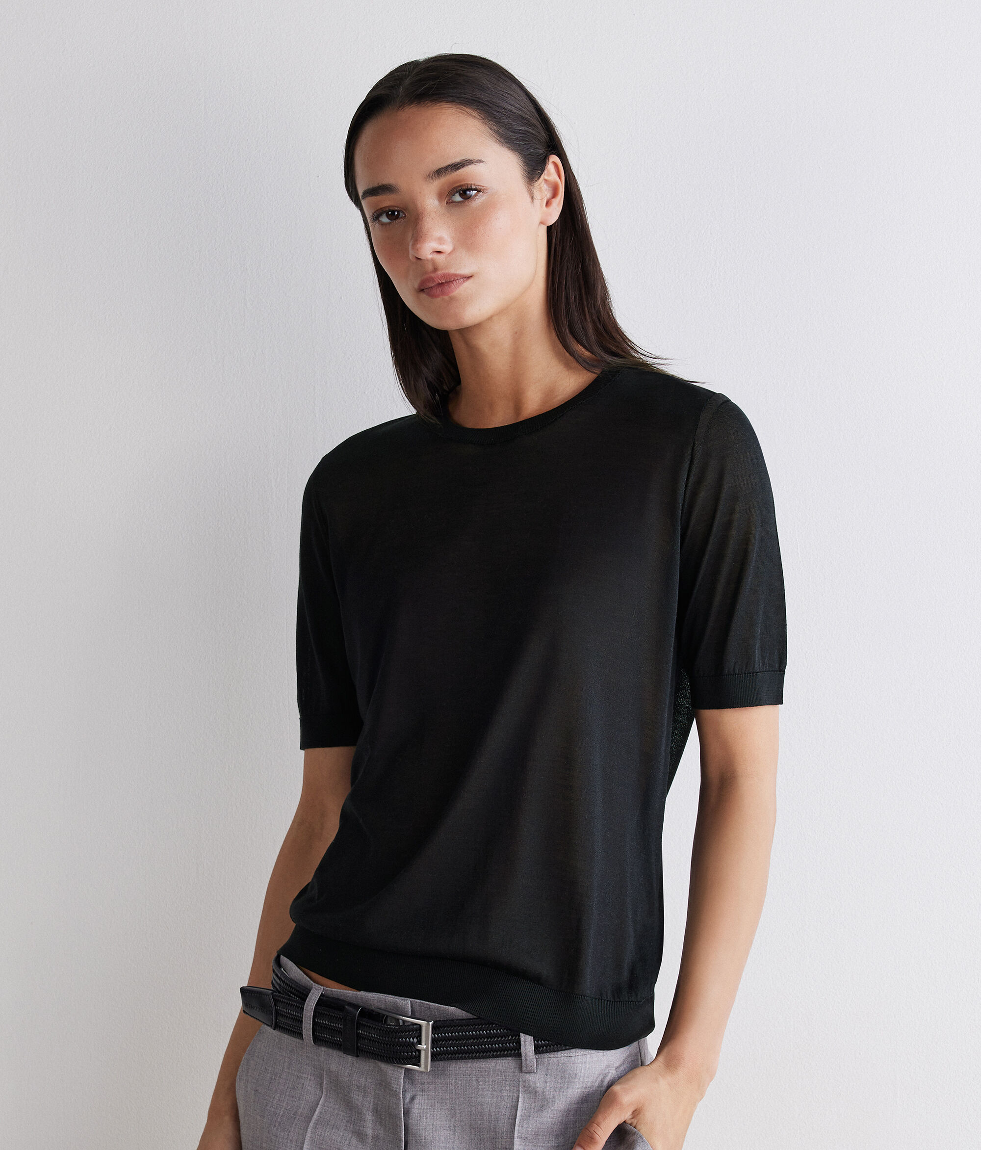 Camiseta con cuello redondo en punto de seda de textura ligera y luminosa, confeccionada meticulosamente por manos expertas para resaltar su elegancia natural. Su corte entallado con hombro estándar realza la figura, mientras que los remates acanalados del bajo y las mangas completan su diseño con un toque sofisticado. De corte estándar, es perfecta para llevarla sola o creando superposiciones.