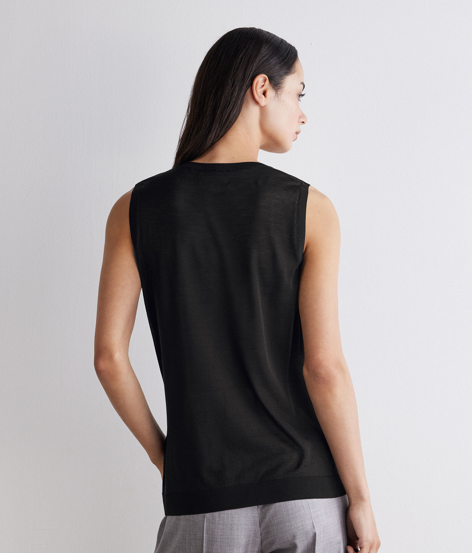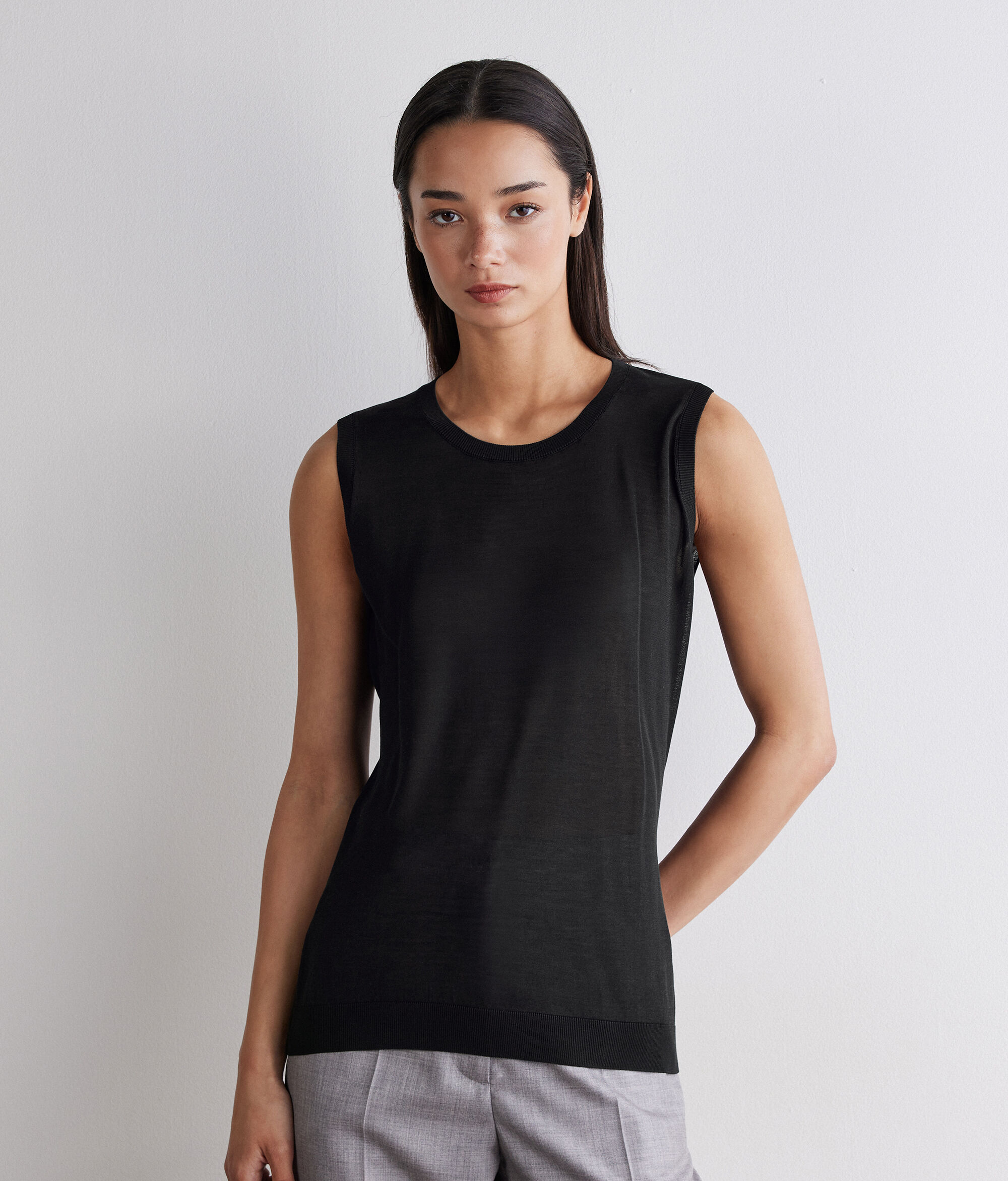 Confeccionada en punto de seda de alta gama, esta camiseta sin mangas se distingue por su diseño esencial y versátil. Los remates con detalles acanalados en los bordes añaden textura a esta prenda de corte entallado. Ligera y sofisticada, es perfecta para llevarla sola o debajo de una chaqueta o un blazer.