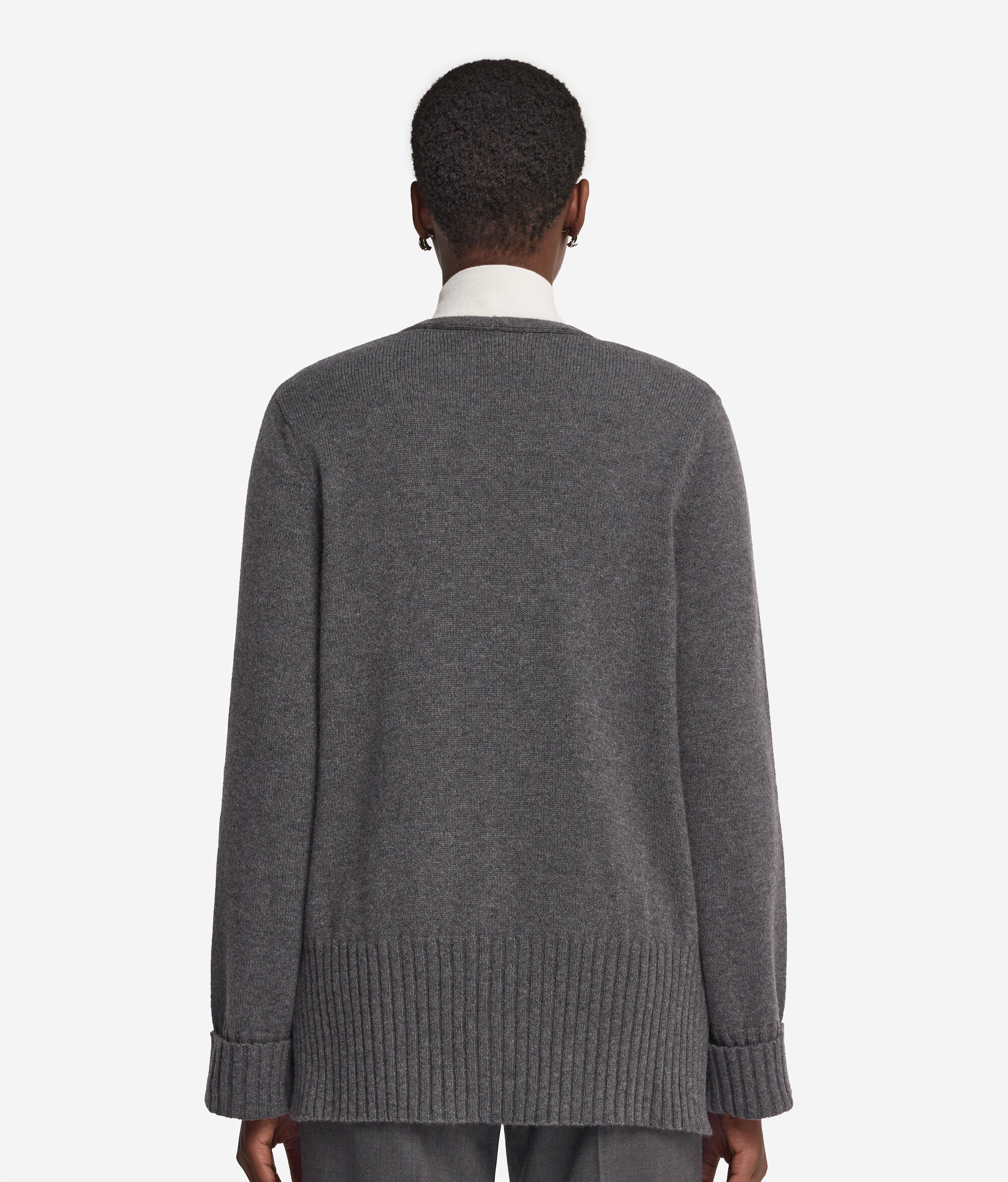Este cárdigan con cuello de pico combina la excelente calidad del cashmere ultrasoft y una exclusiva confección artesanal dando vida a una prenda que conjuga delicadeza y carácter con maestría. El cierre frontal con tres botones tono sobre tono aporta un toque de elegancia y sobriedad, mientras que las aberturas del bajo añaden fluidez y movimiento a su diseño. El remate de canalé del borde y de los puños con vuelta embellece la prenda confiriéndole un aspecto impecable y distintivo.