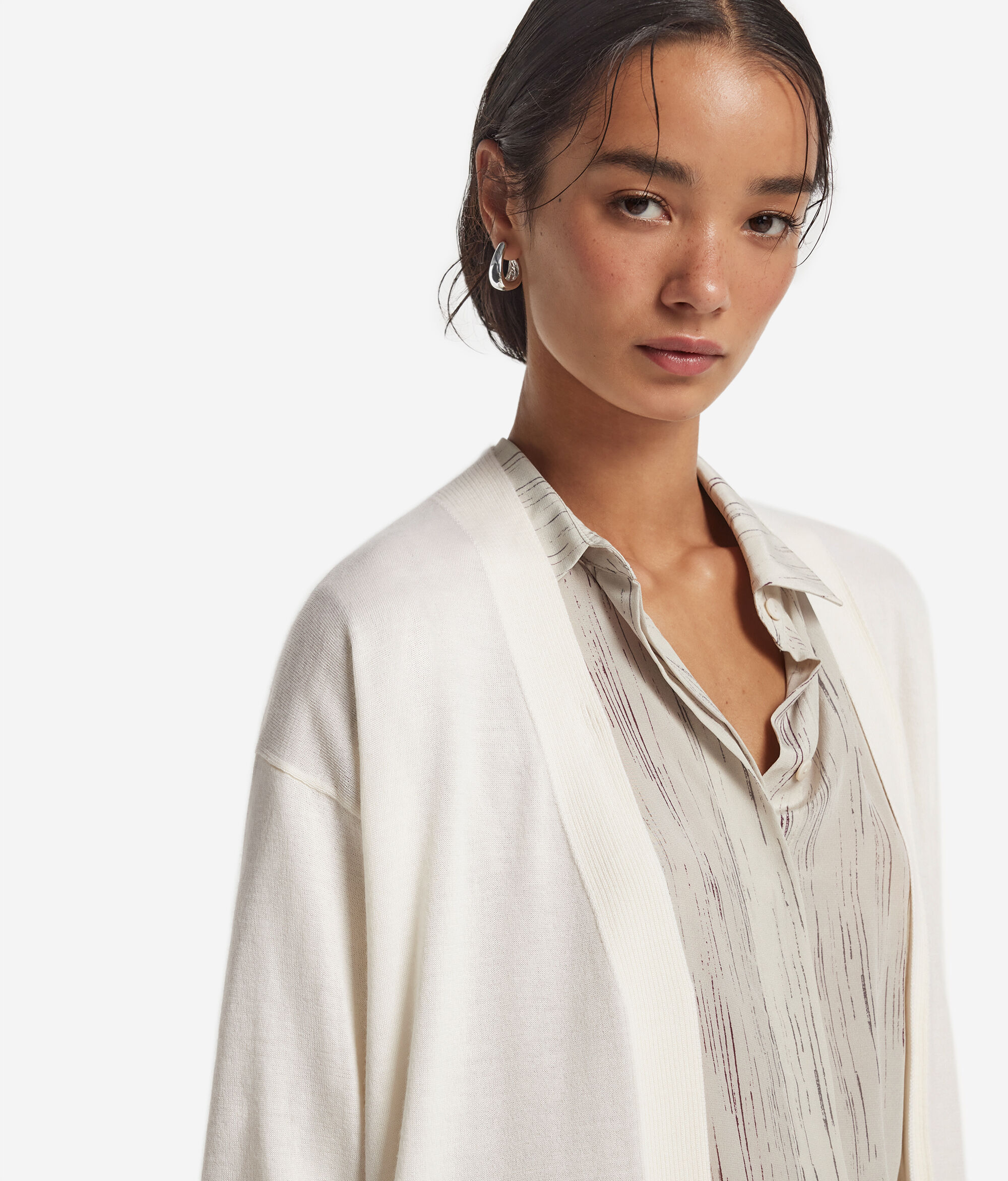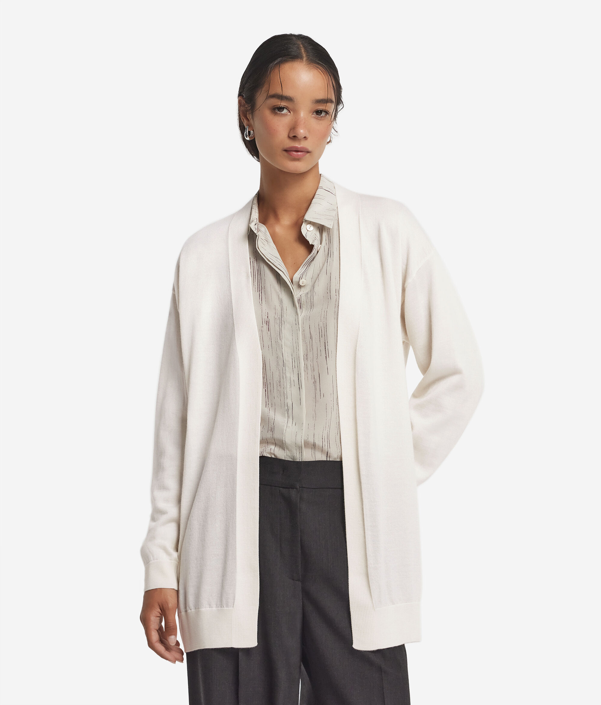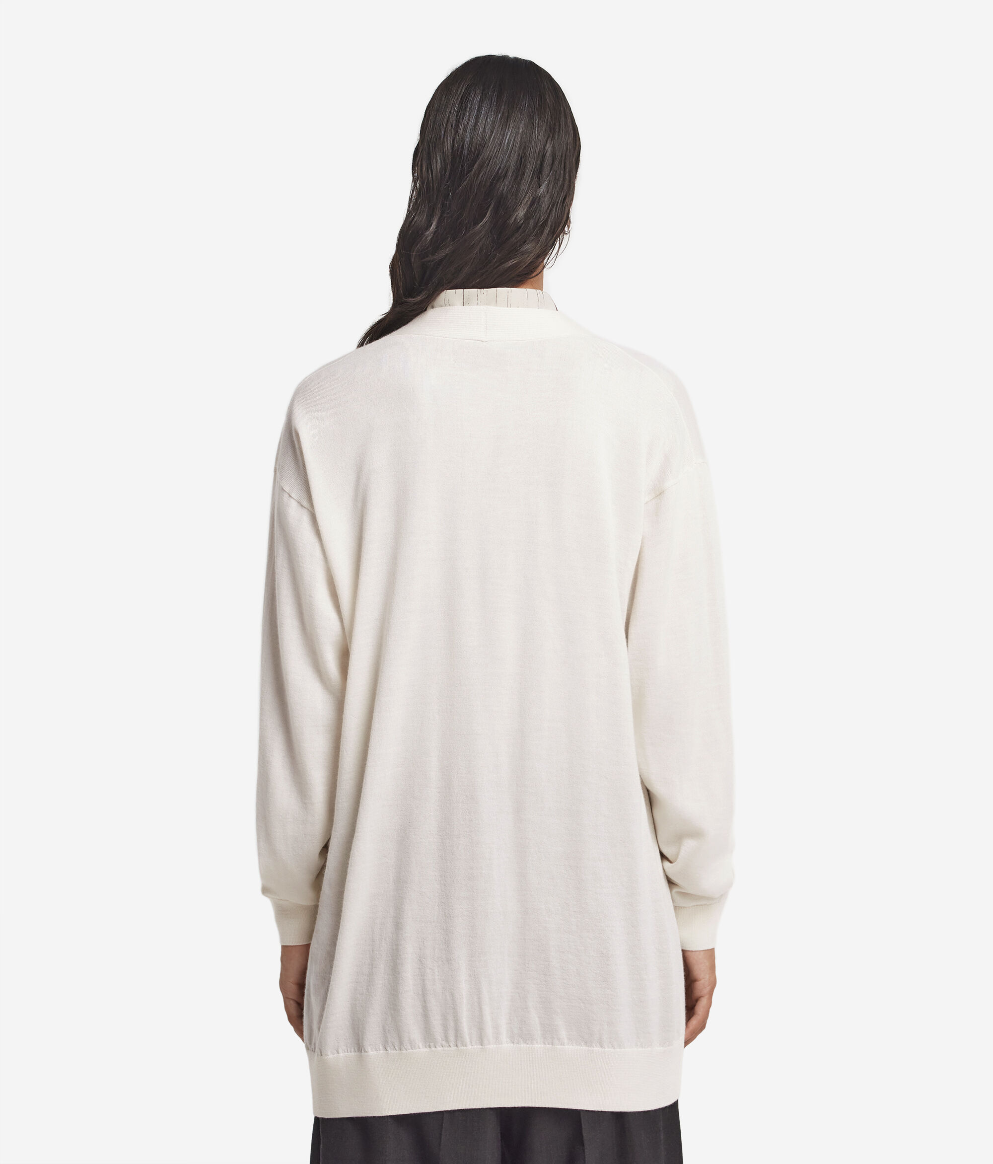 Caracterizado por su corte holgado con hombro caído, que le imprime un estilo relajado, este cárdigan en preciado cashmere ultrafine es una prenda envolvente y ligera que asegura el máximo confort. Abierto en el delantero y rematado con un delicado punto de canalé, presenta un largo por debajo de la cadera que lo convierte en una prenda versátil, ideal para completar cualquier look y en cualquier época del año.