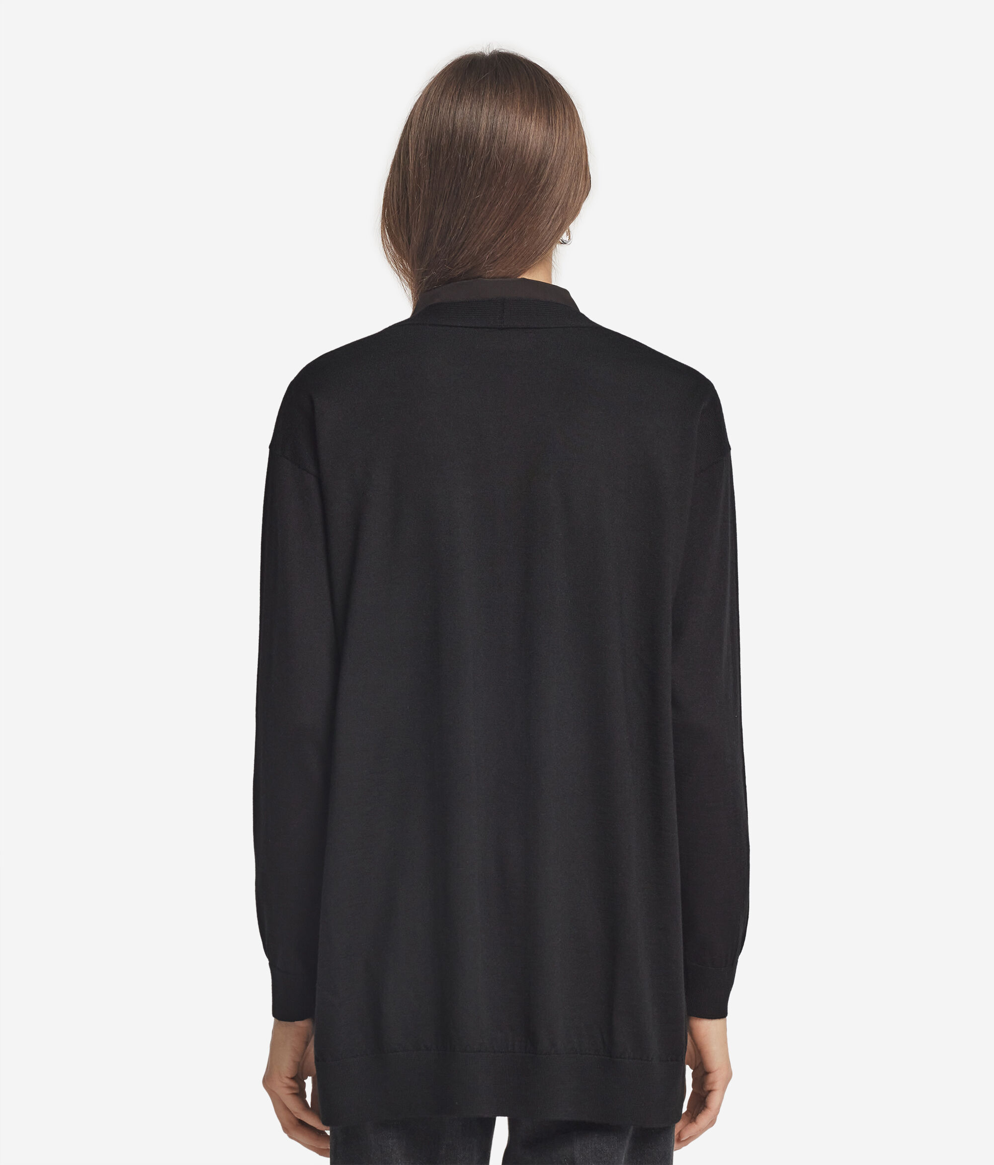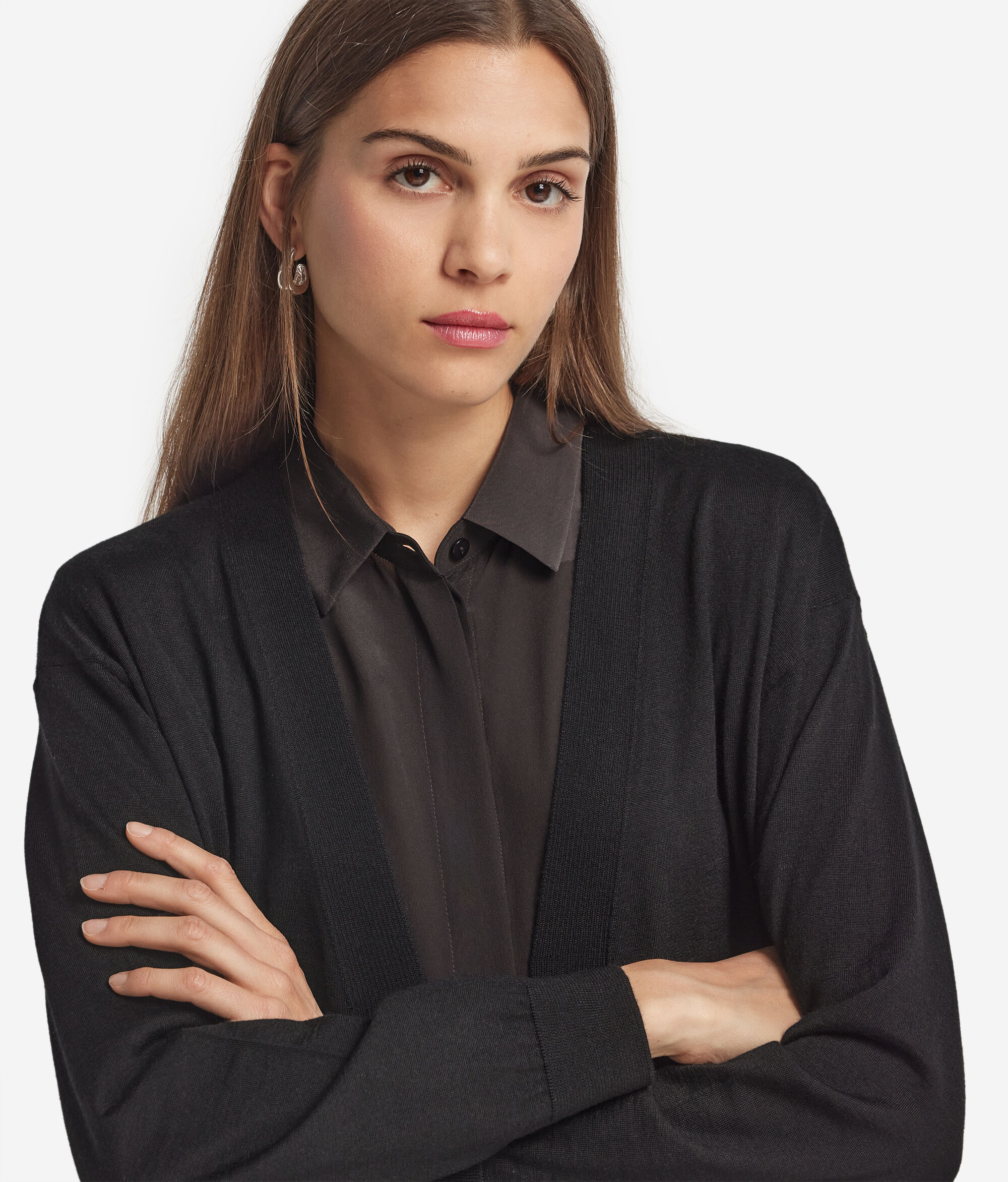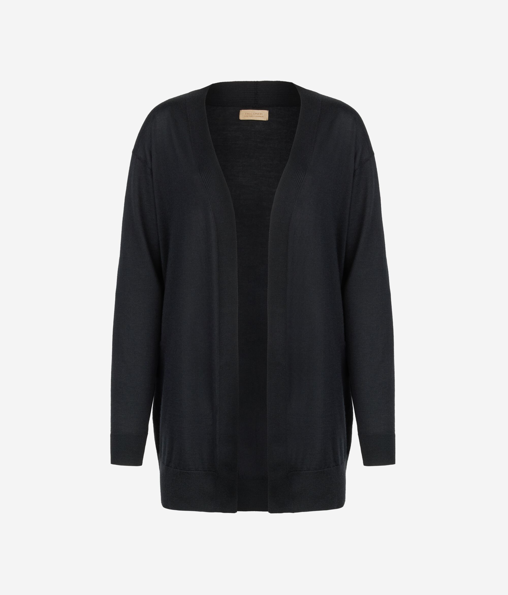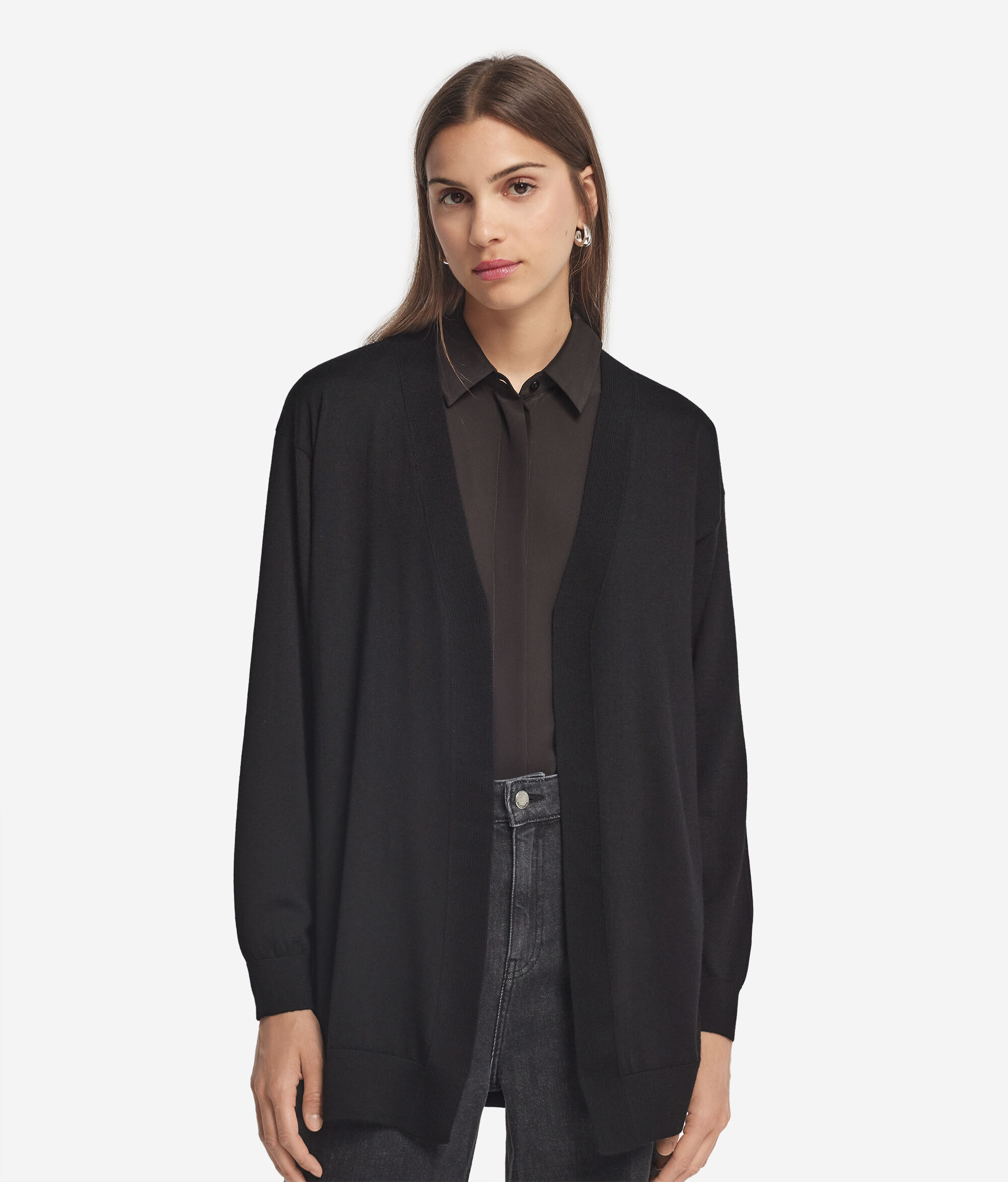 Caracterizado por su corte holgado con hombro caído, que le imprime un estilo relajado, este cárdigan en preciado cashmere ultrafine es una prenda envolvente y ligera que asegura el máximo confort. Abierto en el delantero y rematado con un delicado punto de canalé, presenta un largo por debajo de la cadera que lo convierte en una prenda versátil, ideal para completar cualquier look y en cualquier época del año.