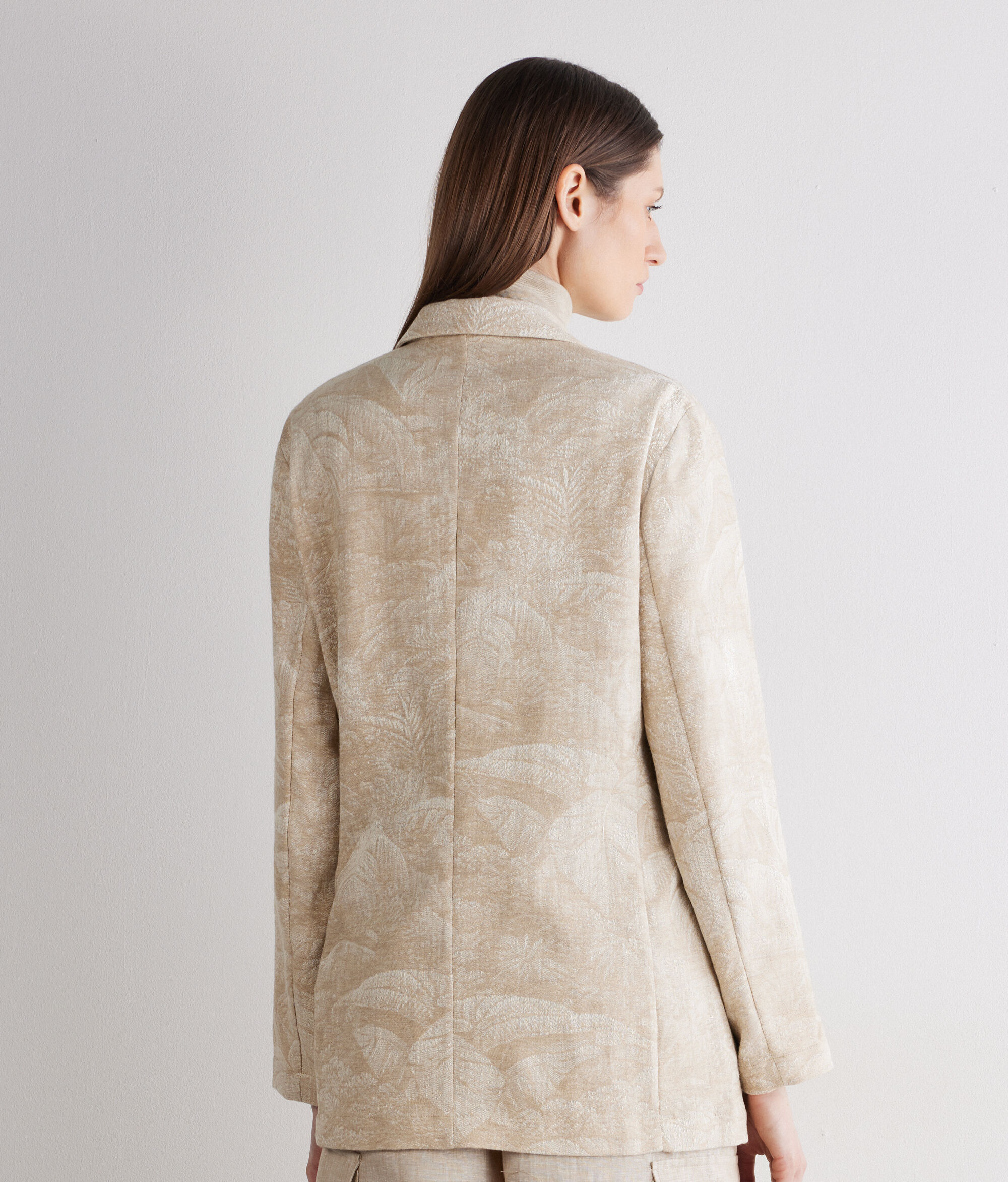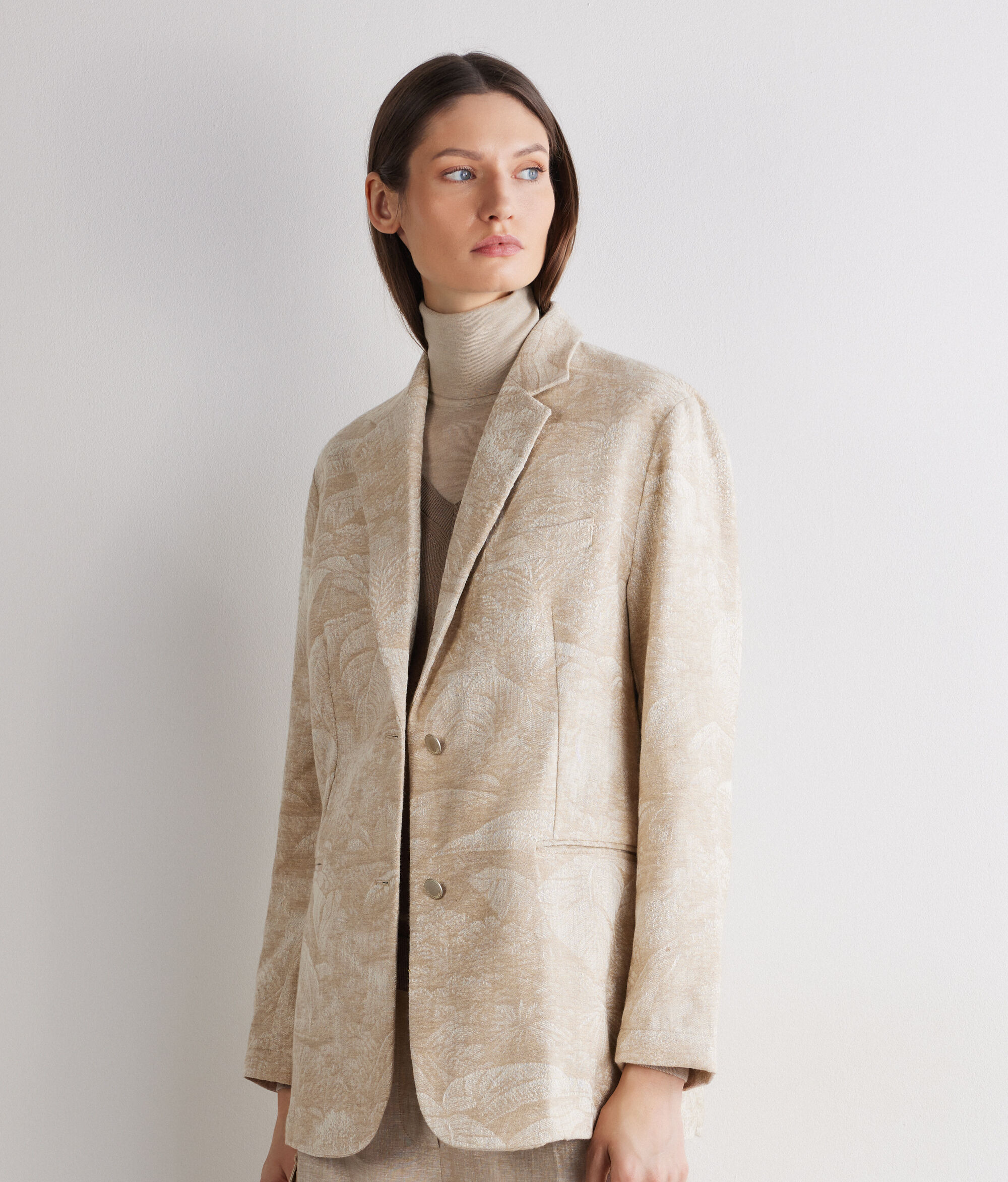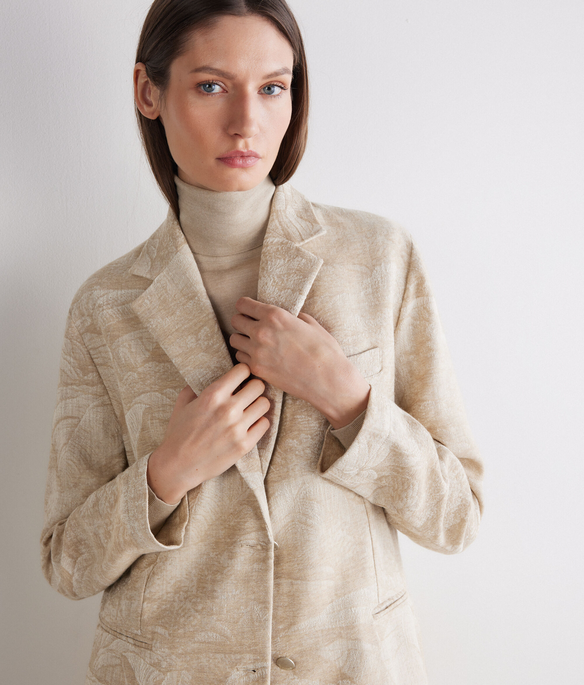 Esta chaqueta de algodón se distingue por su trama rica y sofisticada que, gracias al motivo jacquard realizado directamente en el tejido, crea un elegante efecto tridimensional. La solapa clásica y el cierre de botonadura sencilla con botones metálicos unen elegancia y un toque contemporáneo. Los bolsillos de doble ojal y el bolsillo de pecho completan esta prenda de corte relajado y confortable.
