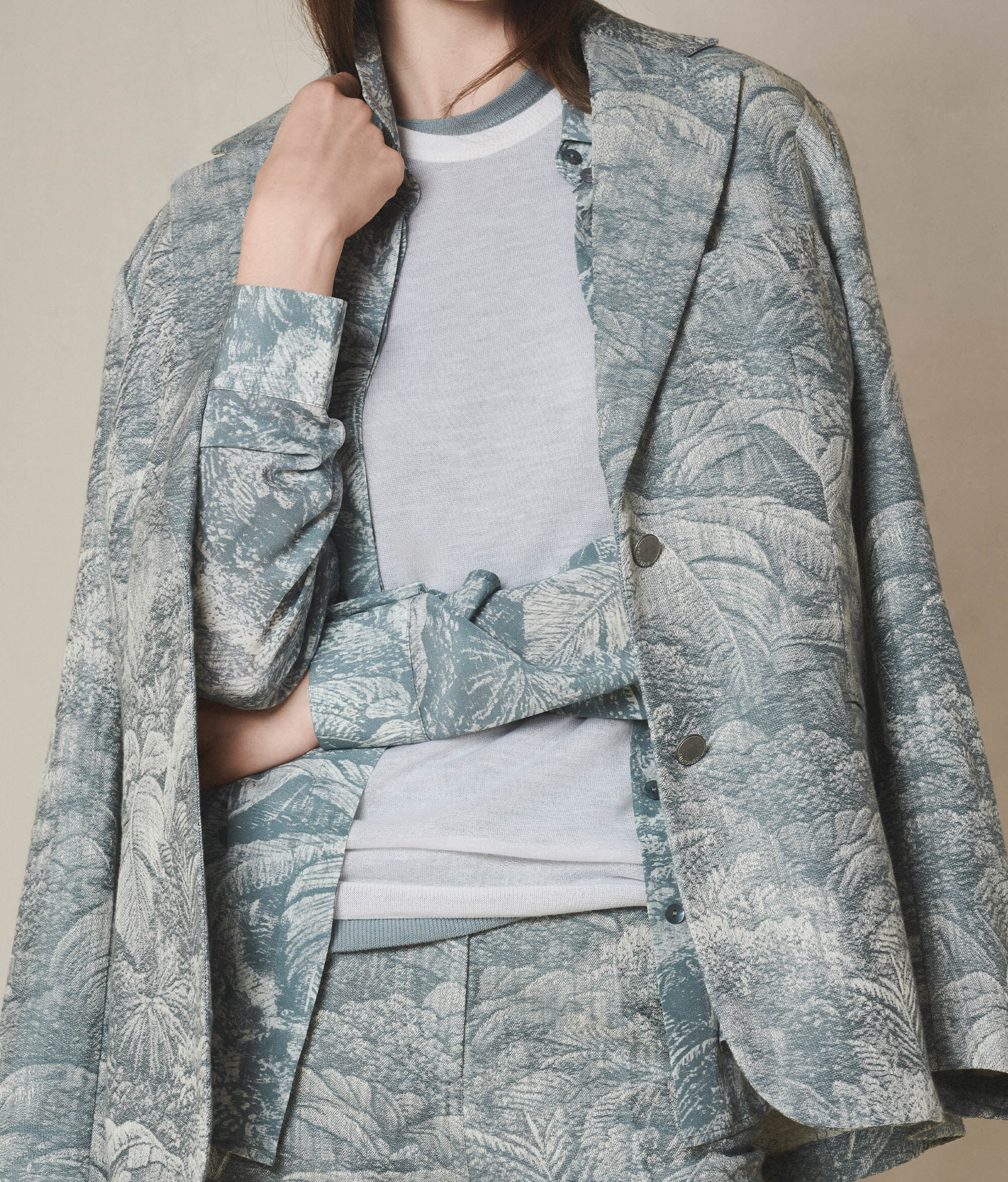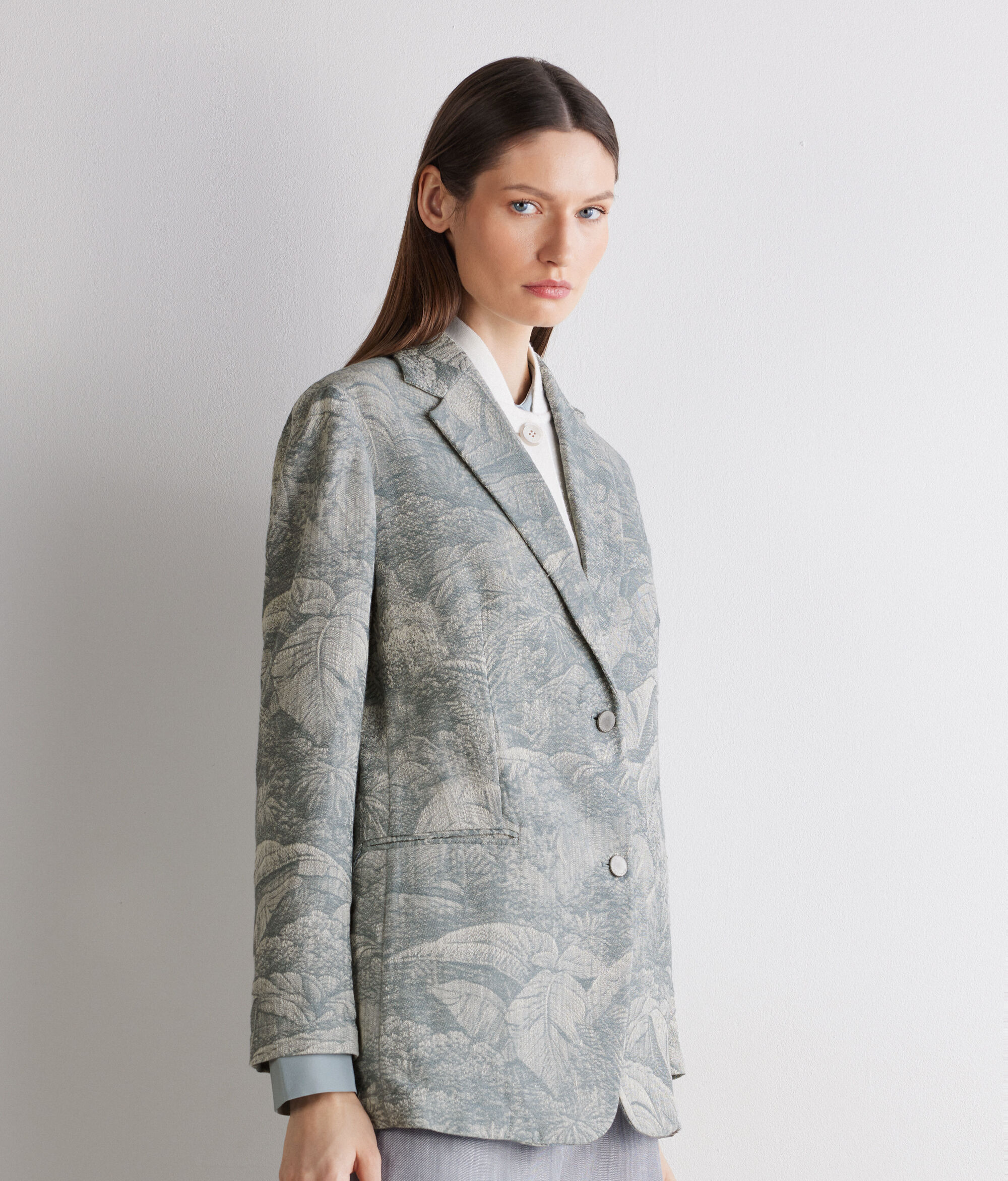 Esta chaqueta de algodón se distingue por su trama rica y sofisticada que, gracias al motivo jacquard realizado directamente en el tejido, crea un elegante efecto tridimensional. La solapa clásica y el cierre de botonadura sencilla con botones metálicos unen elegancia y un toque contemporáneo. Los bolsillos de doble ojal y el bolsillo de pecho completan esta prenda de corte relajado y confortable.