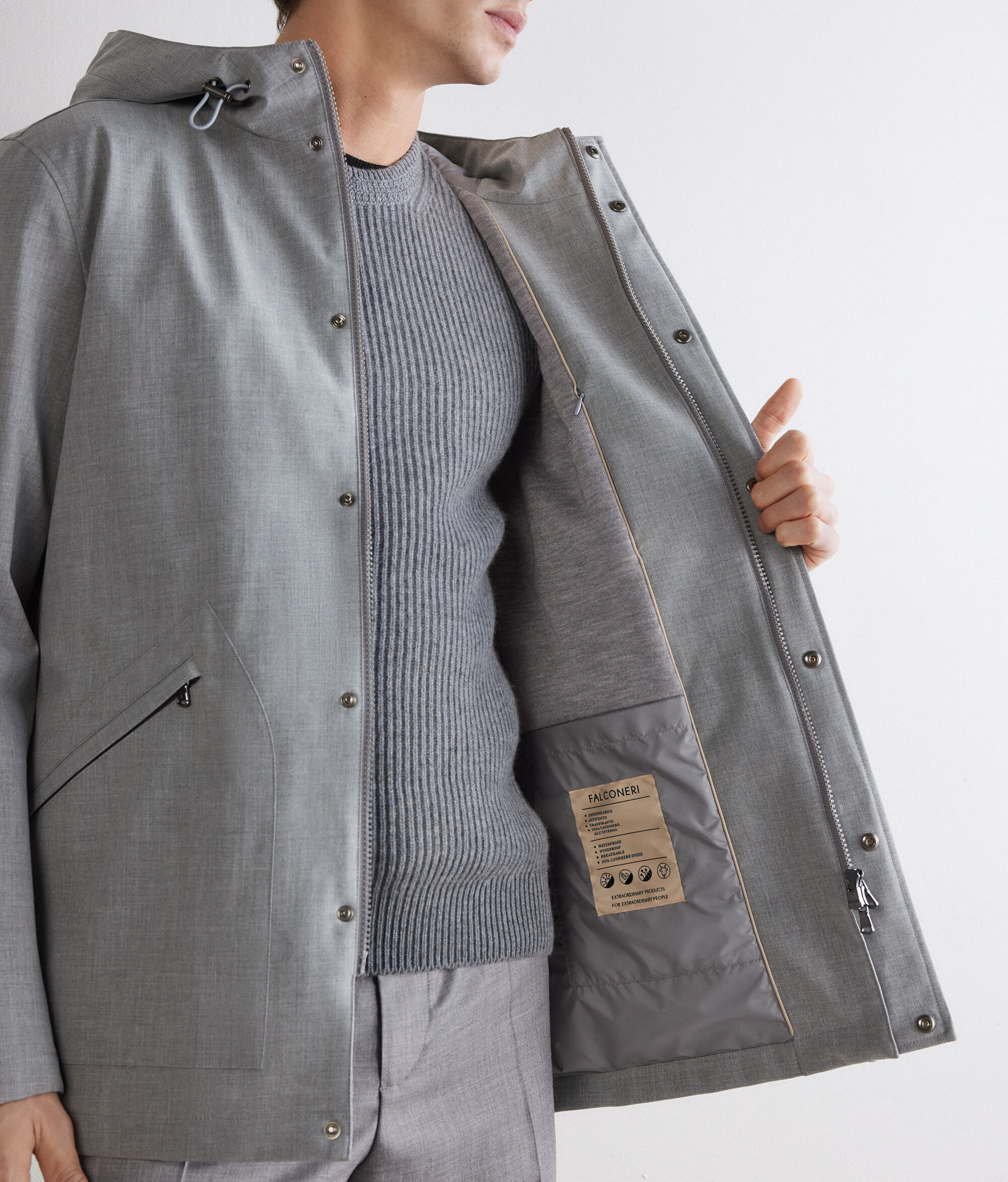• Forro interior de cashmere ultrafine en la parte superior y de tejido técnico en la parte inferior y en las mangas